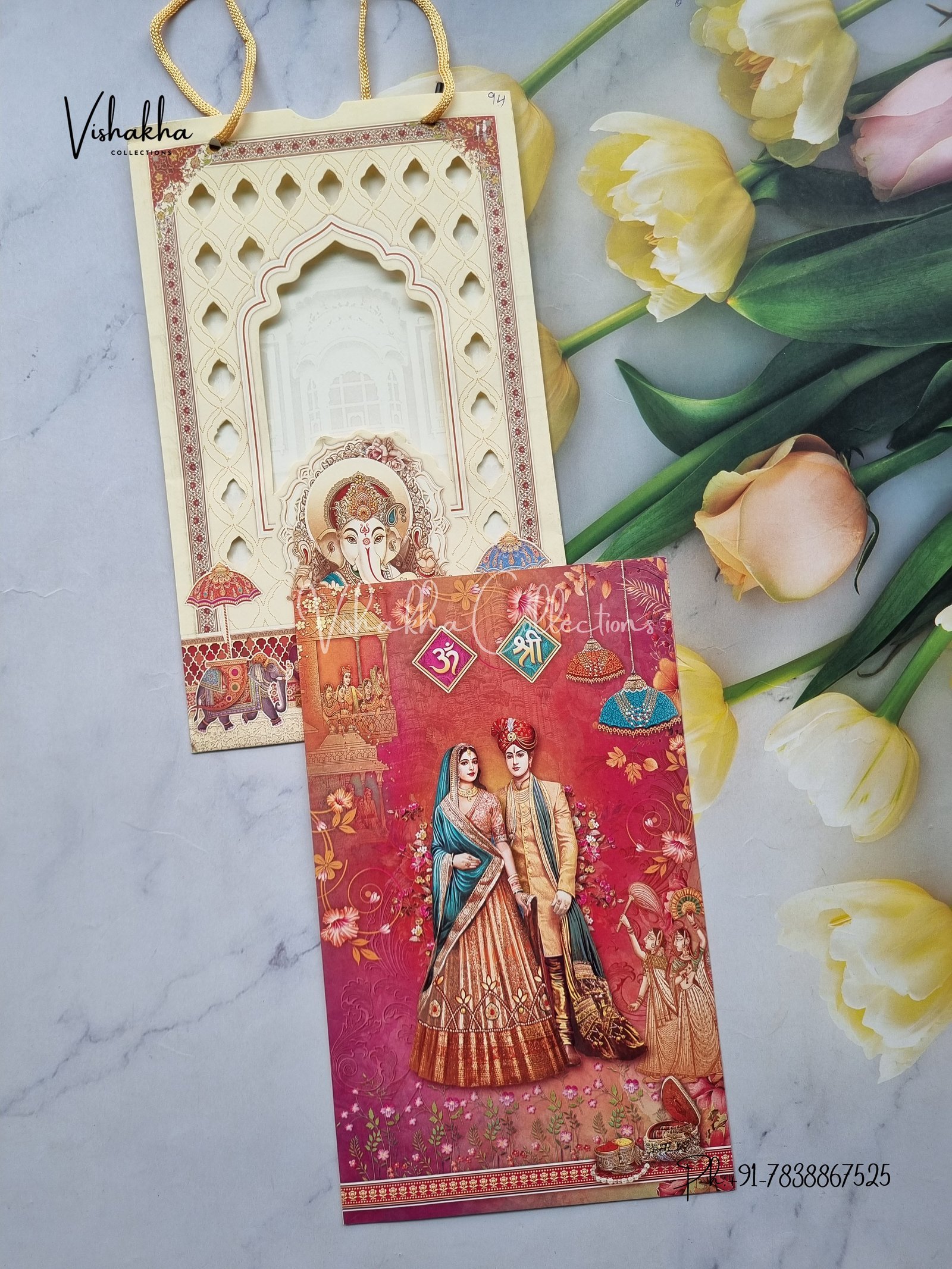 Vishakha Collections presents you beautiful luxury wedding invitation cards with all latest designs and the latest variety. Its just not a wedding invitation card but a beautiful feeling of love and relationship it carries for you. Beautifully printed and packed with a bundle of love. if you like it, dont think again, just go for it.If you are worrying about the quality of the product, send your doubts to us. We are here to help you. If you want in wholesale or bulk, dont forget to contact us.