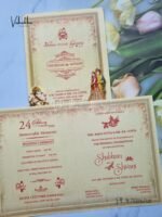 Vishakha Collections presents you beautiful luxury wedding invitation cards with all latest designs and the latest variety. Its just not a wedding invitation card but a beautiful feeling of love and relationship it carries for you. Beautifully printed and packed with a bundle of love. if you like it, dont think again, just go for it.If you are worrying about the quality of the product, send your doubts to us. We are here to help you. If you want in wholesale or bulk, dont forget to contact us.