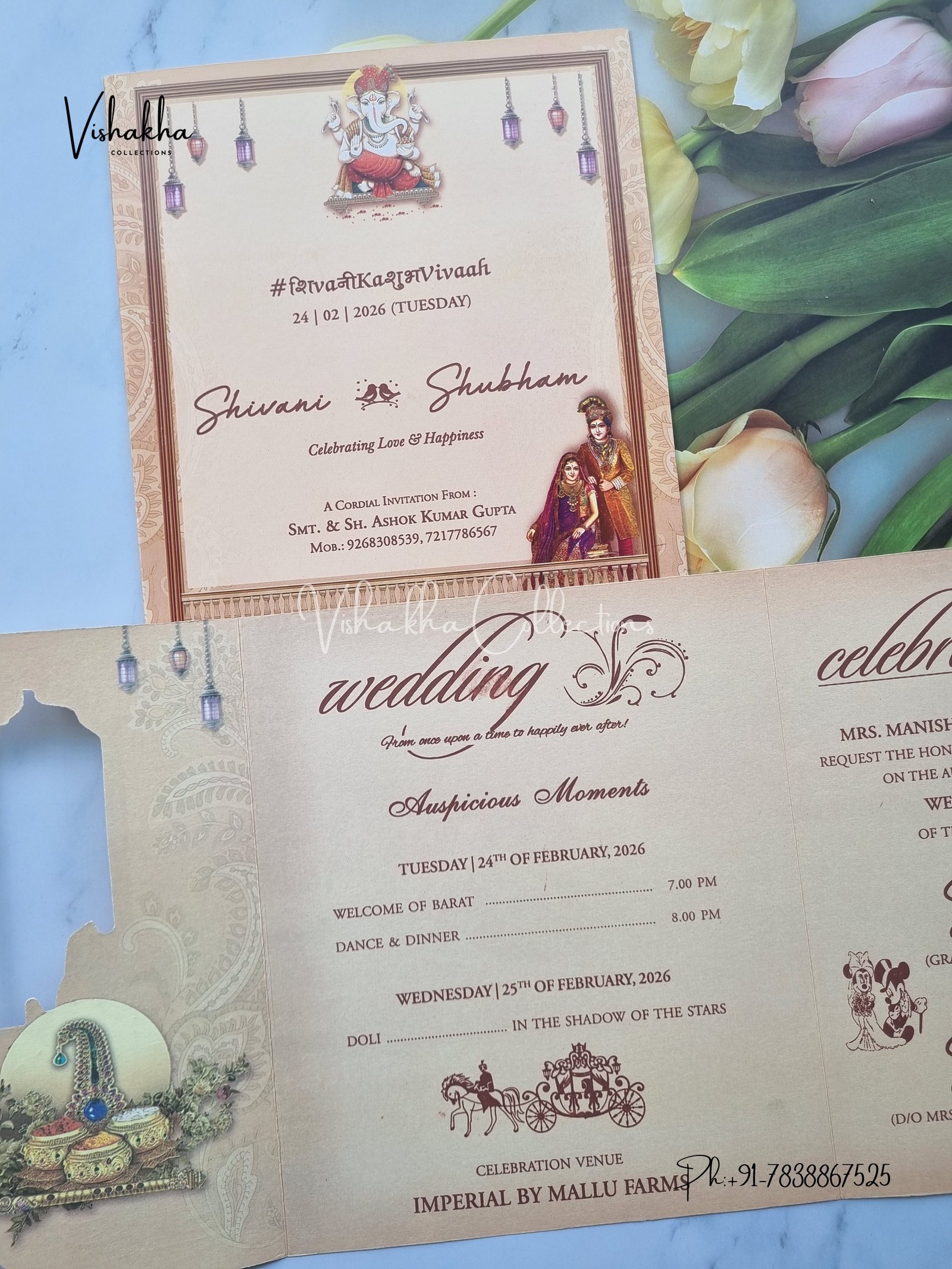 Vishakha Collections presents you beautiful luxury wedding invitation cards with all latest designs and the latest variety. Its just not a wedding invitation card but a beautiful feeling of love and relationship it carries for you. Beautifully printed and packed with a bundle of love. if you like it, dont think again, just go for it.If you are worrying about the quality of the product, send your doubts to us. We are here to help you. If you want in wholesale or bulk, dont forget to contact us.