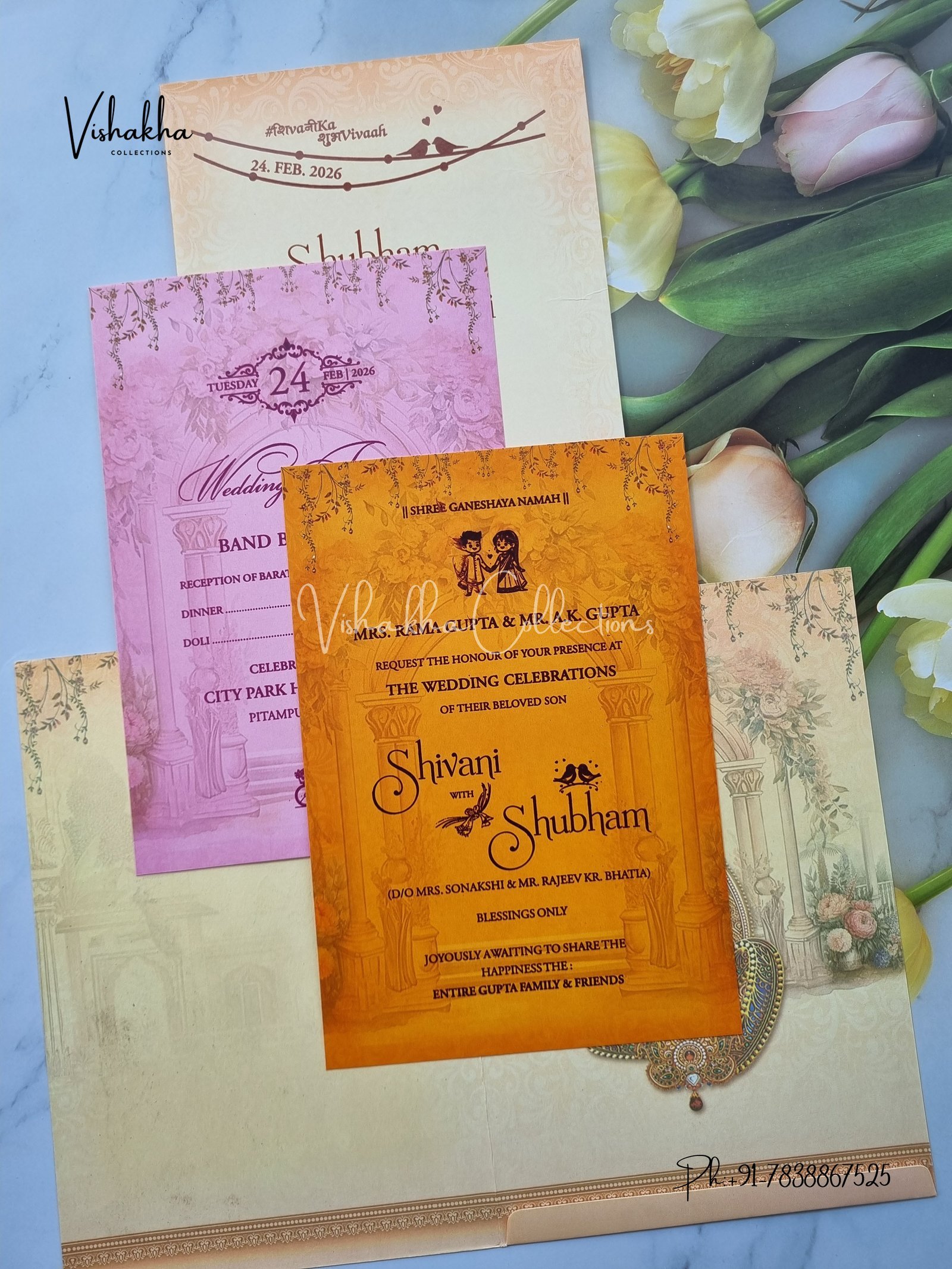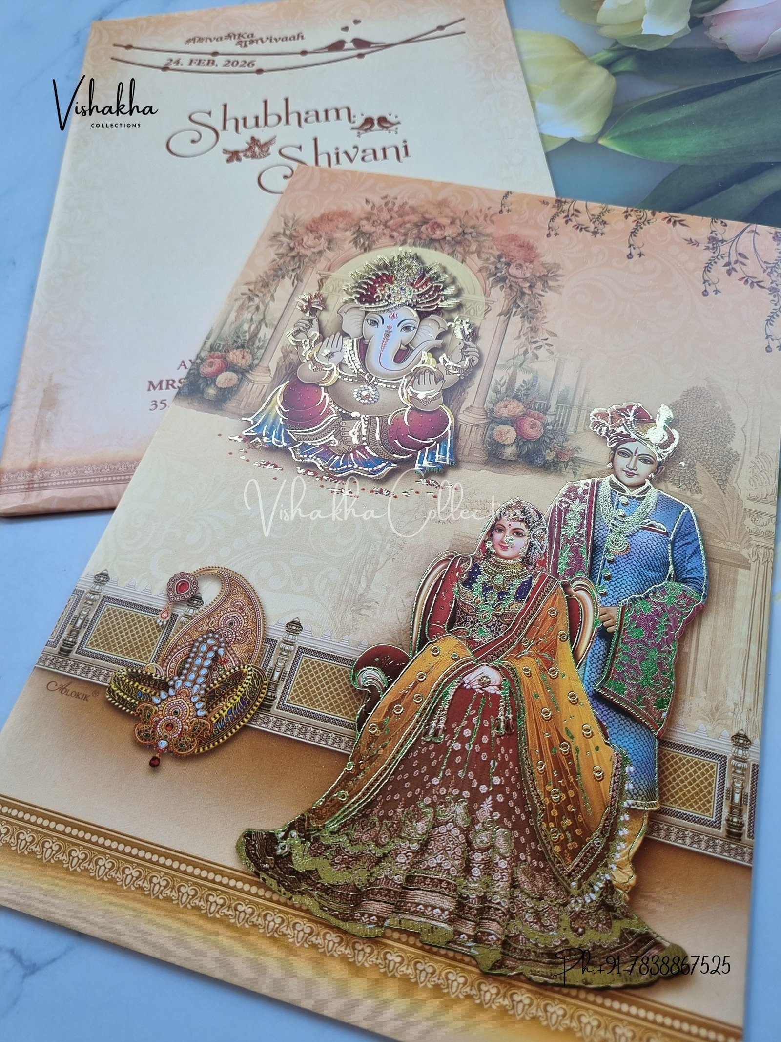Vishakha Collections presents you beautiful luxury wedding invitation cards with all latest designs and the latest variety. Its just not a wedding invitation card but a beautiful feeling of love and relationship it carries for you. Beautifully printed and packed with a bundle of love. if you like it, dont think again, just go for it.If you are worrying about the quality of the product, send your doubts to us. We are here to help you. If you want in wholesale or bulk, dont forget to contact us.