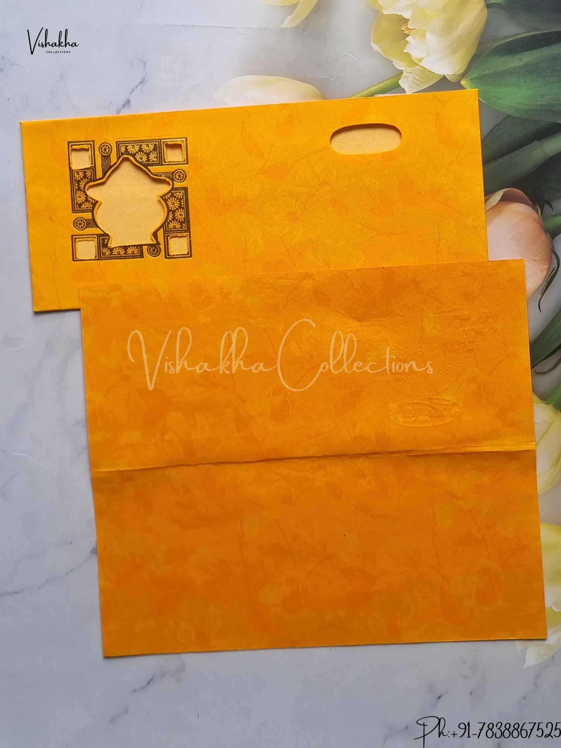 Vishakha Collections presents you beautiful luxury wedding invitation cards with all latest designs and the latest variety. Its just not a wedding invitation card but a beautiful feeling of love and relationship it carries for you. Beautifully printed and packed with a bundle of love. if you like it, dont think again, just go for it.If you are worrying about the quality of the product, send your doubts to us. We are here to help you. If you want in wholesale or bulk, dont forget to contact us.