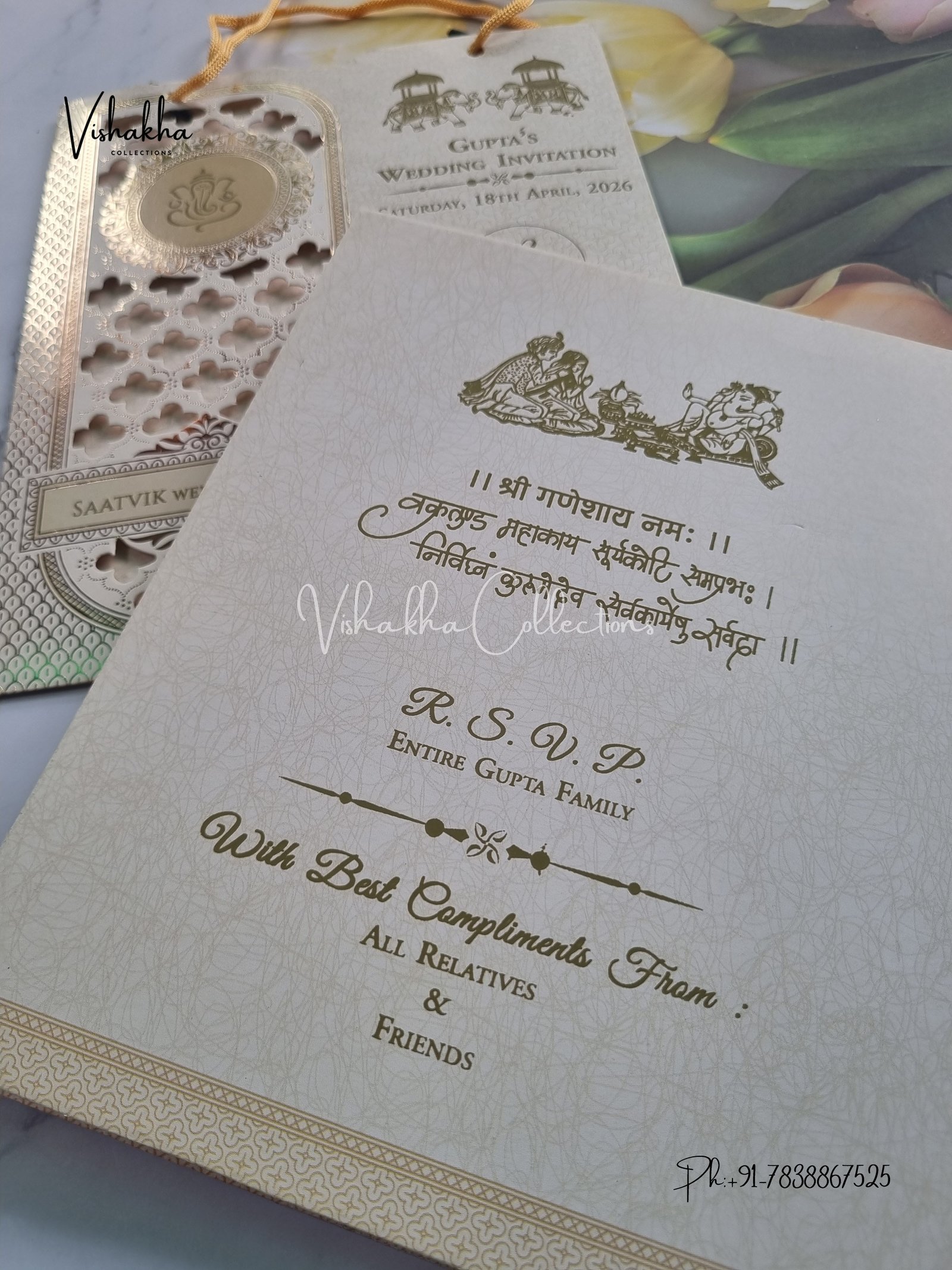 Vishakha Collections presents you beautiful luxury wedding invitation cards with all latest designs and the latest variety. Its just not a wedding invitation card but a beautiful feeling of love and relationship it carries for you. Beautifully printed and packed with a bundle of love. if you like it, dont think again, just go for it.If you are worrying about the quality of the product, send your doubts to us. We are here to help you. If you want in wholesale or bulk, dont forget to contact us.