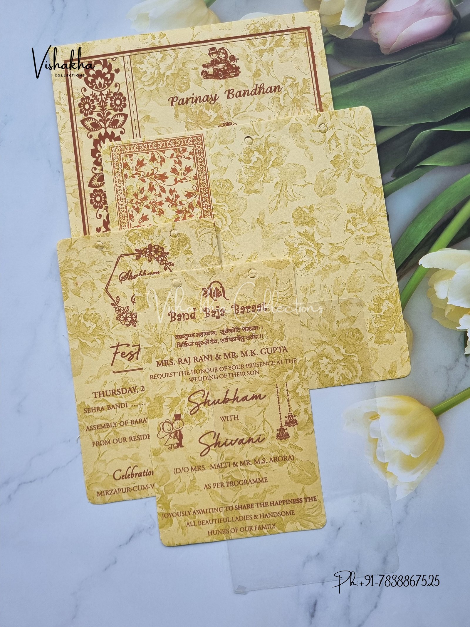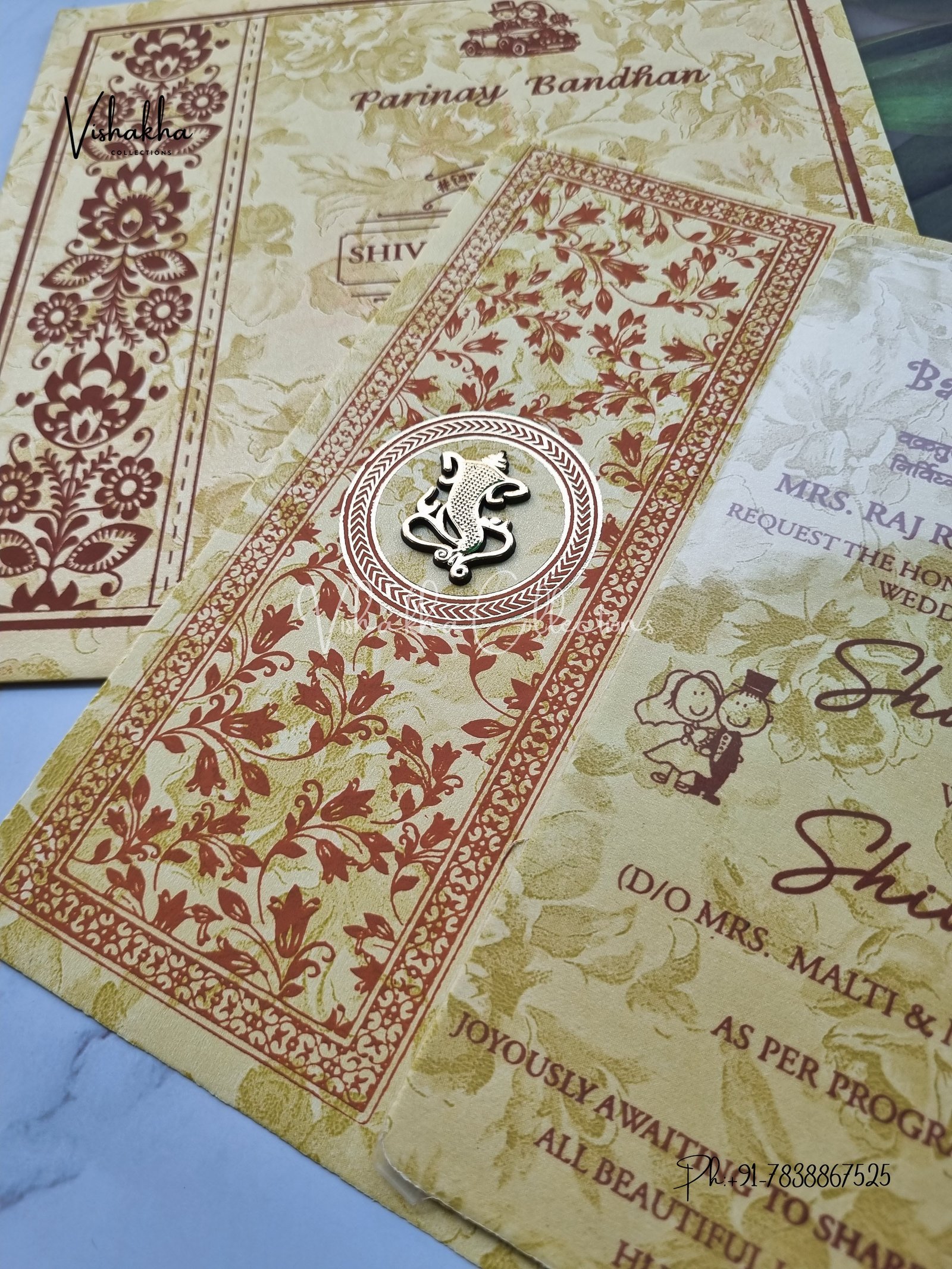 Vishakha Collections presents you beautiful luxury wedding invitation cards with all latest designs and the latest variety. Its just not a wedding invitation card but a beautiful feeling of love and relationship it carries for you. Beautifully printed and packed with a bundle of love. if you like it, dont think again, just go for it.If you are worrying about the quality of the product, send your doubts to us. We are here to help you. If you want in wholesale or bulk, dont forget to contact us.