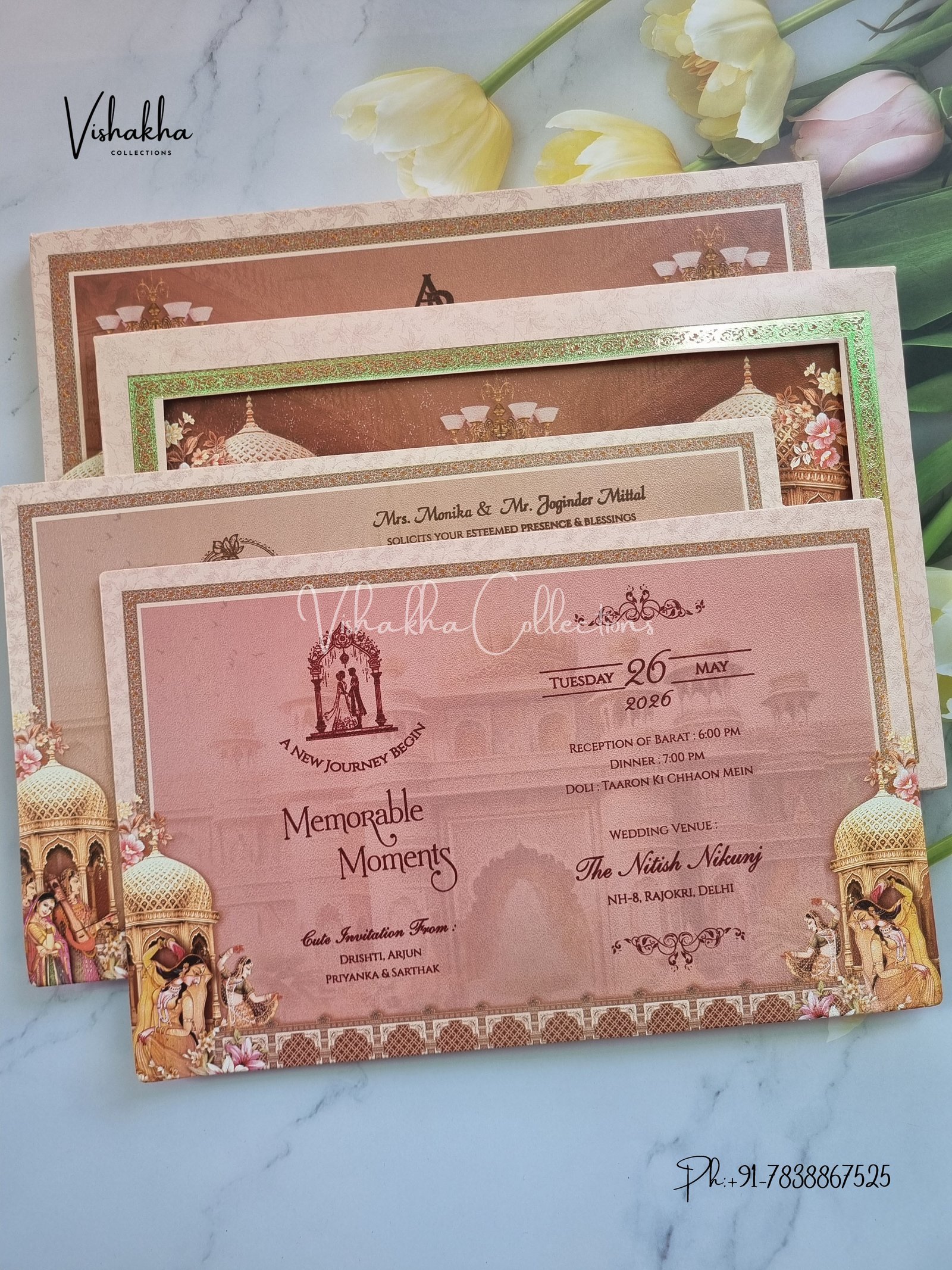 Vishakha Collections presents you beautiful luxury wedding invitation cards with all latest designs and the latest variety. Its just not a wedding invitation card but a beautiful feeling of love and relationship it carries for you. Beautifully printed and packed with a bundle of love. if you like it, dont think again, just go for it.If you are worrying about the quality of the product, send your doubts to us. We are here to help you. If you want in wholesale or bulk, dont forget to contact us.