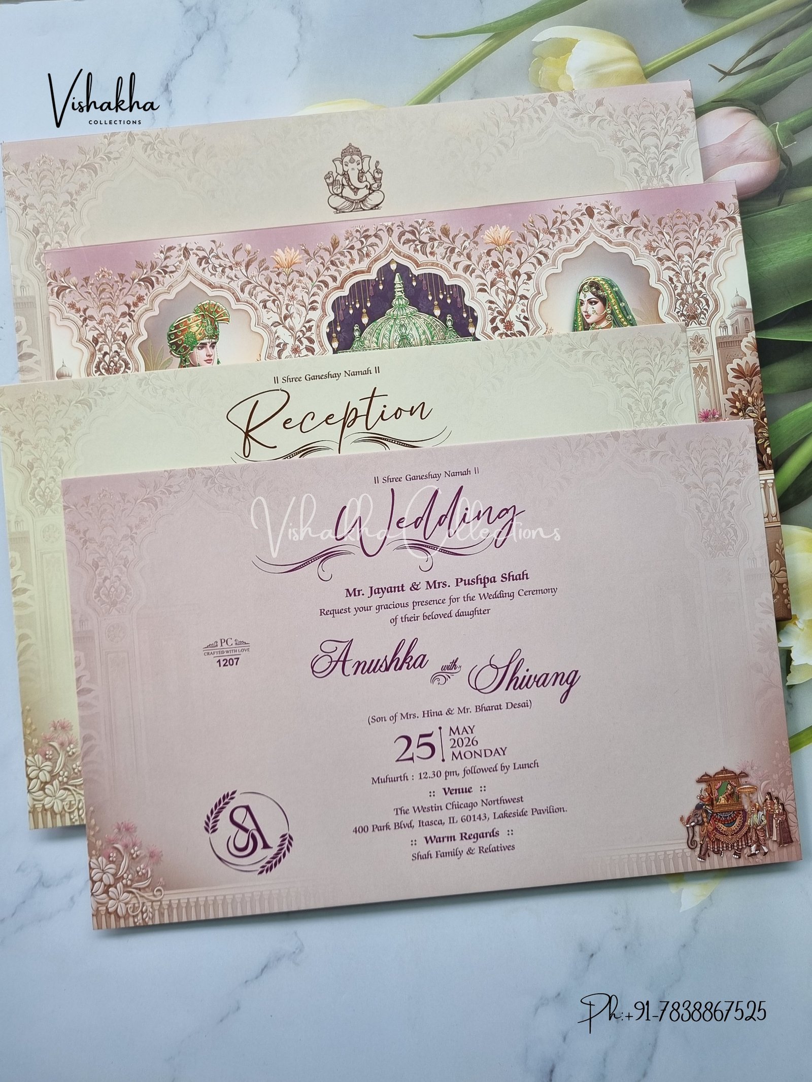 Vishakha Collections presents you beautiful luxury wedding invitation cards with all latest designs and the latest variety. Its just not a wedding invitation card but a beautiful feeling of love and relationship it carries for you. Beautifully printed and packed with a bundle of love. if you like it, dont think again, just go for it.If you are worrying about the quality of the product, send your doubts to us. We are here to help you. If you want in wholesale or bulk, dont forget to contact us.