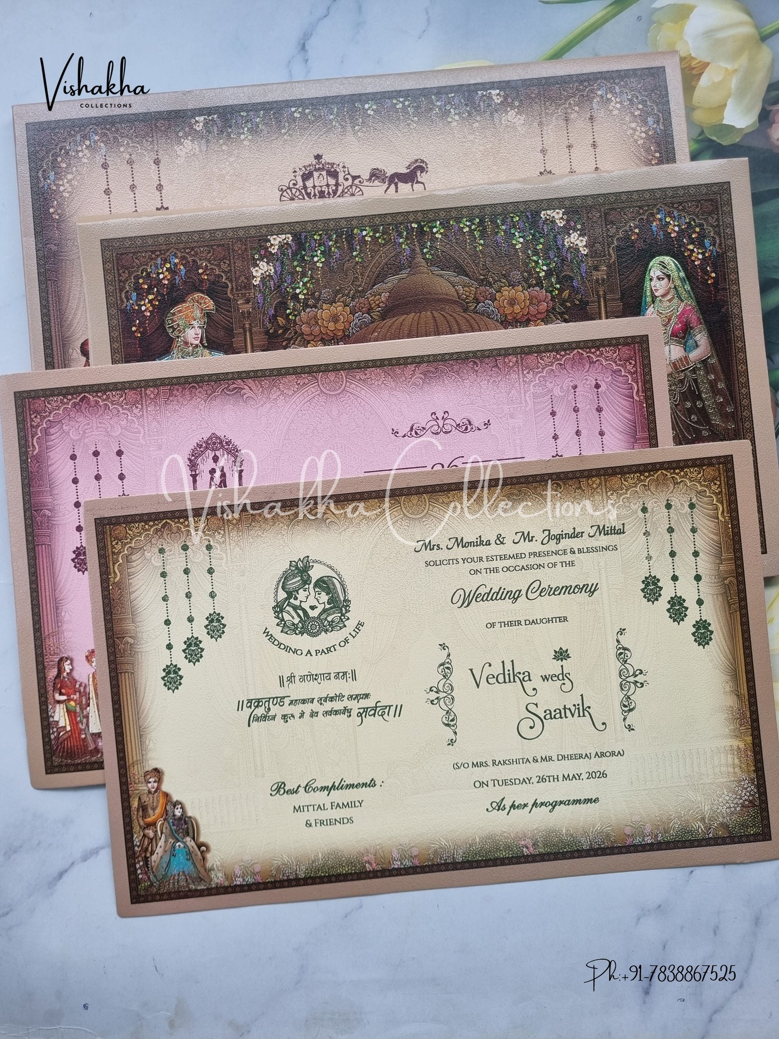 Vishakha Collections presents you beautiful luxury wedding invitation cards with all latest designs and the latest variety. Its just not a wedding invitation card but a beautiful feeling of love and relationship it carries for you. Beautifully printed and packed with a bundle of love. if you like it, dont think again, just go for it.If you are worrying about the quality of the product, send your doubts to us. We are here to help you. If you want in wholesale or bulk, dont forget to contact us.