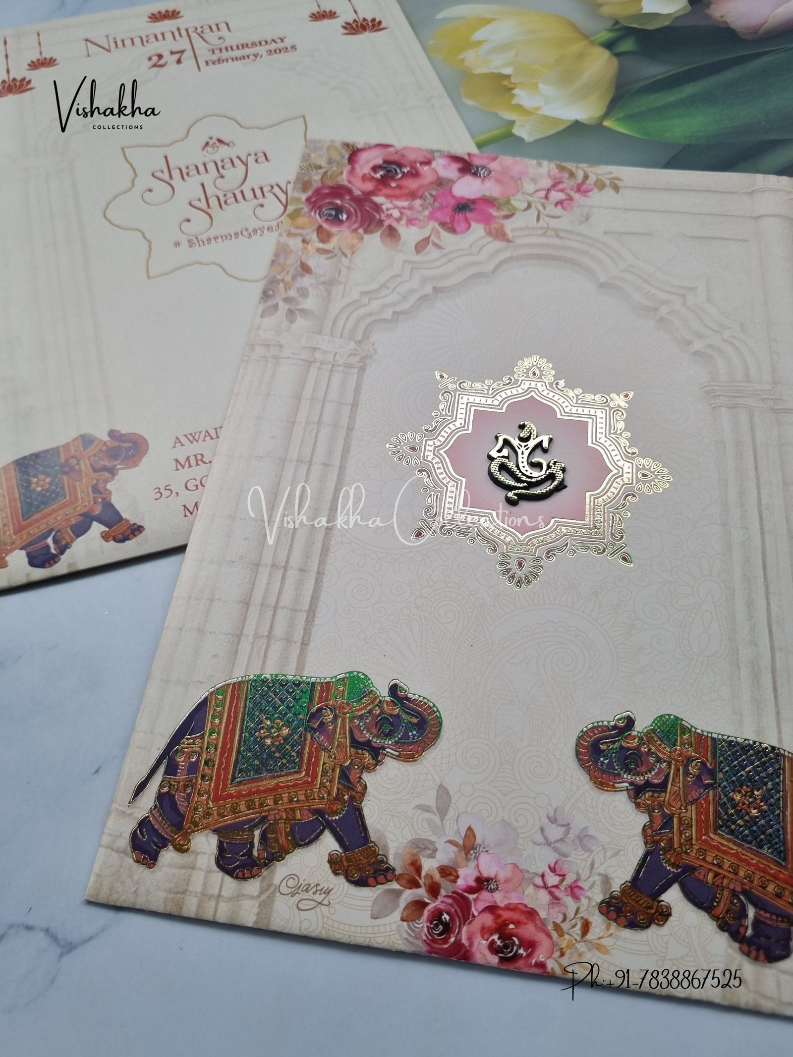 Vishakha Collections presents you beautiful luxury wedding invitation cards with all latest designs and the latest variety. Its just not a wedding invitation card but a beautiful feeling of love and relationship it carries for you. Beautifully printed and packed with a bundle of love. if you like it, dont think again, just go for it.If you are worrying about the quality of the product, send your doubts to us. We are here to help you. If you want in wholesale or bulk, dont forget to contact us.