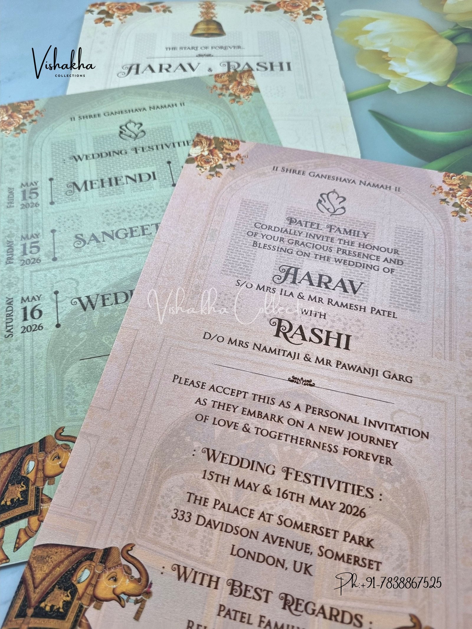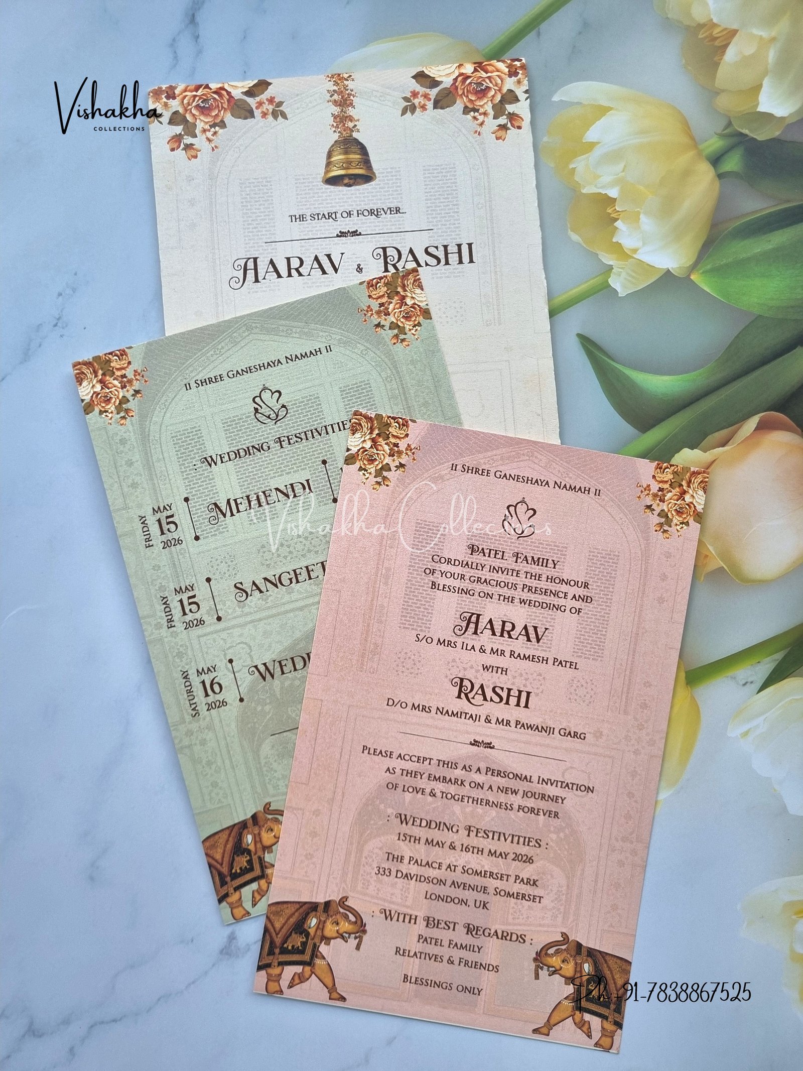 Vishakha Collections presents you beautiful luxury wedding invitation cards with all latest designs and the latest variety. Its just not a wedding invitation card but a beautiful feeling of love and relationship it carries for you. Beautifully printed and packed with a bundle of love. if you like it, dont think again, just go for it.If you are worrying about the quality of the product, send your doubts to us. We are here to help you. If you want in wholesale or bulk, dont forget to contact us.
