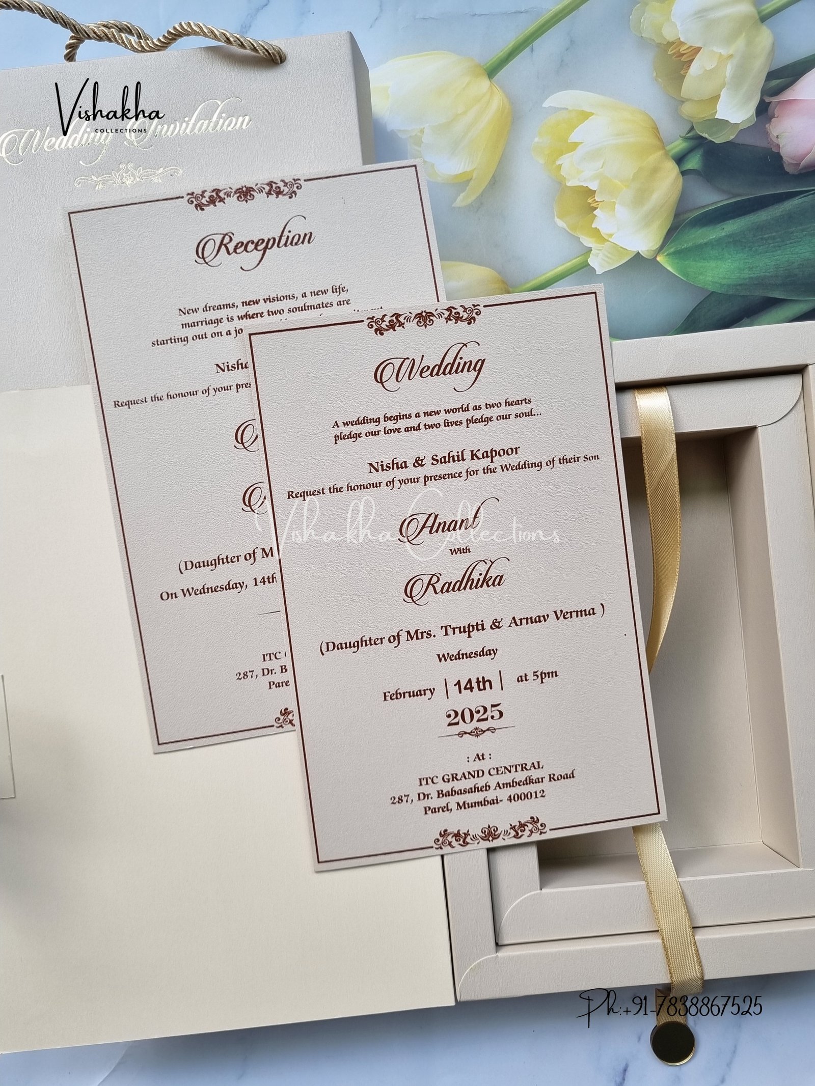 Vishakha Collections presents you beautiful luxury wedding invitation cards with all latest designs and the latest variety. Its just not a wedding invitation card but a beautiful feeling of love and relationship it carries for you. Beautifully printed and packed with a bundle of love. if you like it, dont think again, just go for it.If you are worrying about the quality of the product, send your doubts to us. We are here to help you. If you want in wholesale or bulk, dont forget to contact us.