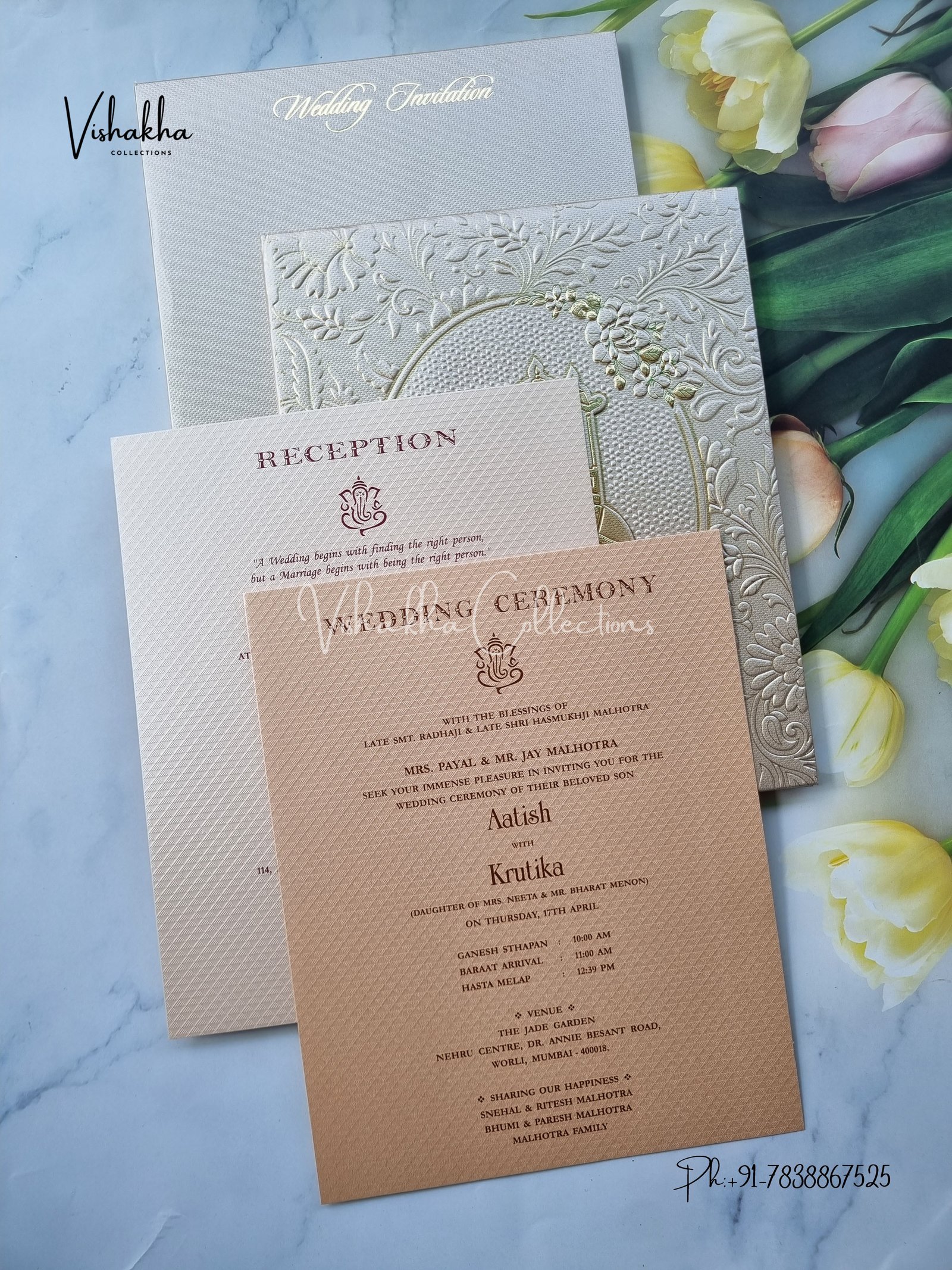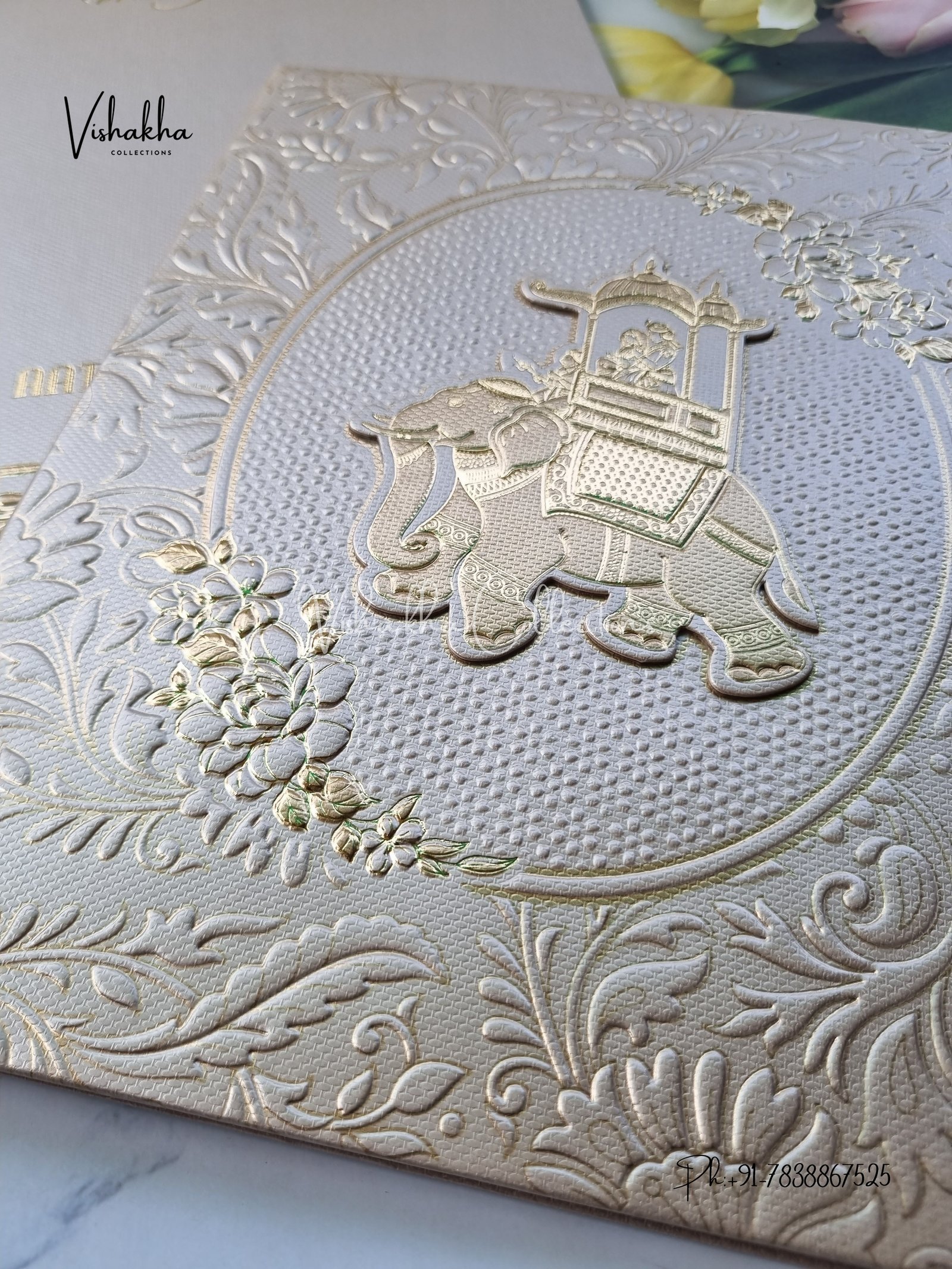 Vishakha Collections presents you beautiful luxury wedding invitation cards with all latest designs and the latest variety. Its just not a wedding invitation card but a beautiful feeling of love and relationship it carries for you. Beautifully printed and packed with a bundle of love. if you like it, dont think again, just go for it.If you are worrying about the quality of the product, send your doubts to us. We are here to help you. If you want in wholesale or bulk, dont forget to contact us.