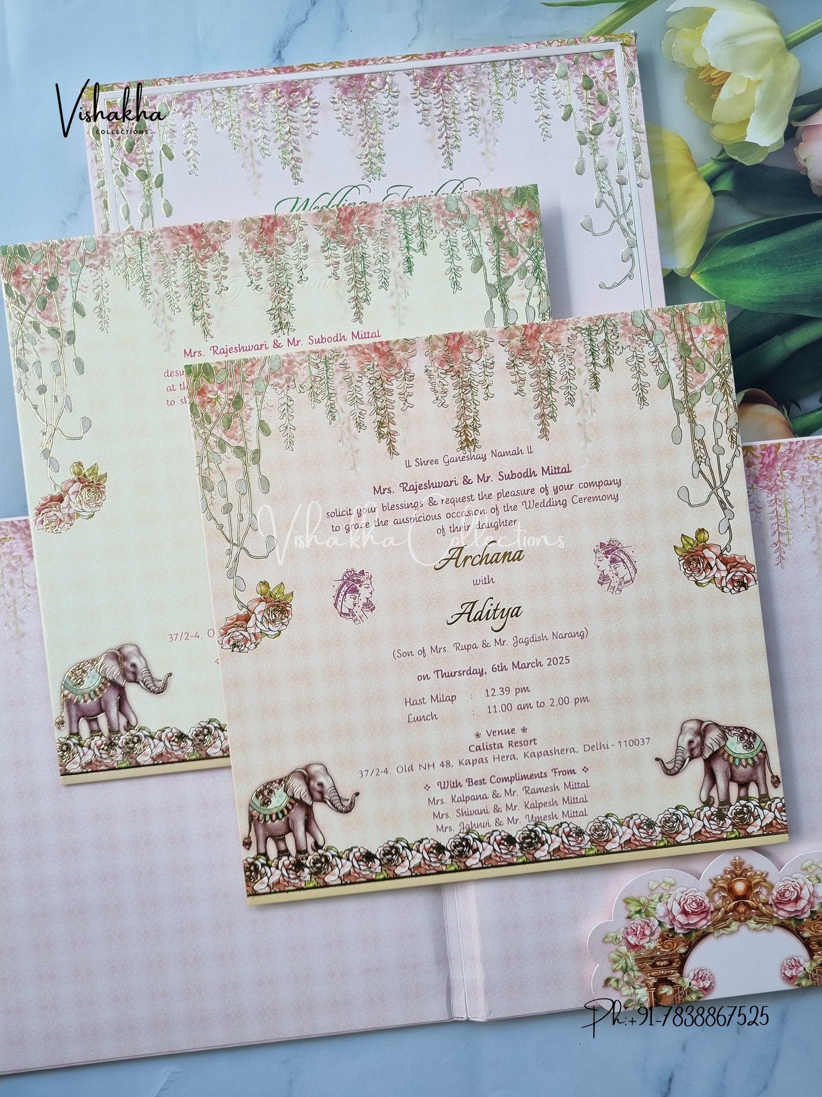 Vishakha Collections presents you beautiful luxury wedding invitation cards with all latest designs and the latest variety. Its just not a wedding invitation card but a beautiful feeling of love and relationship it carries for you. Beautifully printed and packed with a bundle of love. if you like it, dont think again, just go for it.If you are worrying about the quality of the product, send your doubts to us. We are here to help you. If you want in wholesale or bulk, dont forget to contact us.