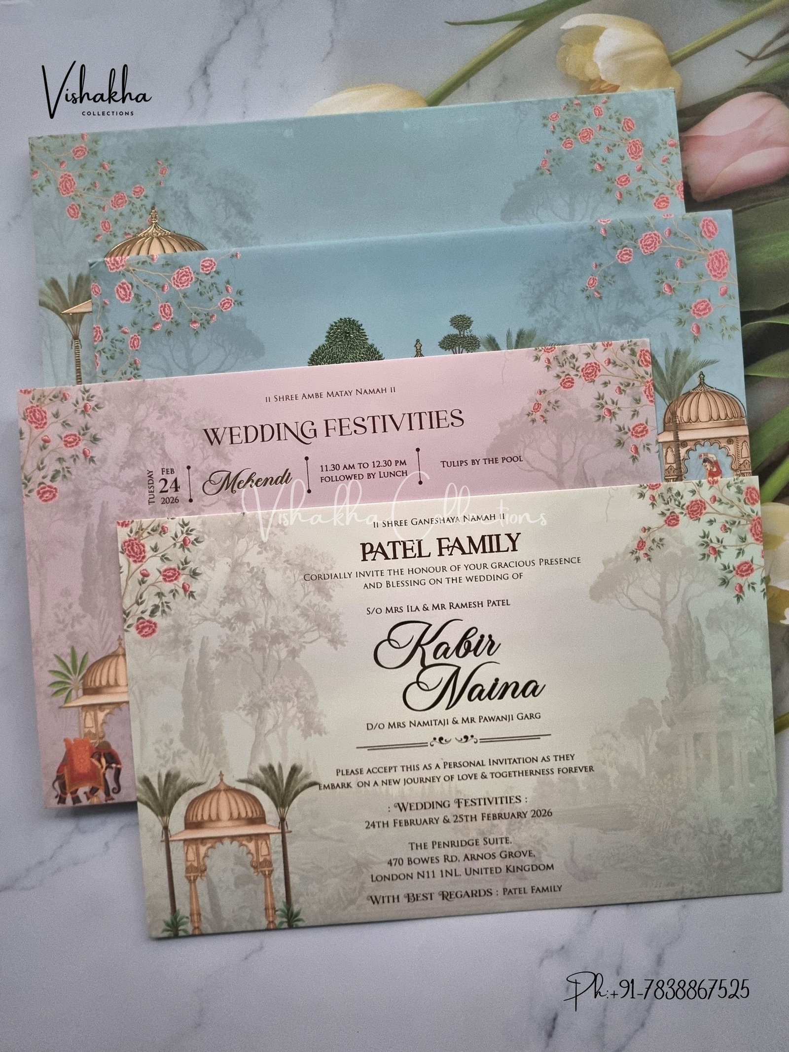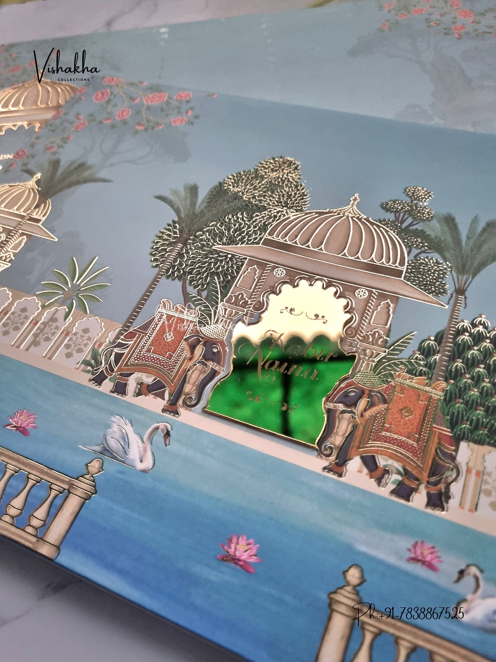 Vishakha Collections presents you beautiful luxury wedding invitation cards with all latest designs and the latest variety. Its just not a wedding invitation card but a beautiful feeling of love and relationship it carries for you. Beautifully printed and packed with a bundle of love. if you like it, dont think again, just go for it.If you are worrying about the quality of the product, send your doubts to us. We are here to help you. If you want in wholesale or bulk, dont forget to contact us.