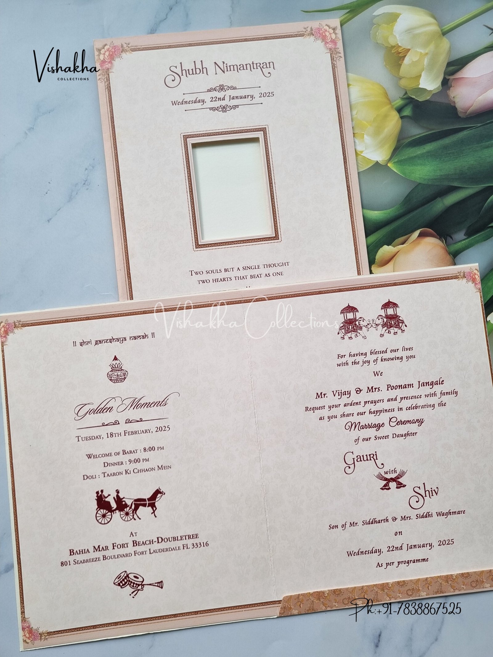 Vishakha Collections presents you beautiful luxury wedding invitation cards with all latest designs and the latest variety. Its just not a wedding invitation card but a beautiful feeling of love and relationship it carries for you. Beautifully printed and packed with a bundle of love. if you like it, dont think again, just go for it.If you are worrying about the quality of the product, send your doubts to us. We are here to help you. If you want in wholesale or bulk, dont forget to contact us.