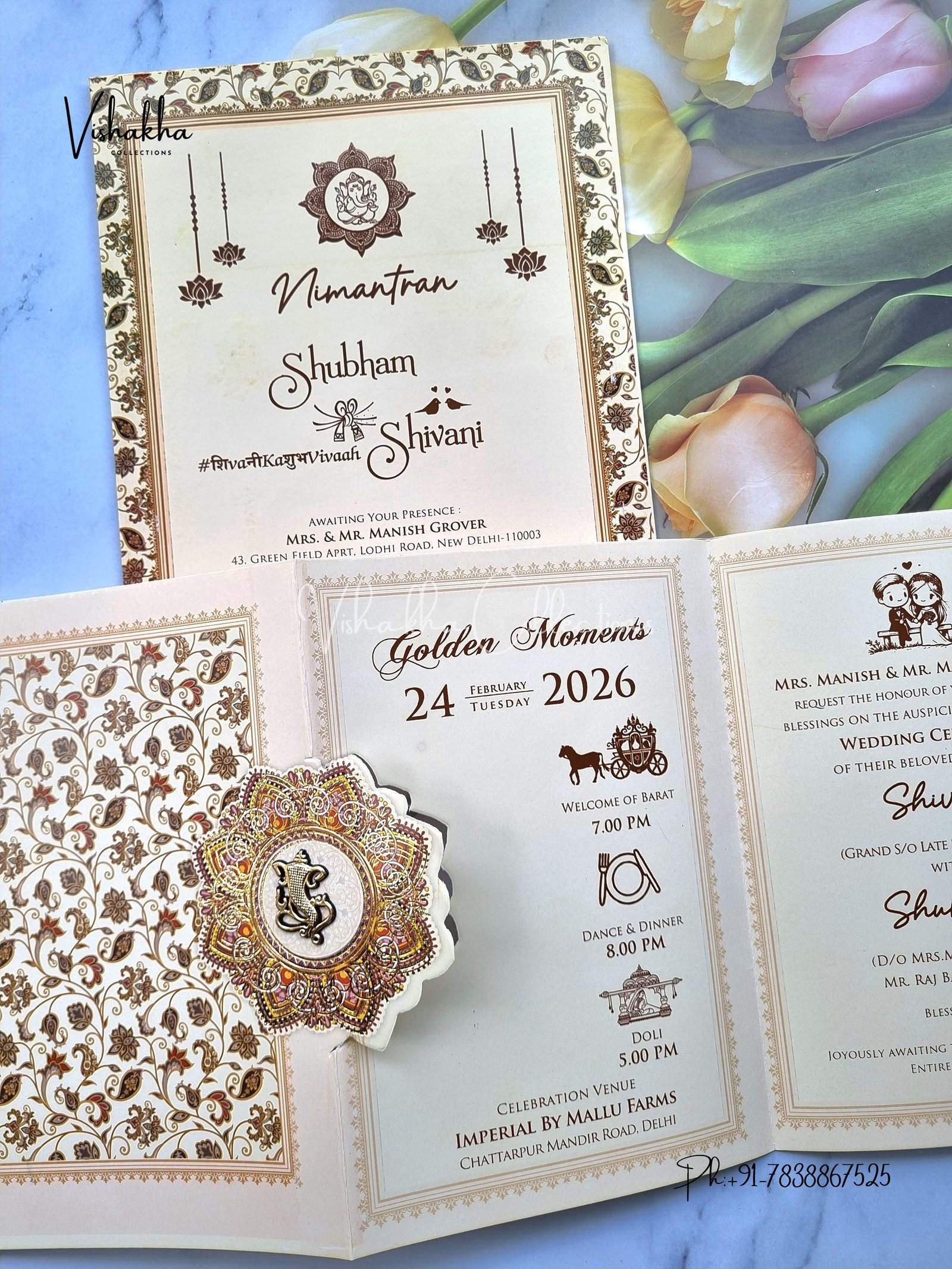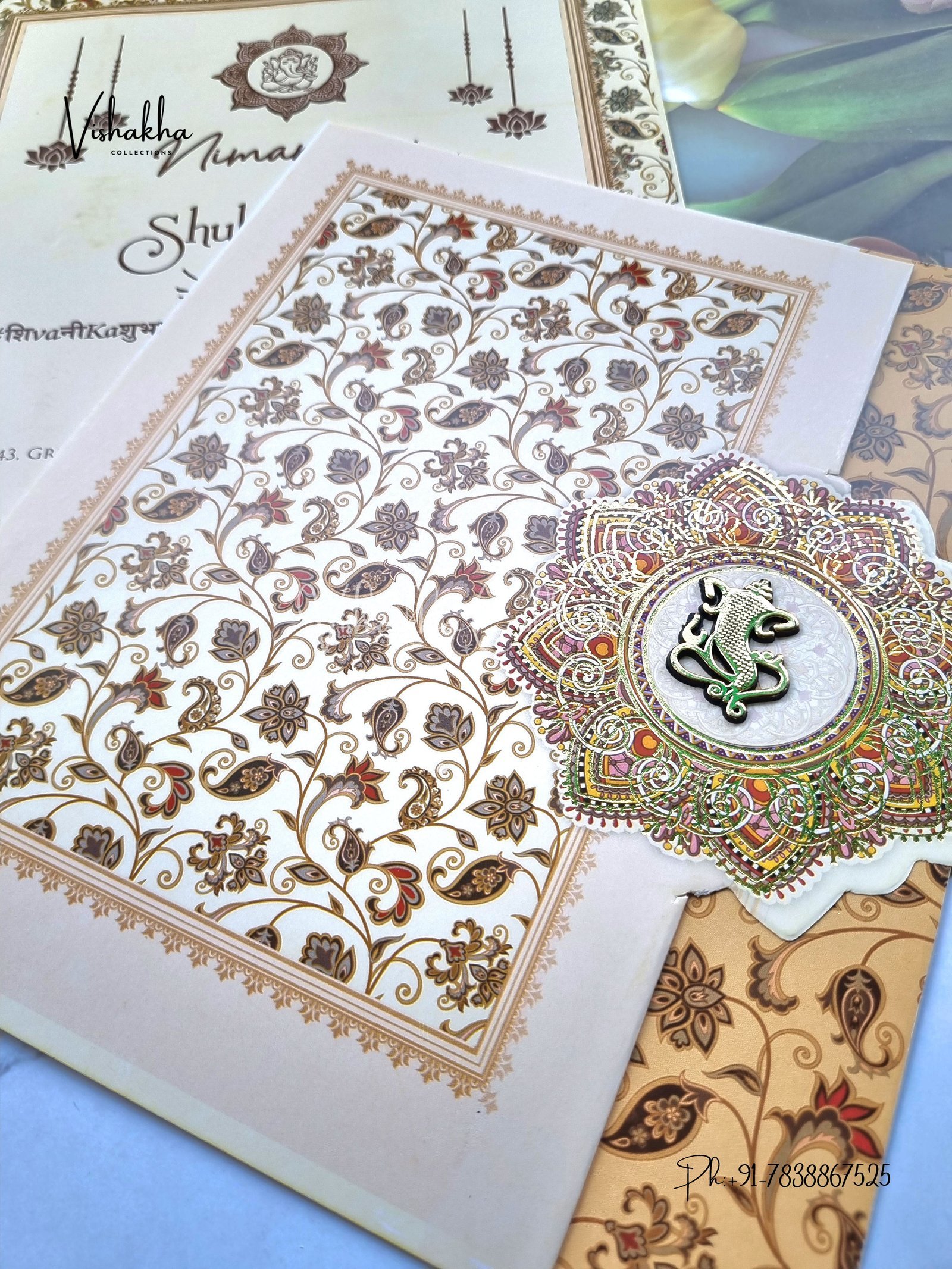 Vishakha Collections presents you beautiful luxury wedding invitation cards with all latest designs and the latest variety. Its just not a wedding invitation card but a beautiful feeling of love and relationship it carries for you. Beautifully printed and packed with a bundle of love. if you like it, dont think again, just go for it.If you are worrying about the quality of the product, send your doubts to us. We are here to help you. If you want in wholesale or bulk, dont forget to contact us.