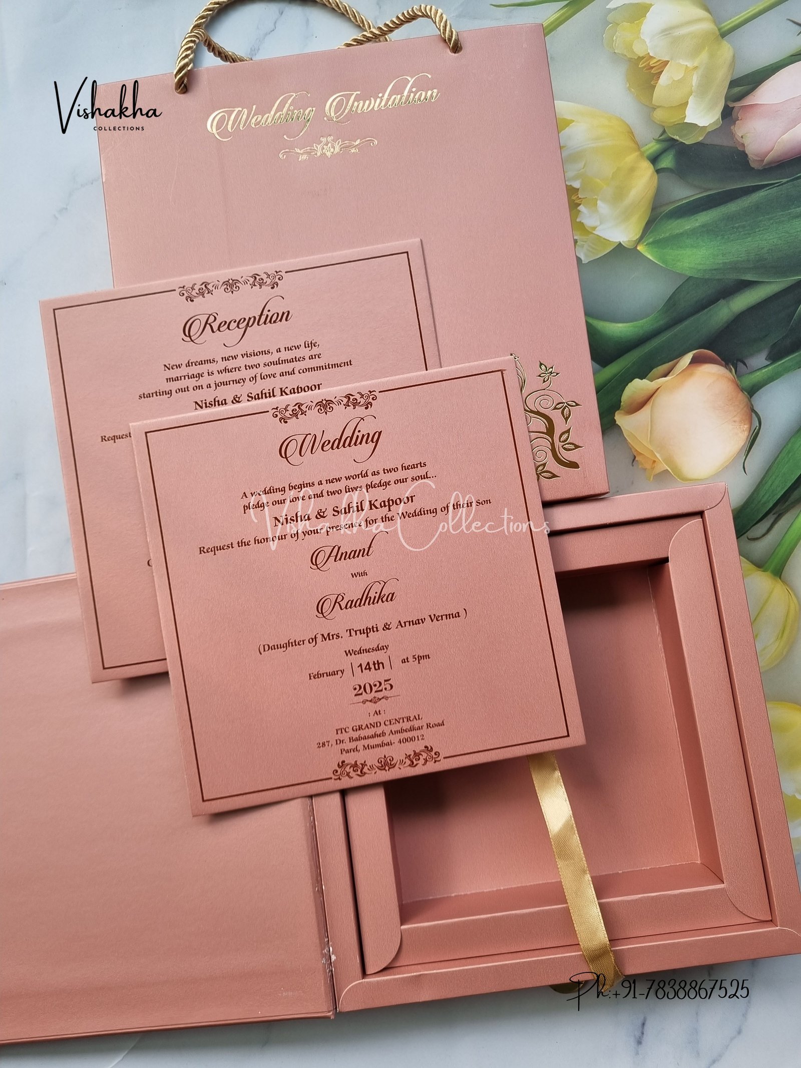 Vishakha Collections presents you beautiful luxury wedding invitation cards with all latest designs and the latest variety. Its just not a wedding invitation card but a beautiful feeling of love and relationship it carries for you. Beautifully printed and packed with a bundle of love. if you like it, dont think again, just go for it.If you are worrying about the quality of the product, send your doubts to us. We are here to help you. If you want in wholesale or bulk, dont forget to contact us.