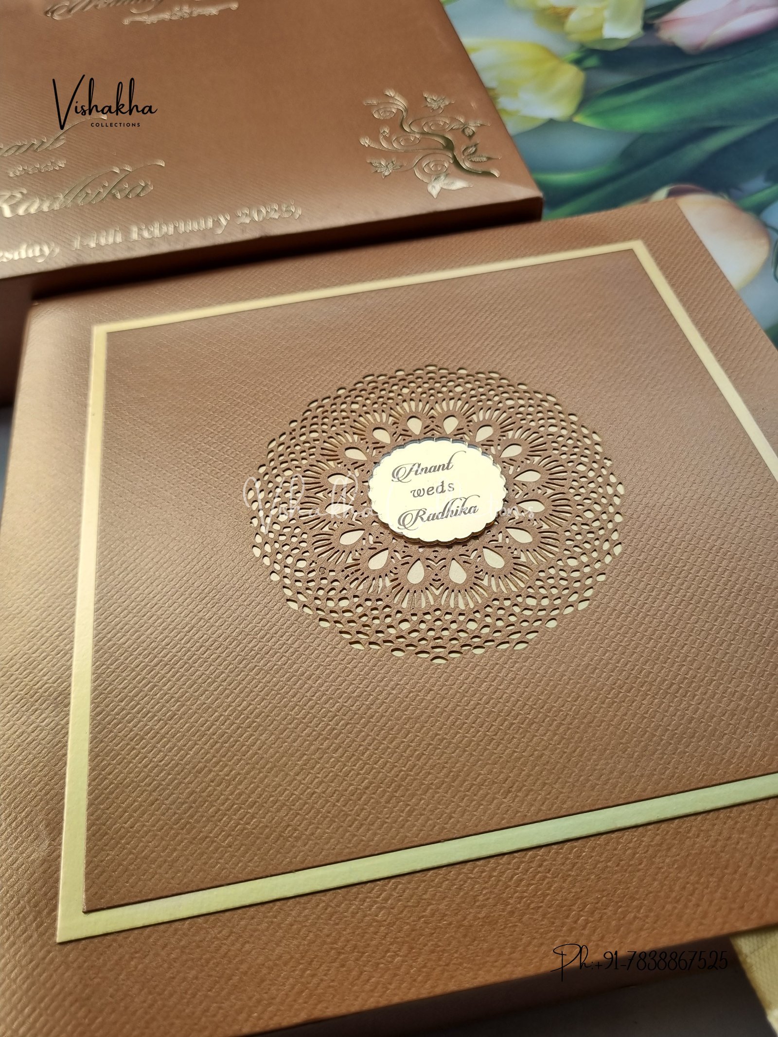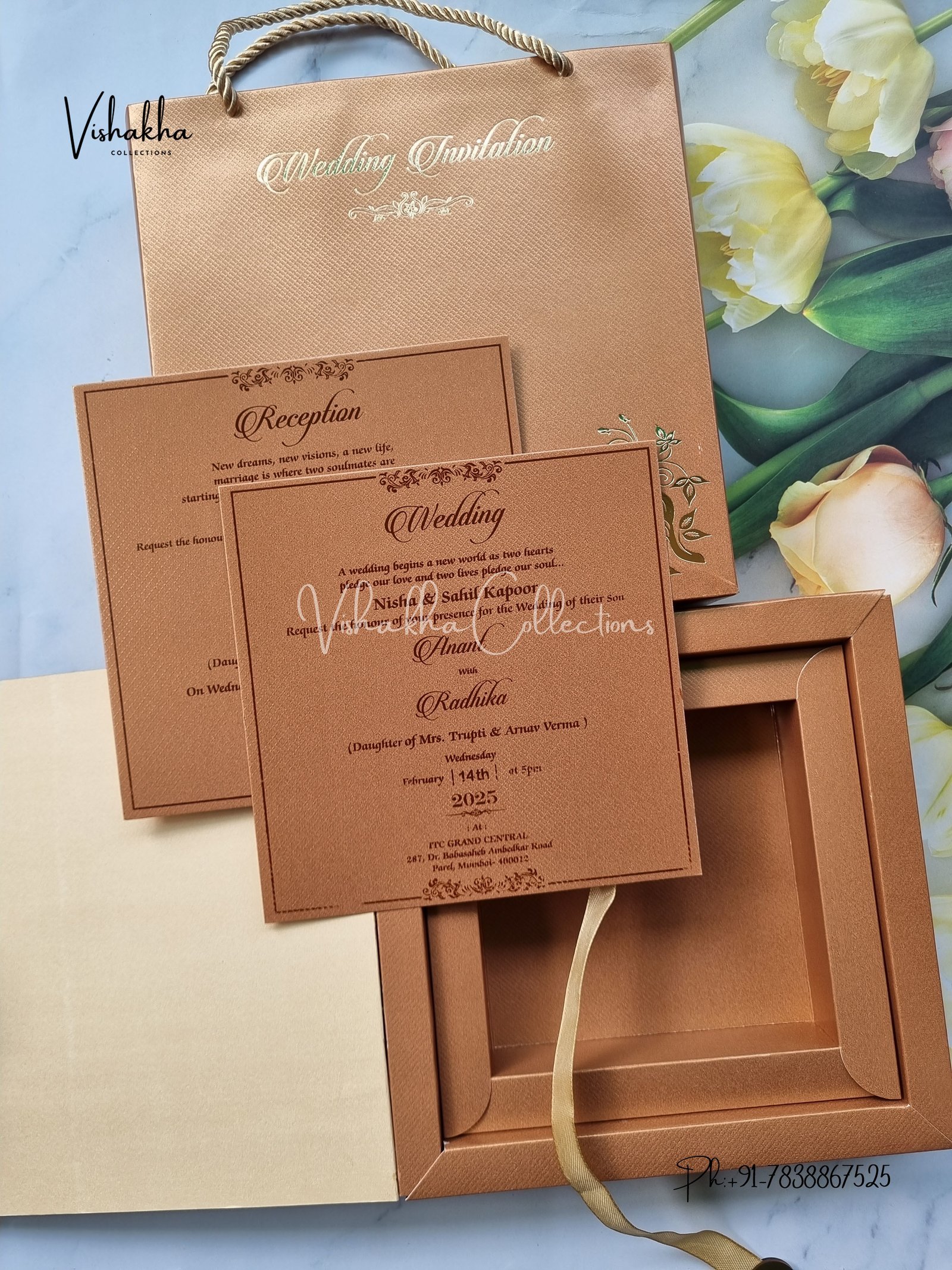 Vishakha Collections presents you beautiful luxury wedding invitation cards with all latest designs and the latest variety. Its just not a wedding invitation card but a beautiful feeling of love and relationship it carries for you. Beautifully printed and packed with a bundle of love. if you like it, dont think again, just go for it.If you are worrying about the quality of the product, send your doubts to us. We are here to help you. If you want in wholesale or bulk, dont forget to contact us.