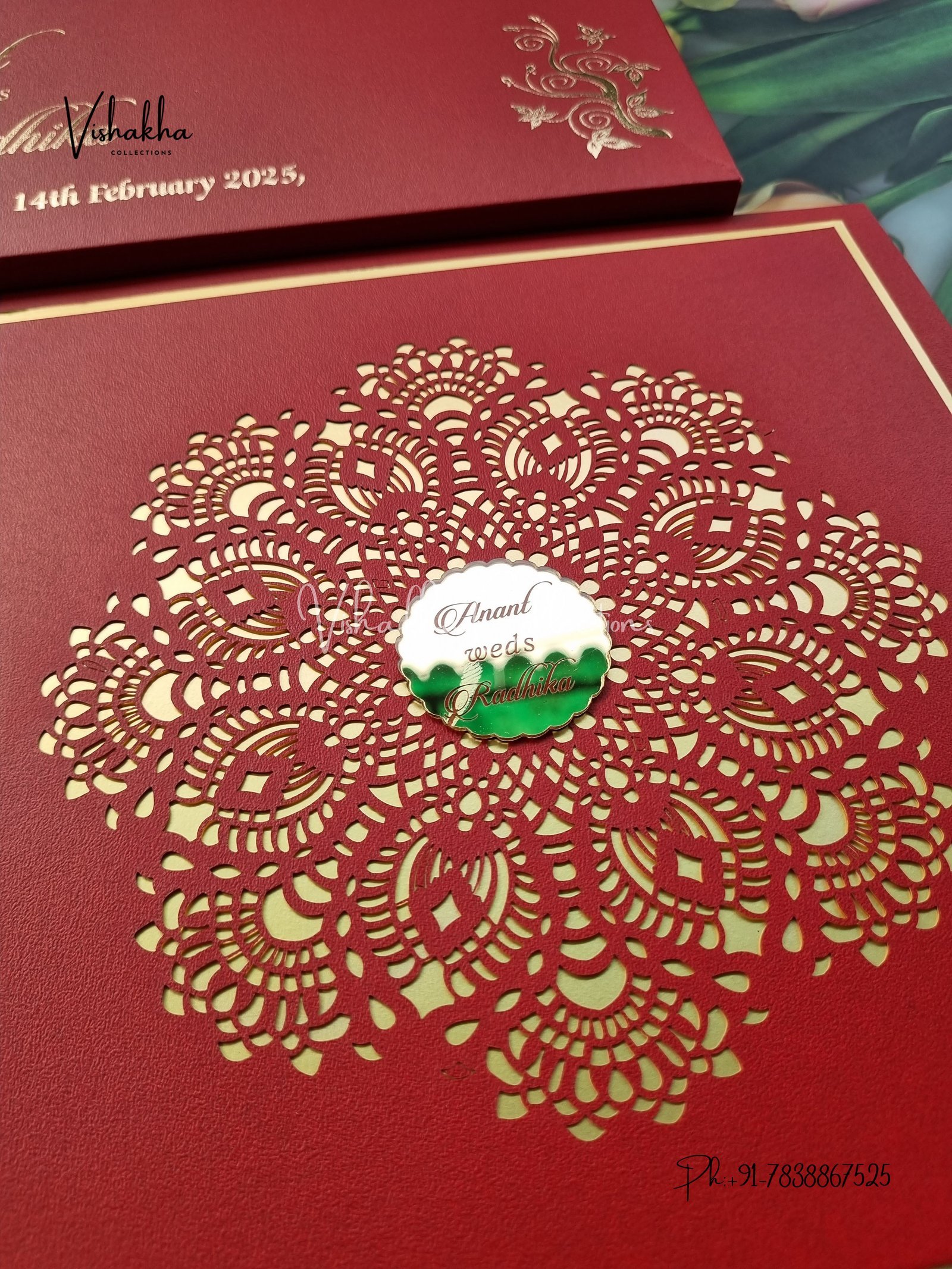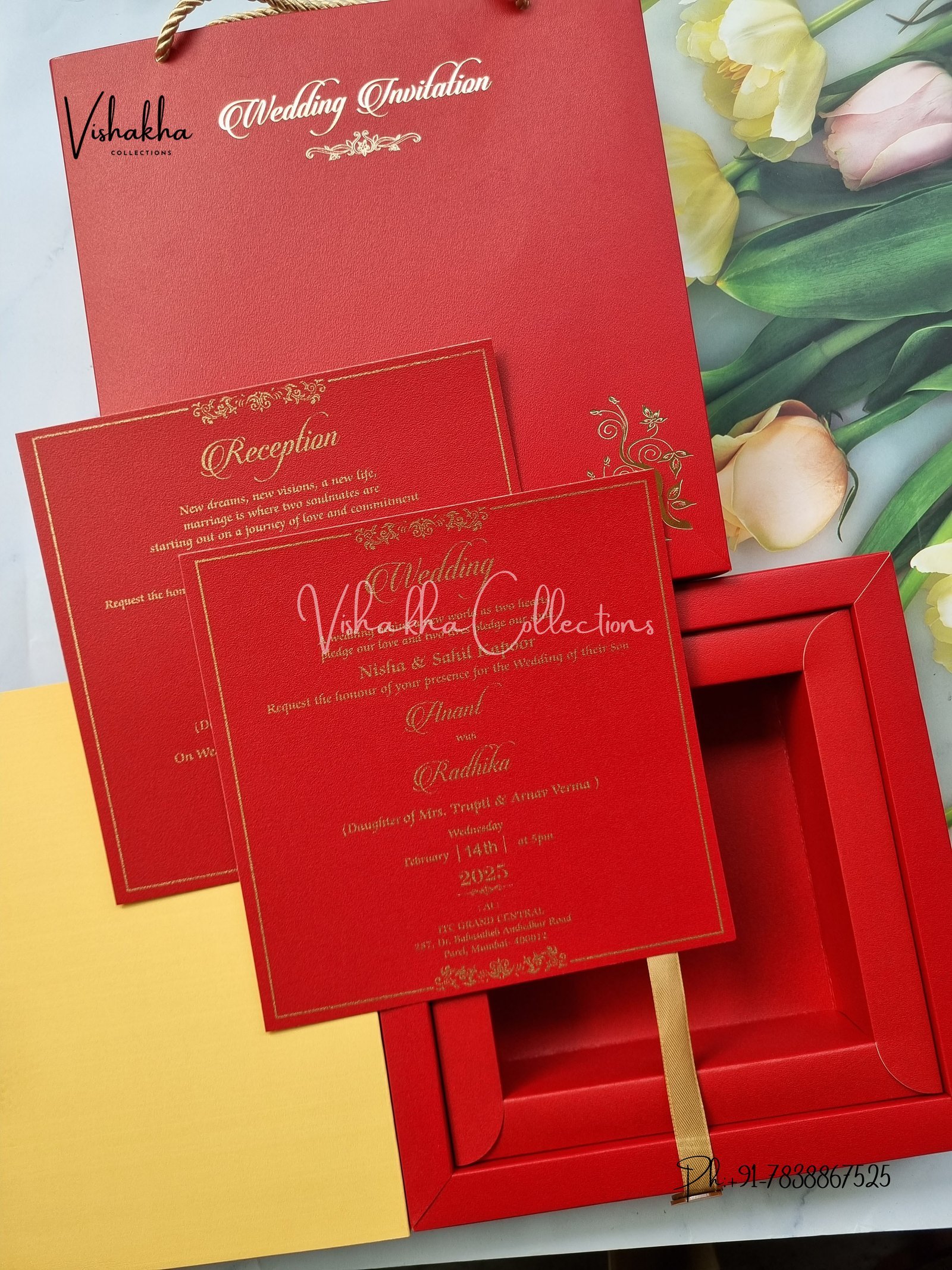 Vishakha Collections presents you beautiful luxury wedding invitation cards with all latest designs and the latest variety. Its just not a wedding invitation card but a beautiful feeling of love and relationship it carries for you. Beautifully printed and packed with a bundle of love. if you like it, dont think again, just go for it.If you are worrying about the quality of the product, send your doubts to us. We are here to help you. If you want in wholesale or bulk, dont forget to contact us.