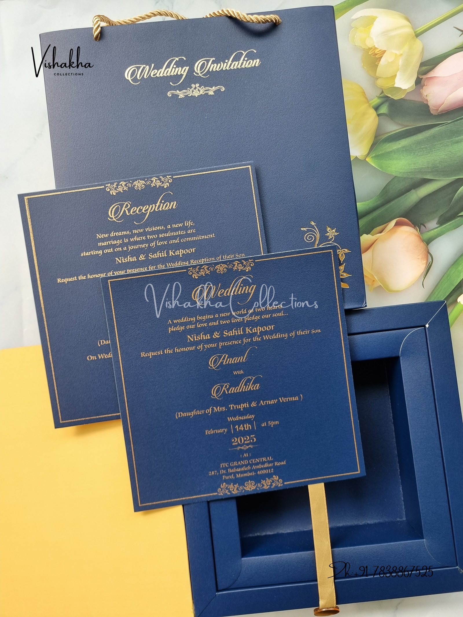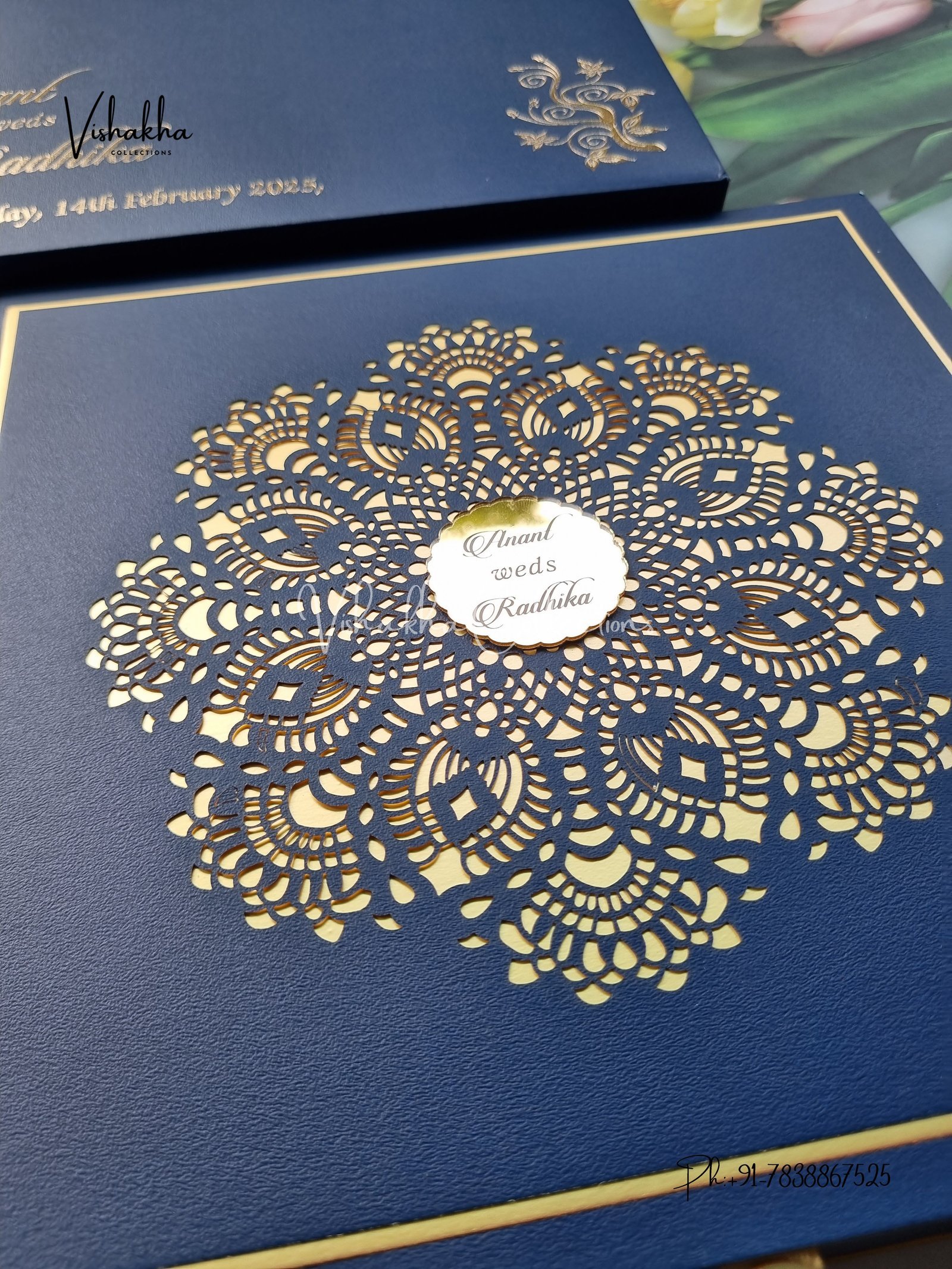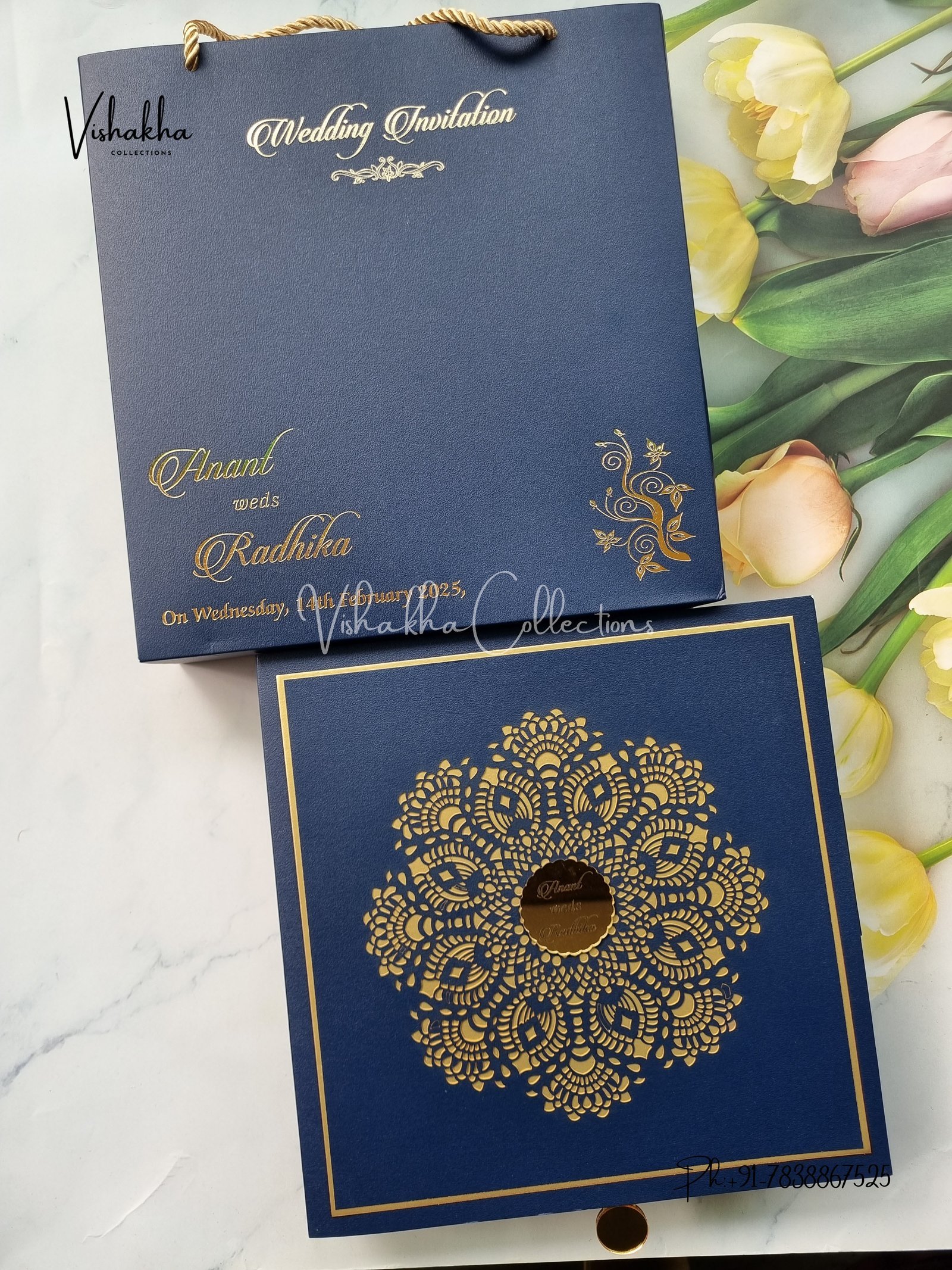 Vishakha Collections presents you beautiful luxury wedding invitation cards with all latest designs and the latest variety. Its just not a wedding invitation card but a beautiful feeling of love and relationship it carries for you. Beautifully printed and packed with a bundle of love. if you like it, dont think again, just go for it.If you are worrying about the quality of the product, send your doubts to us. We are here to help you. If you want in wholesale or bulk, dont forget to contact us.