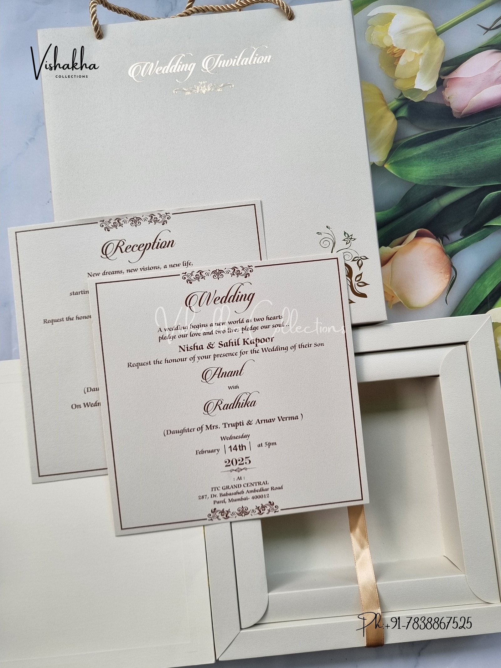 Vishakha Collections presents you beautiful luxury wedding invitation cards with all latest designs and the latest variety. Its just not a wedding invitation card but a beautiful feeling of love and relationship it carries for you. Beautifully printed and packed with a bundle of love. if you like it, dont think again, just go for it.If you are worrying about the quality of the product, send your doubts to us. We are here to help you. If you want in wholesale or bulk, dont forget to contact us.