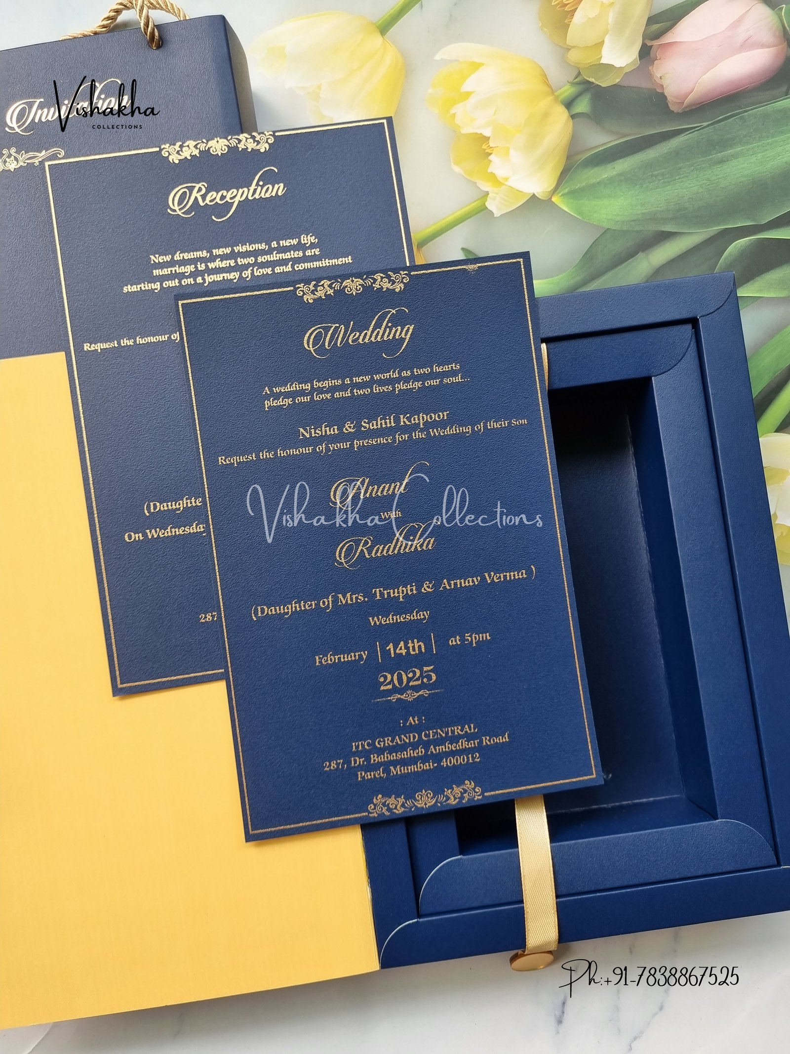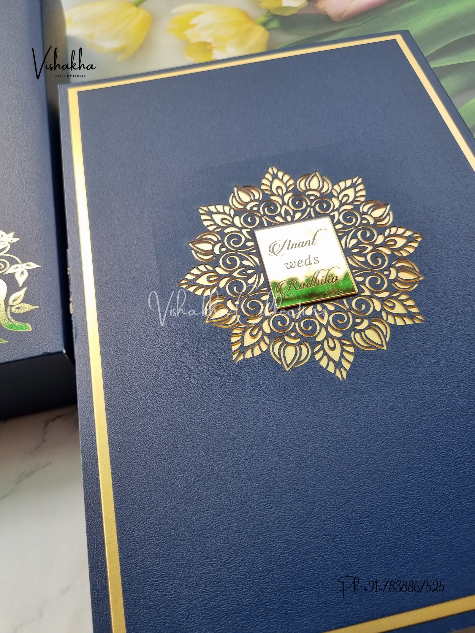 Vishakha Collections presents you beautiful luxury wedding invitation cards with all latest designs and the latest variety. Its just not a wedding invitation card but a beautiful feeling of love and relationship it carries for you. Beautifully printed and packed with a bundle of love. if you like it, dont think again, just go for it.If you are worrying about the quality of the product, send your doubts to us. We are here to help you. If you want in wholesale or bulk, dont forget to contact us.