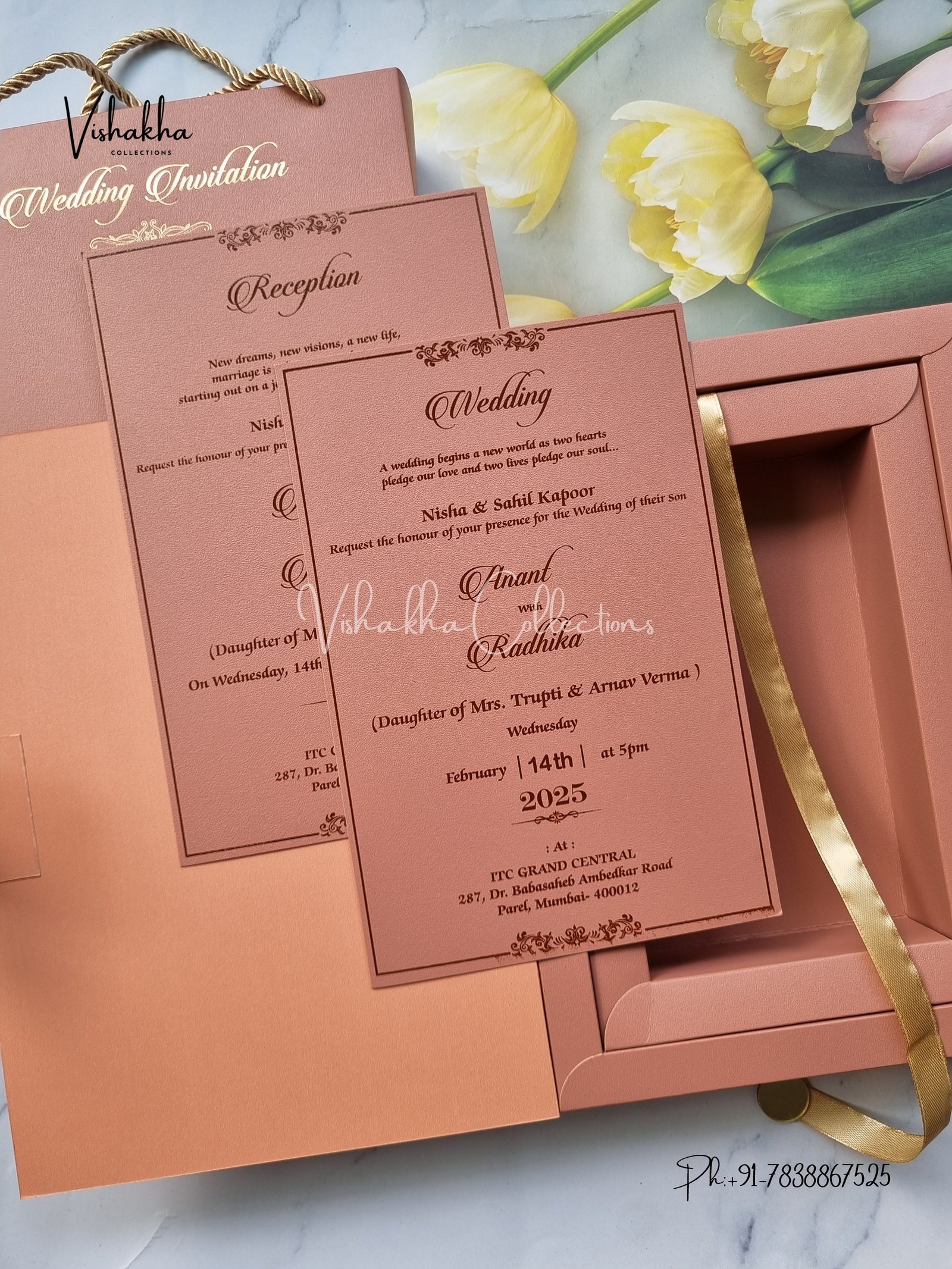 Vishakha Collections presents you beautiful luxury wedding invitation cards with all latest designs and the latest variety. Its just not a wedding invitation card but a beautiful feeling of love and relationship it carries for you. Beautifully printed and packed with a bundle of love. if you like it, dont think again, just go for it.If you are worrying about the quality of the product, send your doubts to us. We are here to help you. If you want in wholesale or bulk, dont forget to contact us.