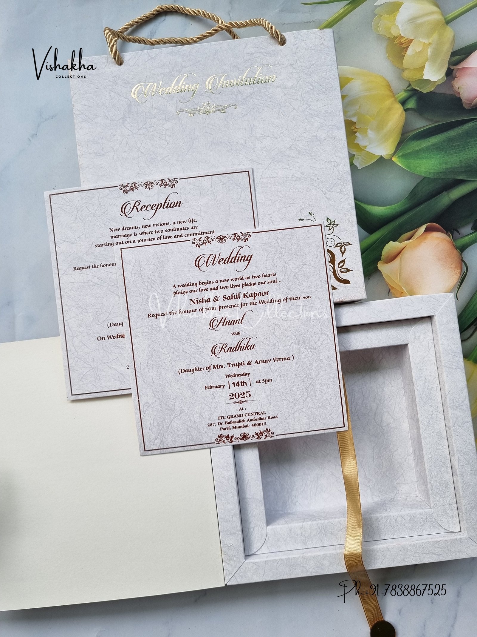 Vishakha Collections presents you Exclusive Wedding boxes invitation cards of unique colours with all the latest designs and the latest variety. It’s just not a wedding invitation card but a beautiful feeling of love and relationship it carries for you. Beautifully printed and packed with a bundle of love. If you like it, don’t think again, just go for it. If you are worried about the quality of the product, please let us know your doubts. We are here to help you. If you want in wholesale or bulk, don’t forget to contact us.