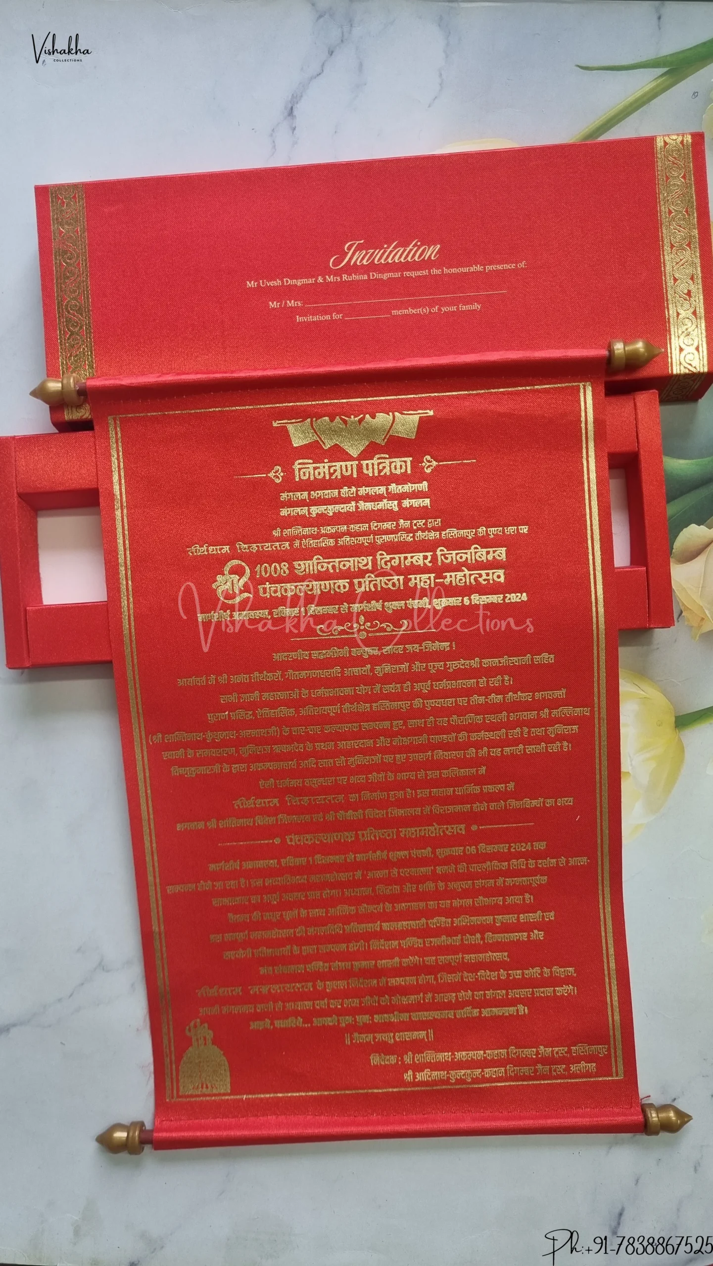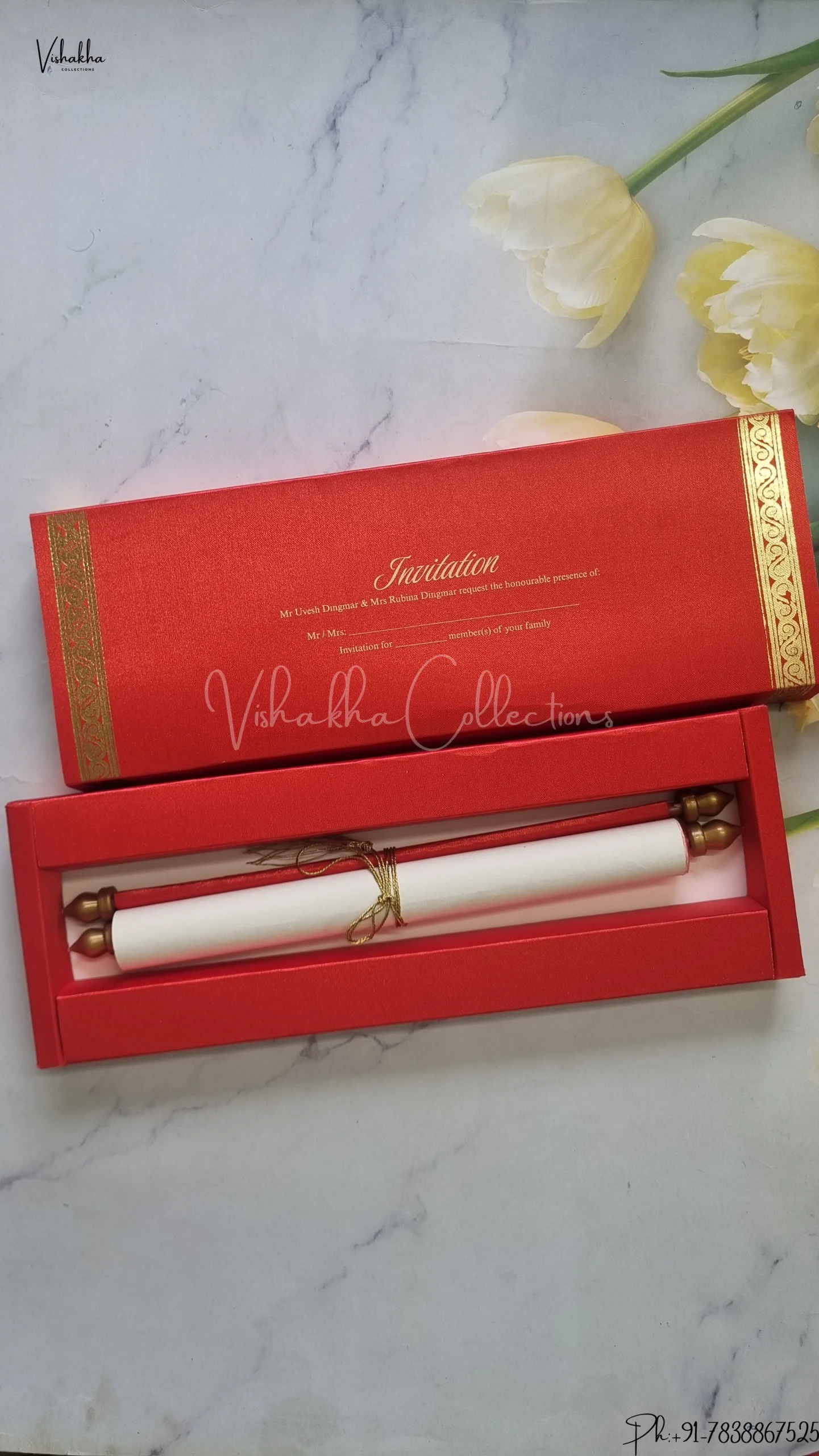 Vishakha Collections presents you beautiful luxury wedding invitation cards with all latest designs and the latest variety. Its just not a wedding invitation card but a beautiful feeling of love and relationship it carries for you. Beautifully printed and packed with a bundle of love. if you like it, dont think again, just go for it.If you are worrying about the quality of the product, send your doubts to us. We are here to help you. If you want in wholesale or bulk, dont forget to contact us.