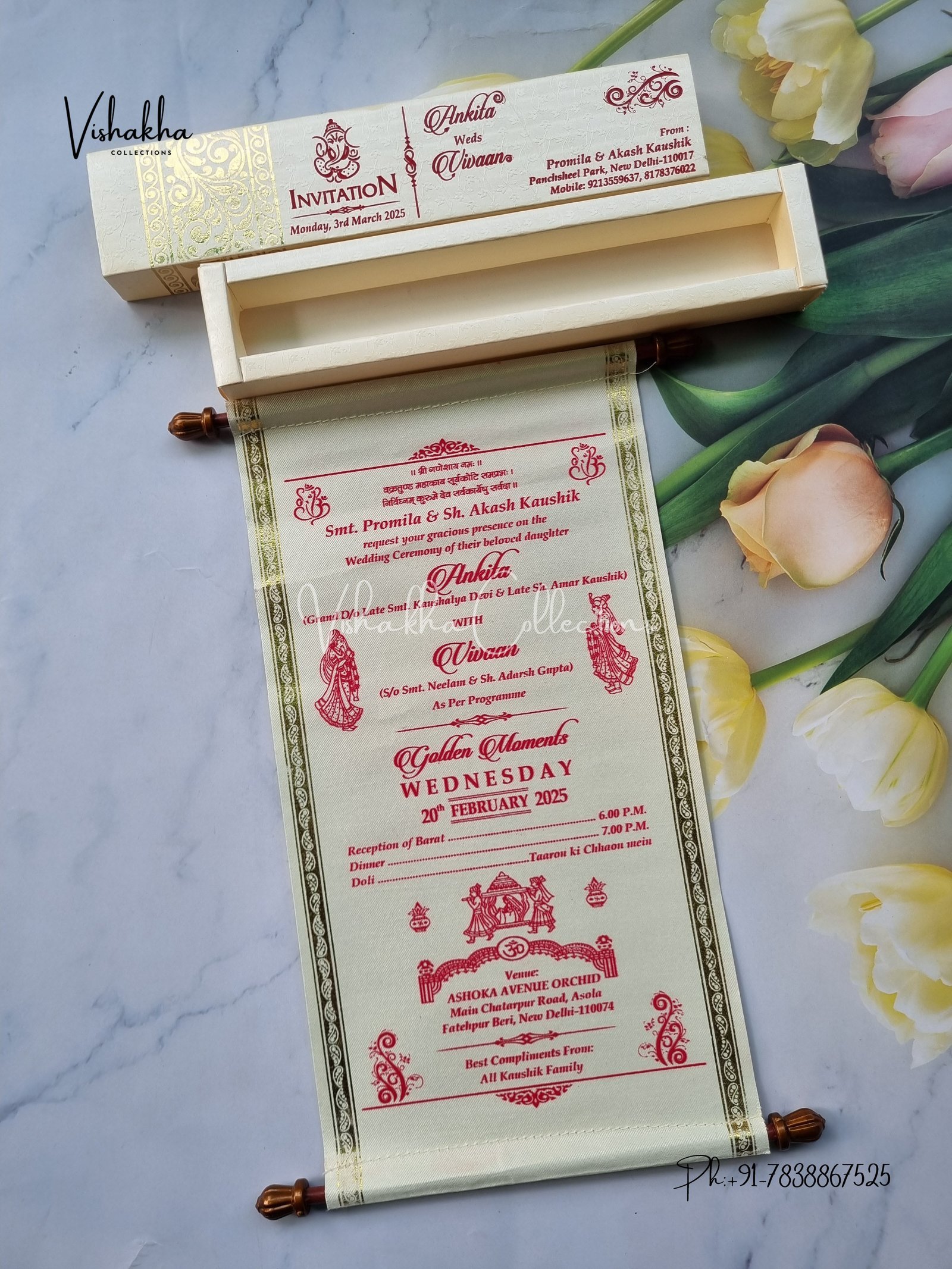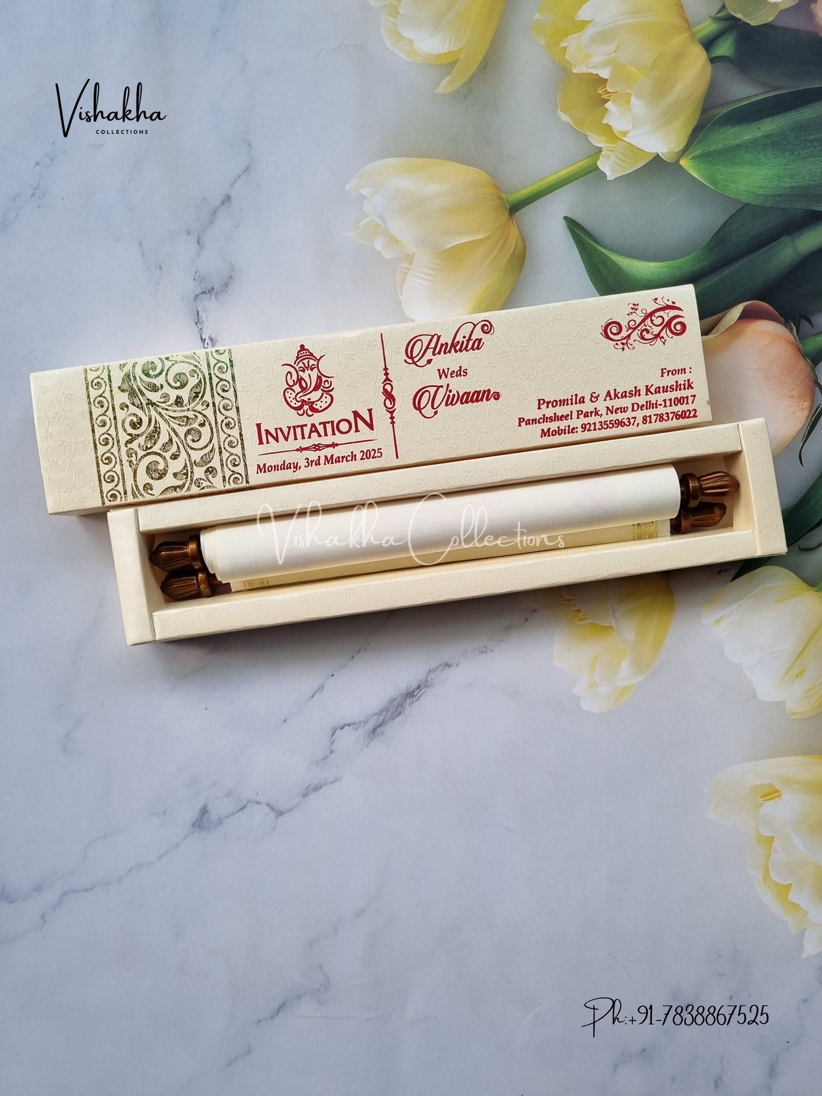 Vishakha Collections presents you beautiful luxury wedding invitation cards with all latest designs and the latest variety. Its just not a wedding invitation card but a beautiful feeling of love and relationship it carries for you. Beautifully printed and packed with a bundle of love. if you like it, dont think again, just go for it.If you are worrying about the quality of the product, send your doubts to us. We are here to help you. If you want in wholesale or bulk, dont forget to contact us.