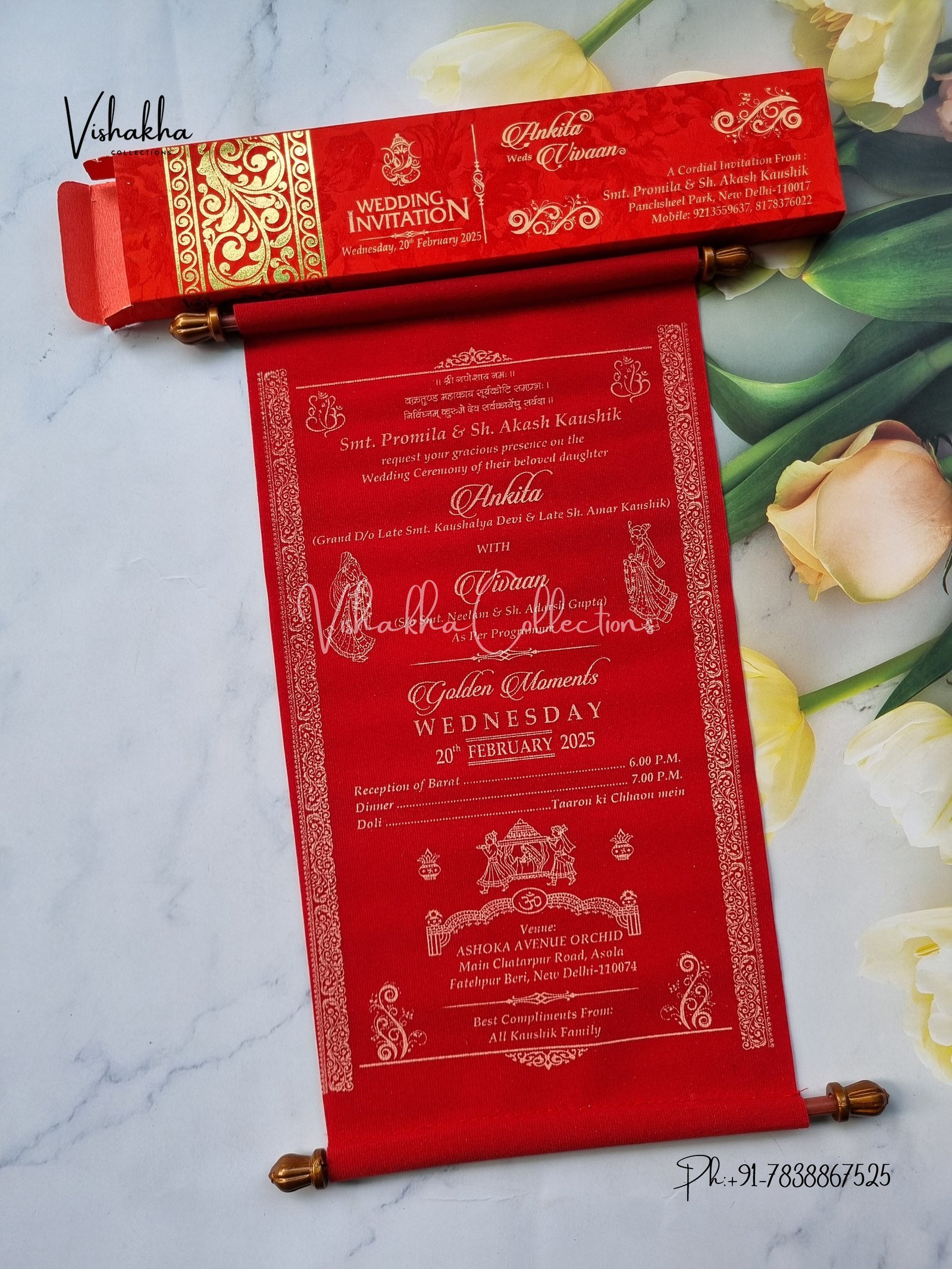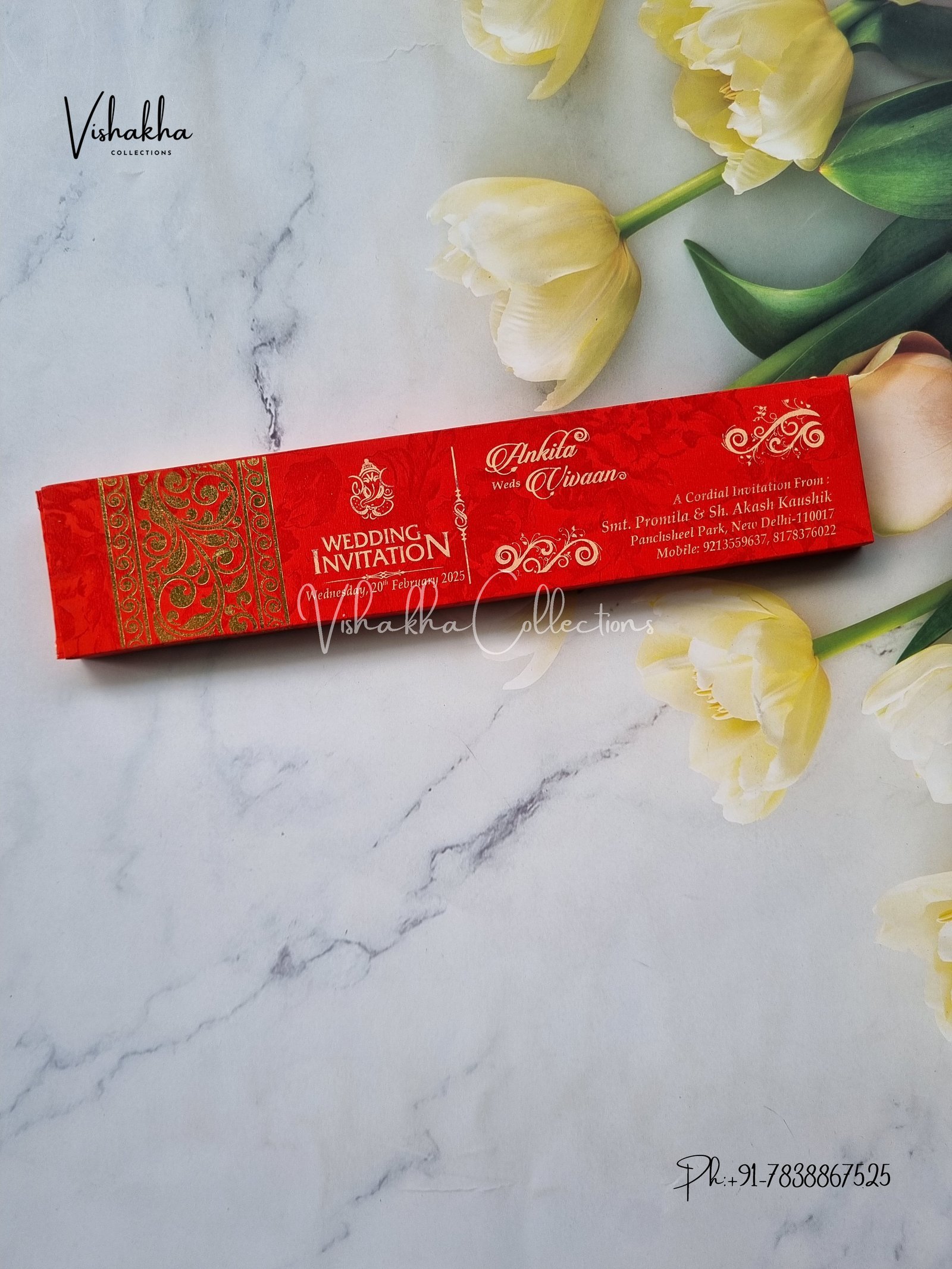 Vishakha Collections presents you beautiful luxury wedding invitation cards with all latest designs and the latest variety. Its just not a wedding invitation card but a beautiful feeling of love and relationship it carries for you. Beautifully printed and packed with a bundle of love. if you like it, dont think again, just go for it.If you are worrying about the quality of the product, send your doubts to us. We are here to help you. If you want in wholesale or bulk, dont forget to contact us.
