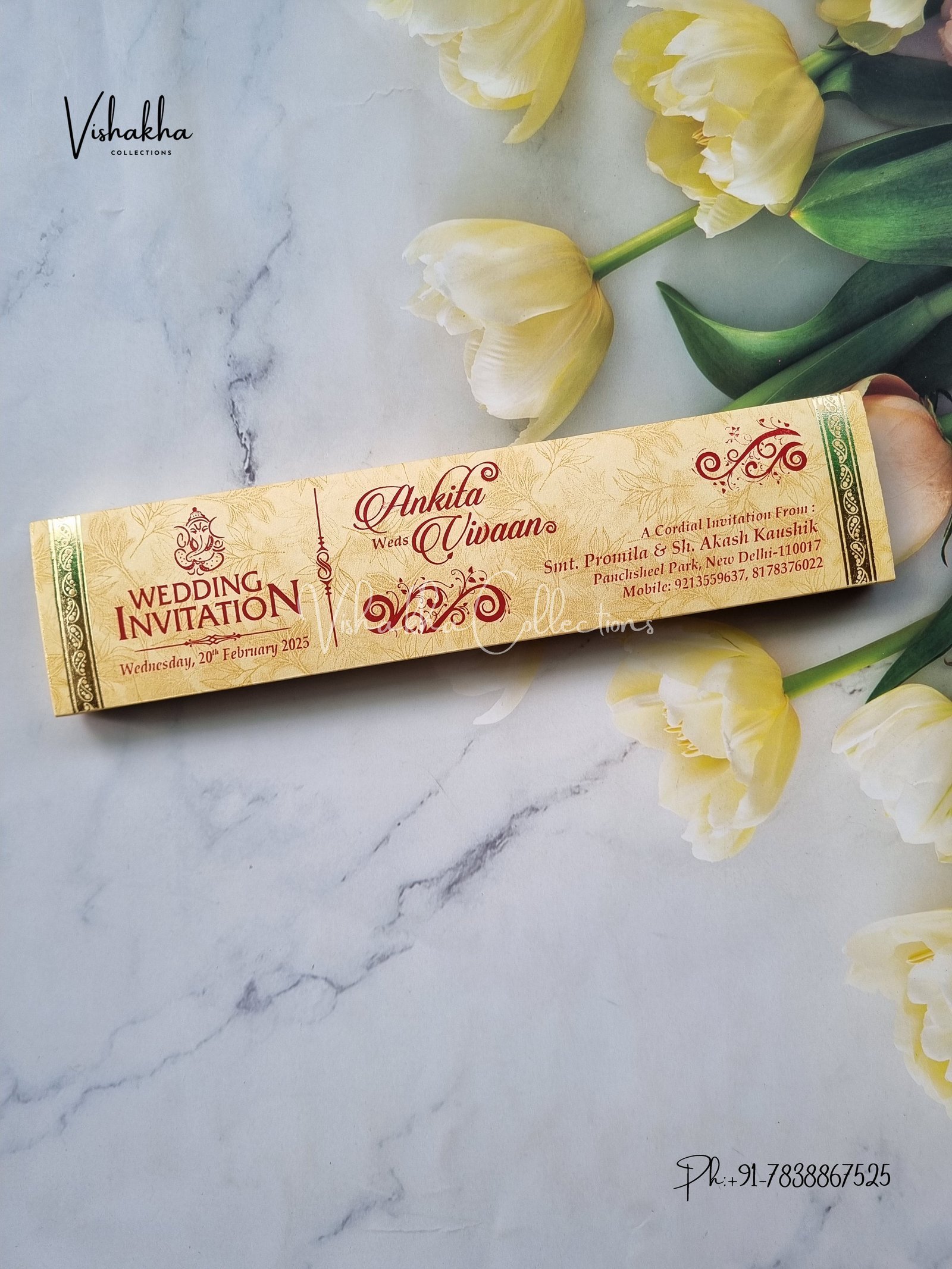 Vishakha Collections presents you beautiful luxury wedding invitation cards with all latest designs and the latest variety. Its just not a wedding invitation card but a beautiful feeling of love and relationship it carries for you. Beautifully printed and packed with a bundle of love. if you like it, dont think again, just go for it.If you are worrying about the quality of the product, send your doubts to us. We are here to help you. If you want in wholesale or bulk, dont forget to contact us.