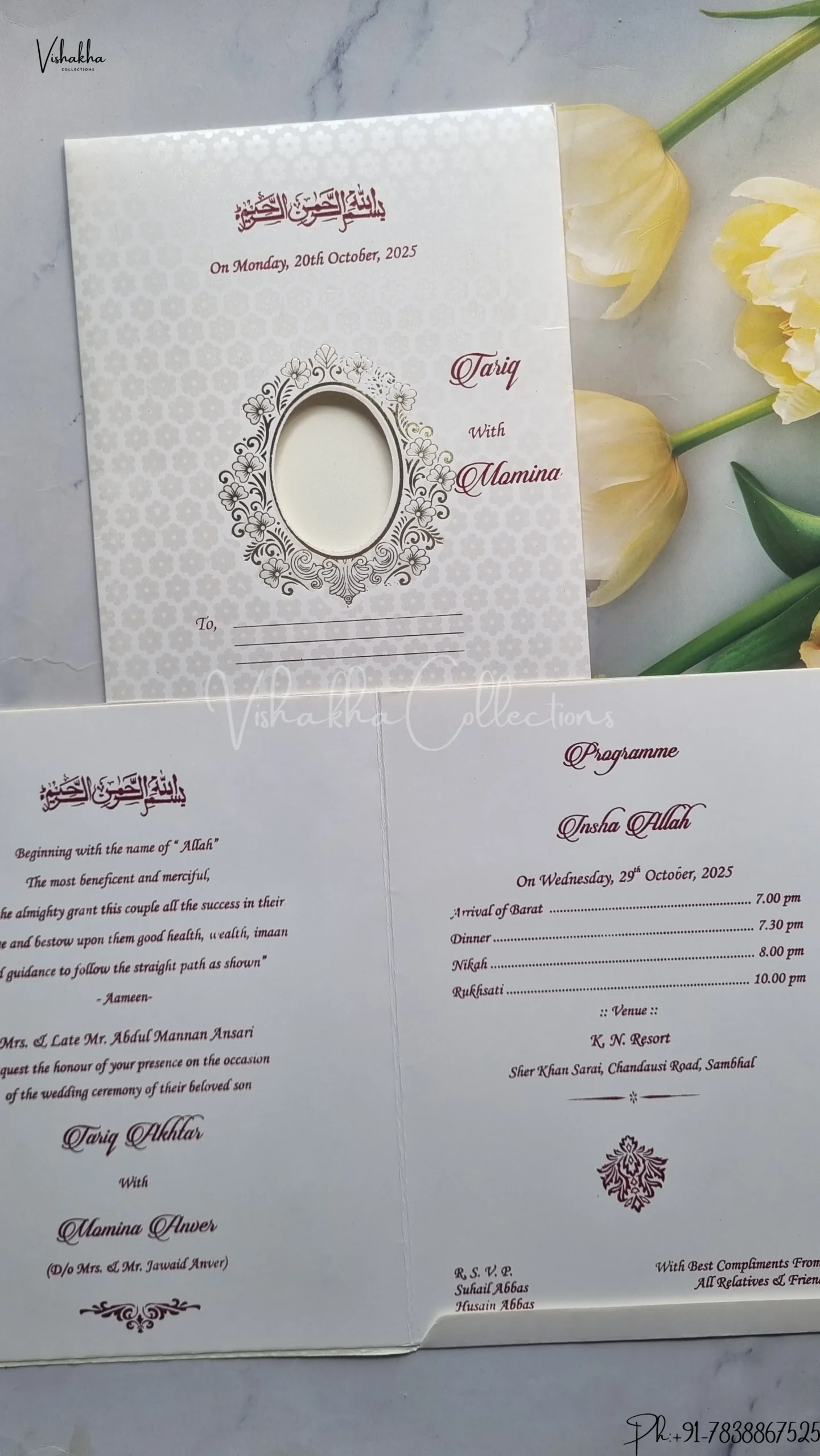 Vishakha Collections presents you beautiful luxury wedding invitation cards with all latest designs and the latest variety. Its just not a wedding invitation card but a beautiful feeling of love and relationship it carries for you. Beautifully printed and packed with a bundle of love. if you like it, dont think again, just go for it.If you are worrying about the quality of the product, send your doubts to us. We are here to help you. If you want in wholesale or bulk, dont forget to contact us.