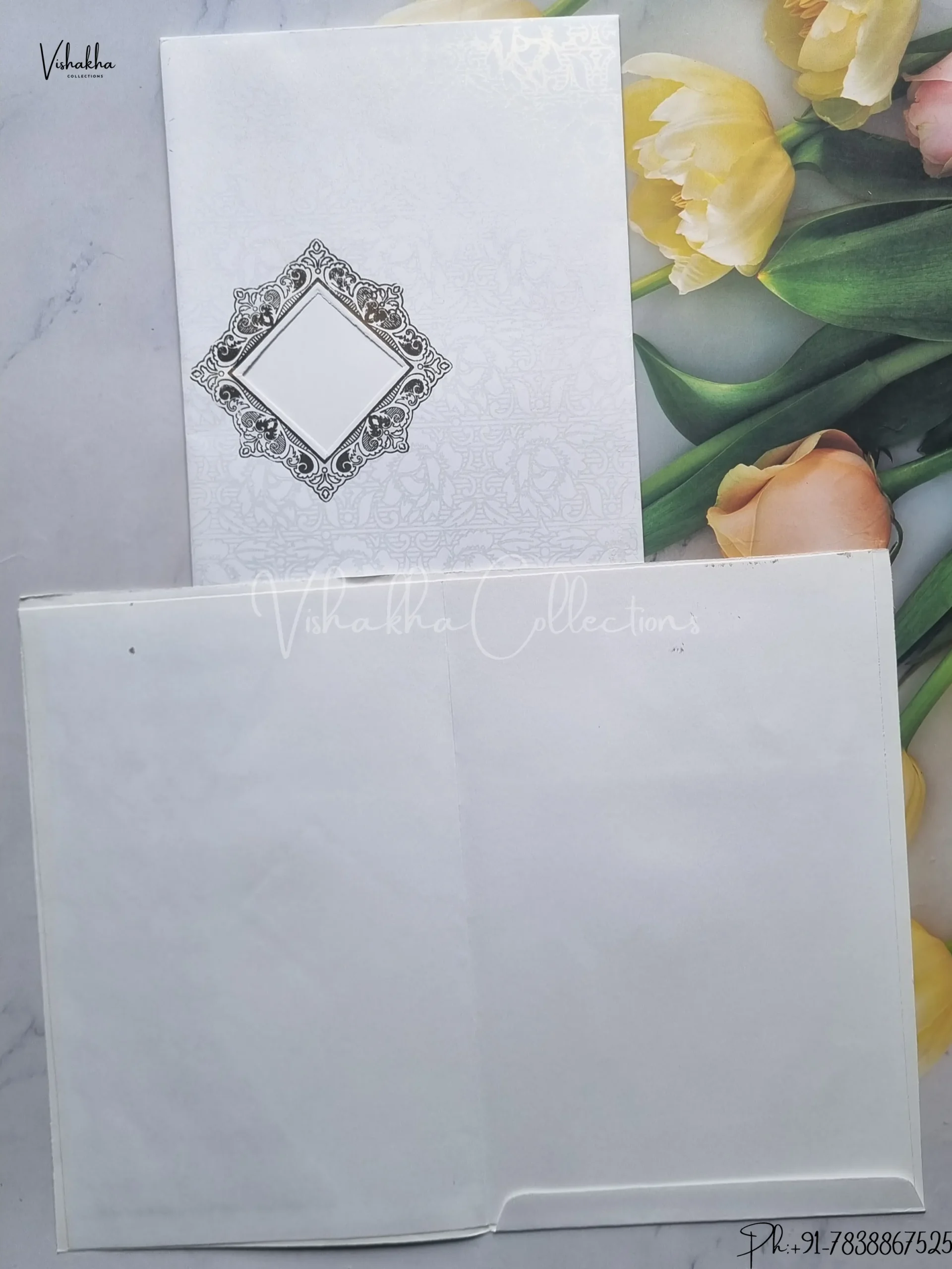 Vishakha Collections presents you beautiful luxury wedding invitation cards with all latest designs and the latest variety. Its just not a wedding invitation card but a beautiful feeling of love and relationship it carries for you. Beautifully printed and packed with a bundle of love. if you like it, dont think again, just go for it.If you are worrying about the quality of the product, send your doubts to us. We are here to help you. If you want in wholesale or bulk, dont forget to contact us.