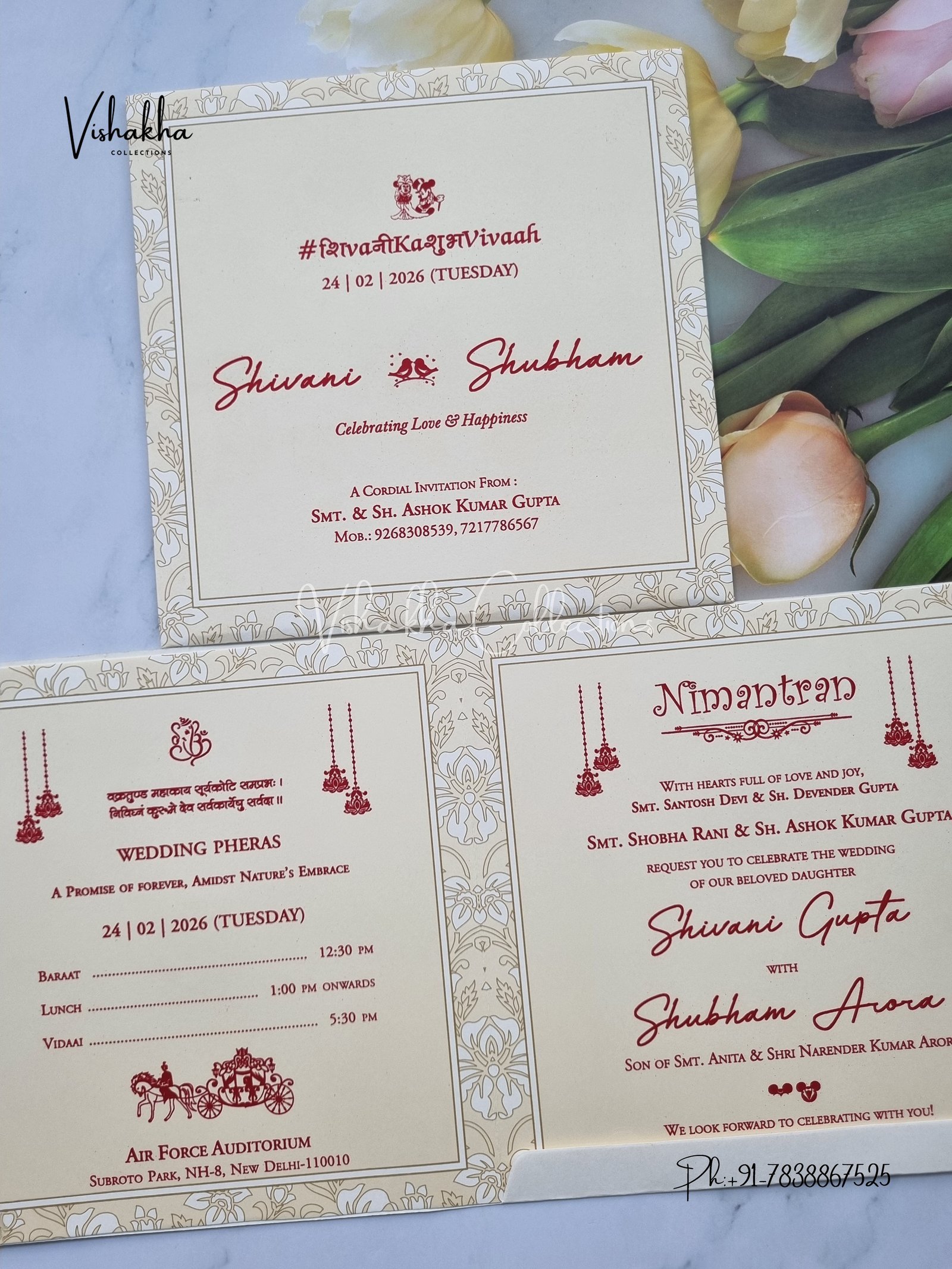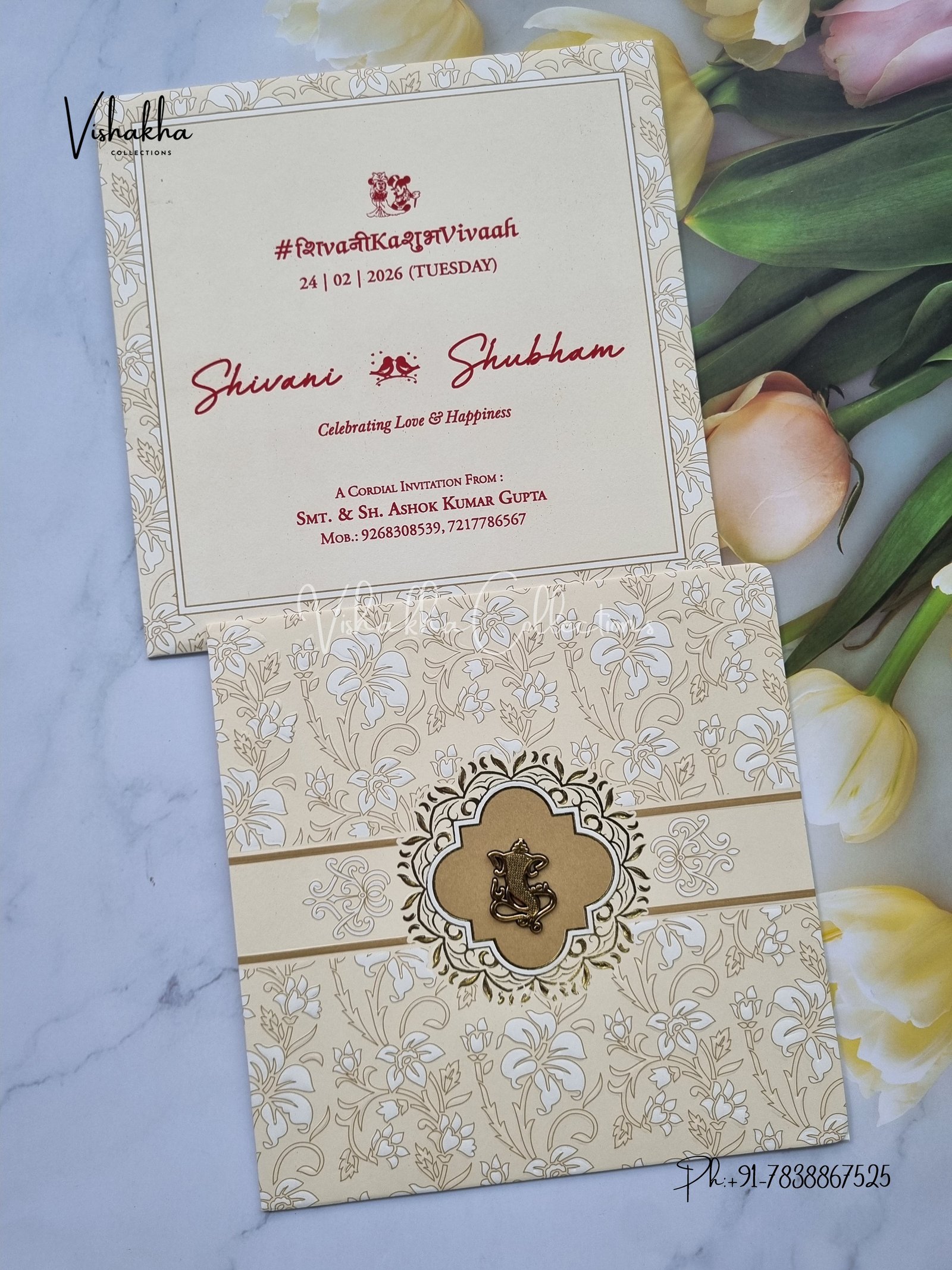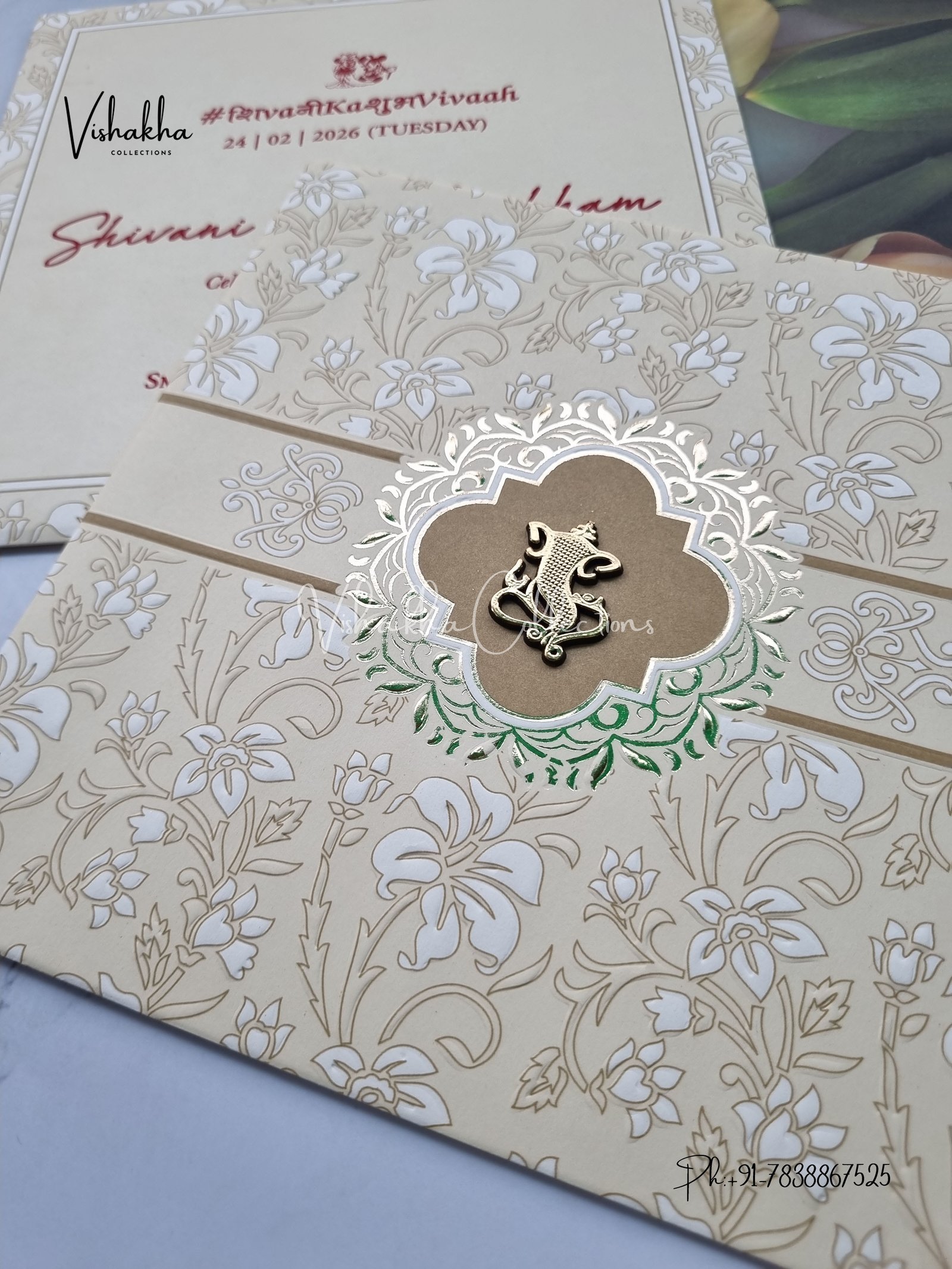 Vishakha Collections presents you beautiful luxury wedding invitation cards with all latest designs and the latest variety. Its just not a wedding invitation card but a beautiful feeling of love and relationship it carries for you. Beautifully printed and packed with a bundle of love. if you like it, dont think again, just go for it.If you are worrying about the quality of the product, send your doubts to us. We are here to help you. If you want in wholesale or bulk, dont forget to contact us.