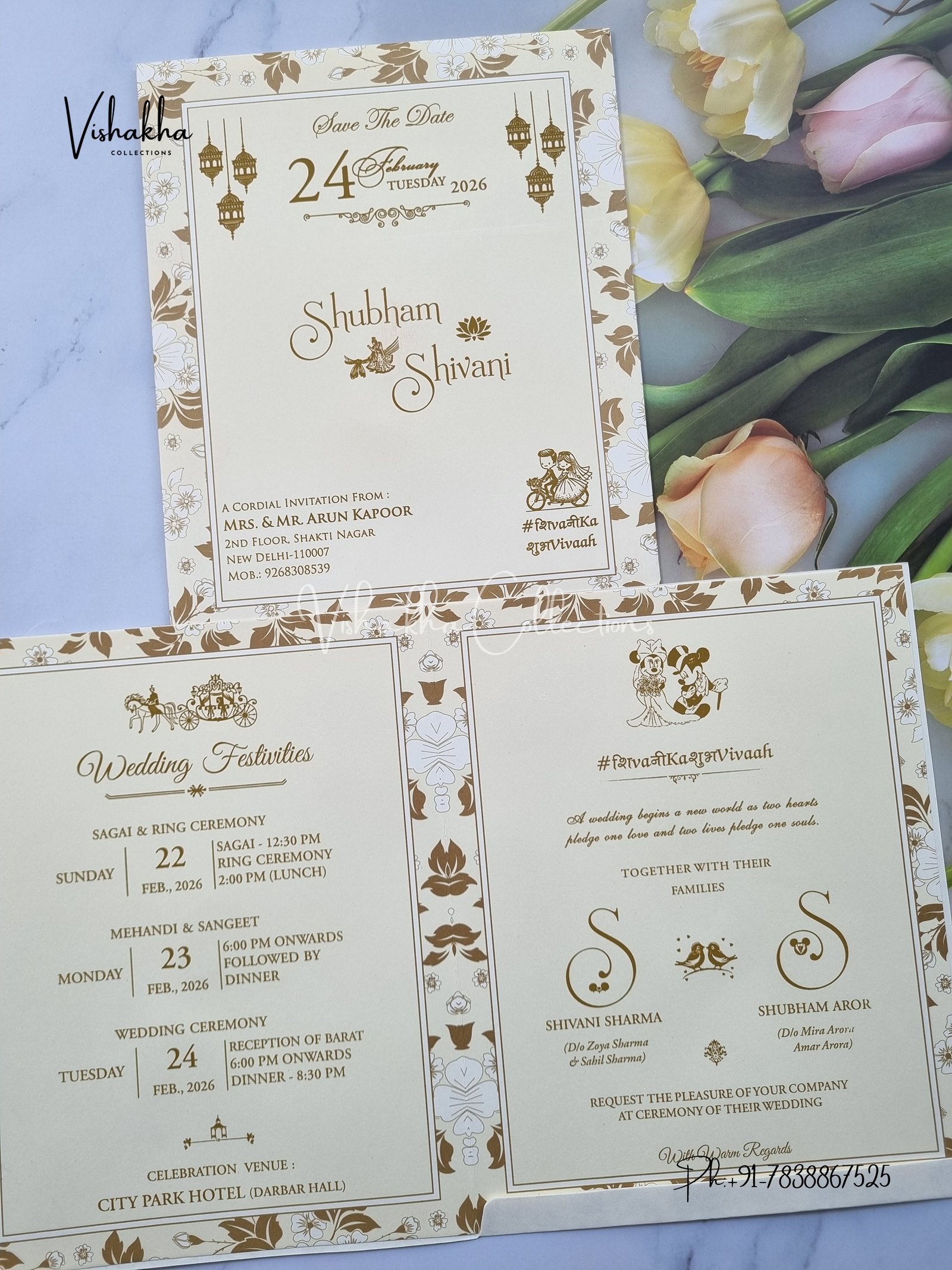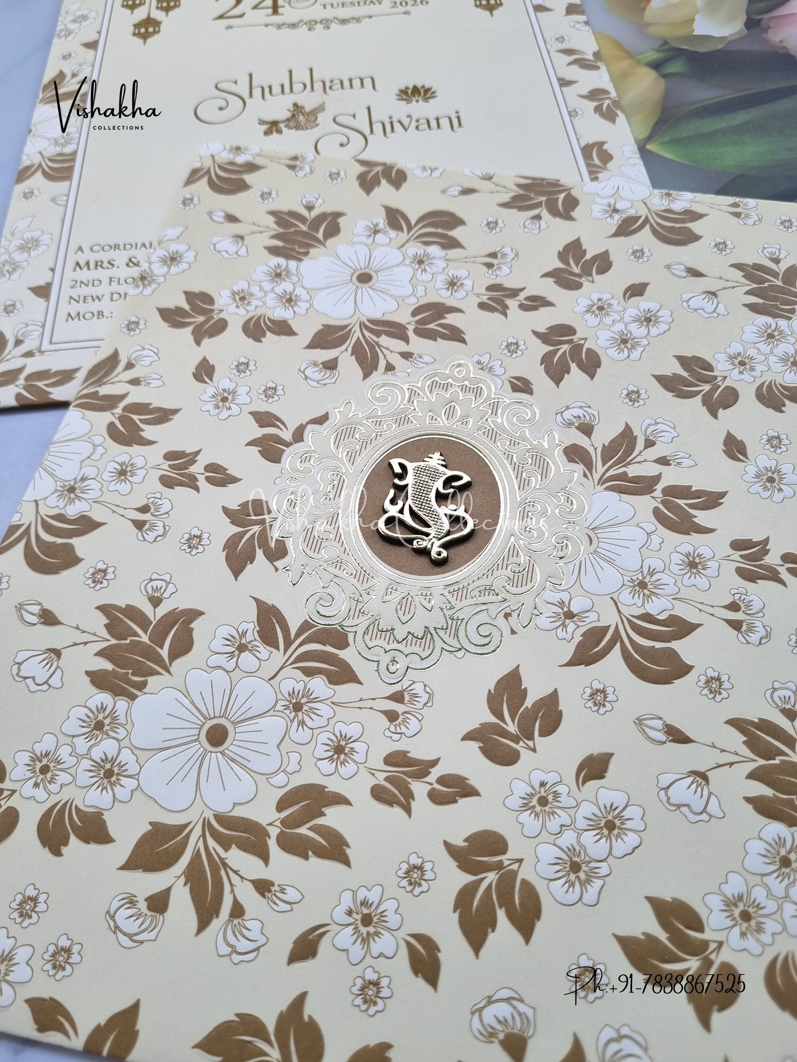 Vishakha Collections presents you beautiful luxury wedding invitation cards with all latest designs and the latest variety. Its just not a wedding invitation card but a beautiful feeling of love and relationship it carries for you. Beautifully printed and packed with a bundle of love. if you like it, dont think again, just go for it.If you are worrying about the quality of the product, send your doubts to us. We are here to help you. If you want in wholesale or bulk, dont forget to contact us.