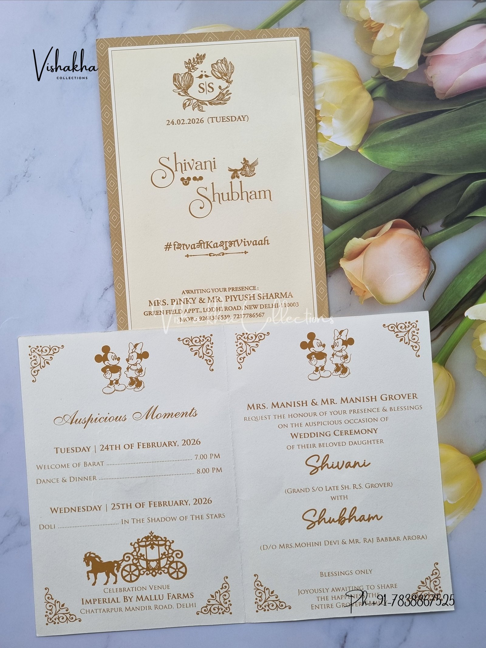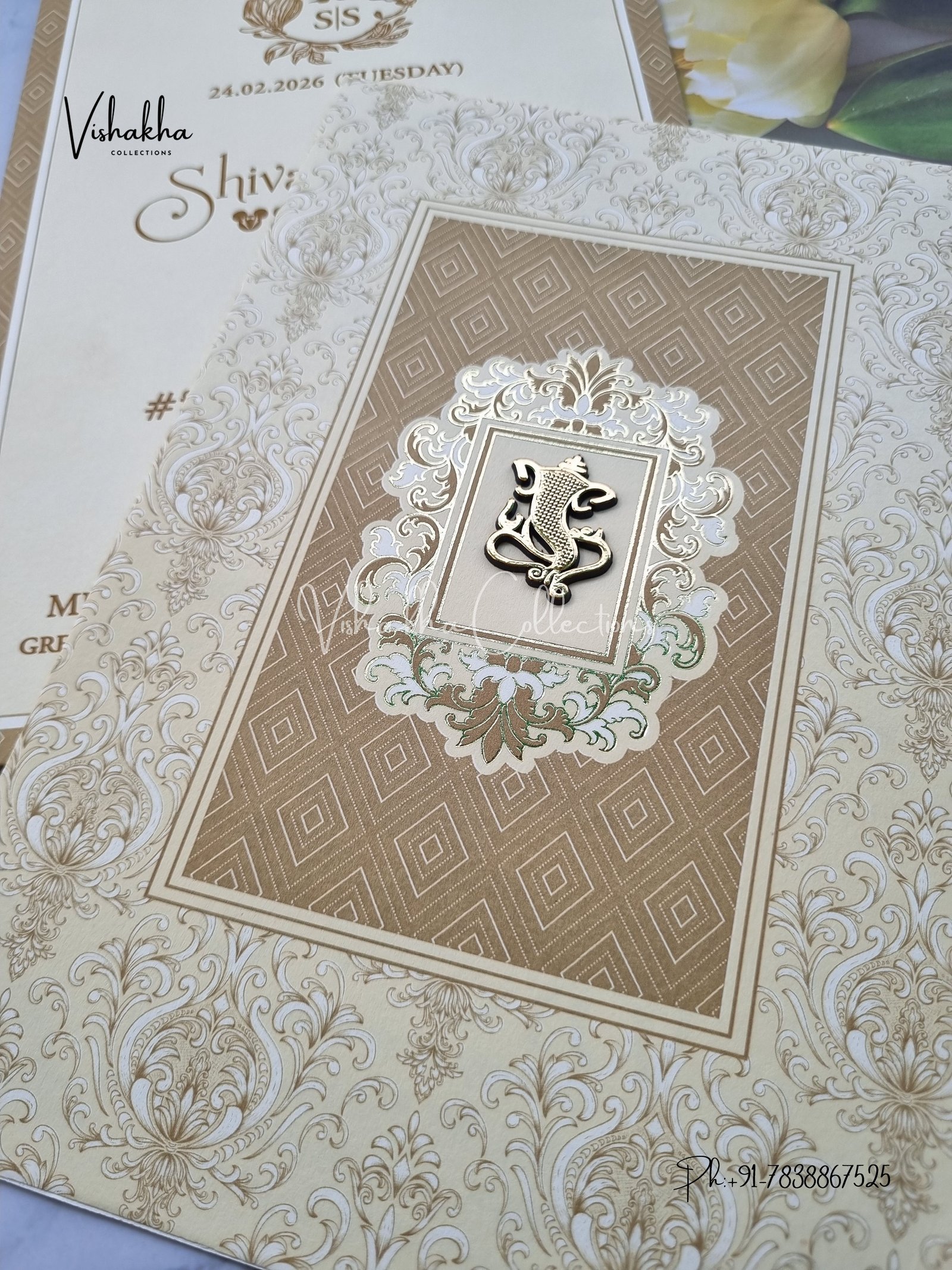 Vishakha Collections presents you beautiful luxury wedding invitation cards with all latest designs and the latest variety. Its just not a wedding invitation card but a beautiful feeling of love and relationship it carries for you. Beautifully printed and packed with a bundle of love. if you like it, dont think again, just go for it.If you are worrying about the quality of the product, send your doubts to us. We are here to help you. If you want in wholesale or bulk, dont forget to contact us.