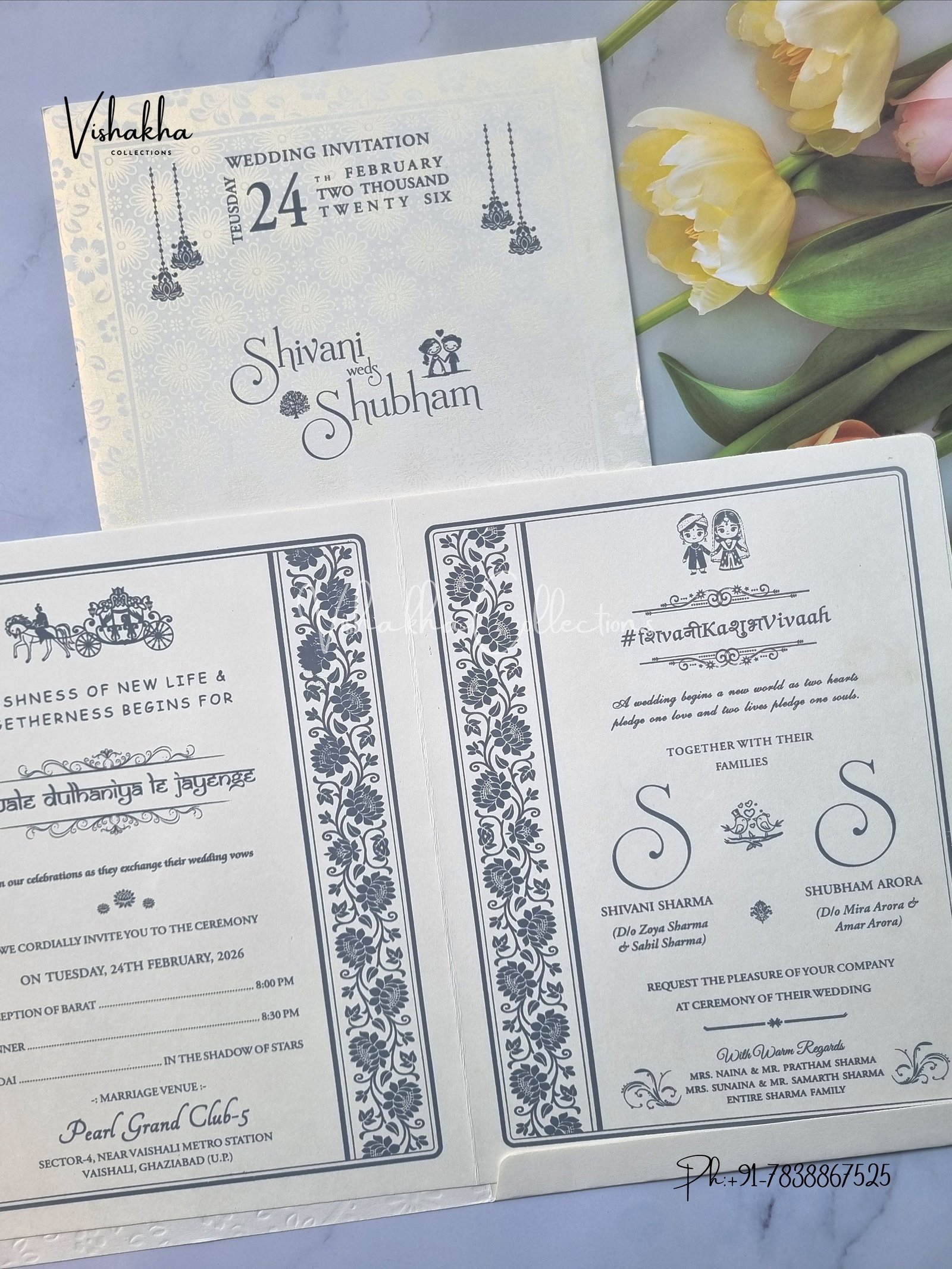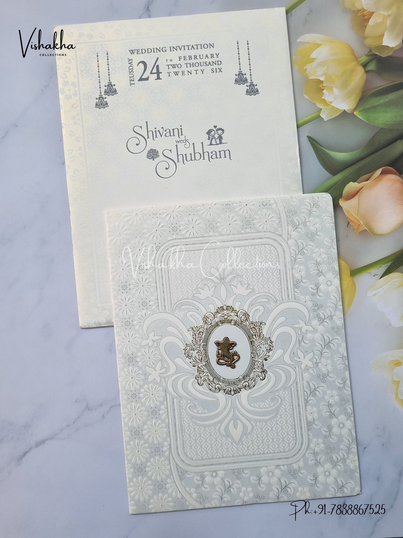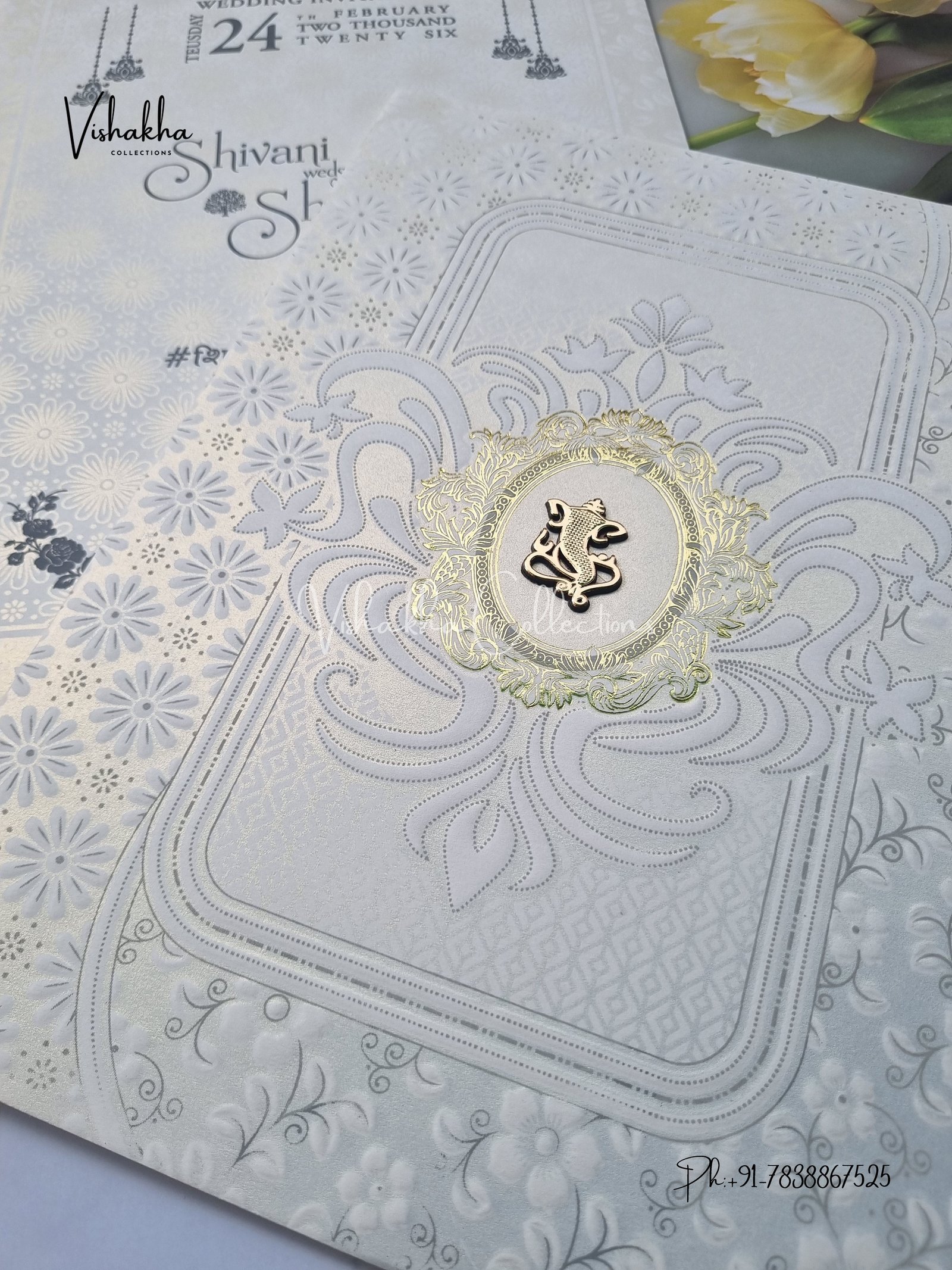 Vishakha Collections presents you beautiful luxury wedding invitation cards with all latest designs and the latest variety. Its just not a wedding invitation card but a beautiful feeling of love and relationship it carries for you. Beautifully printed and packed with a bundle of love. if you like it, dont think again, just go for it.If you are worrying about the quality of the product, send your doubts to us. We are here to help you. If you want in wholesale or bulk, dont forget to contact us.