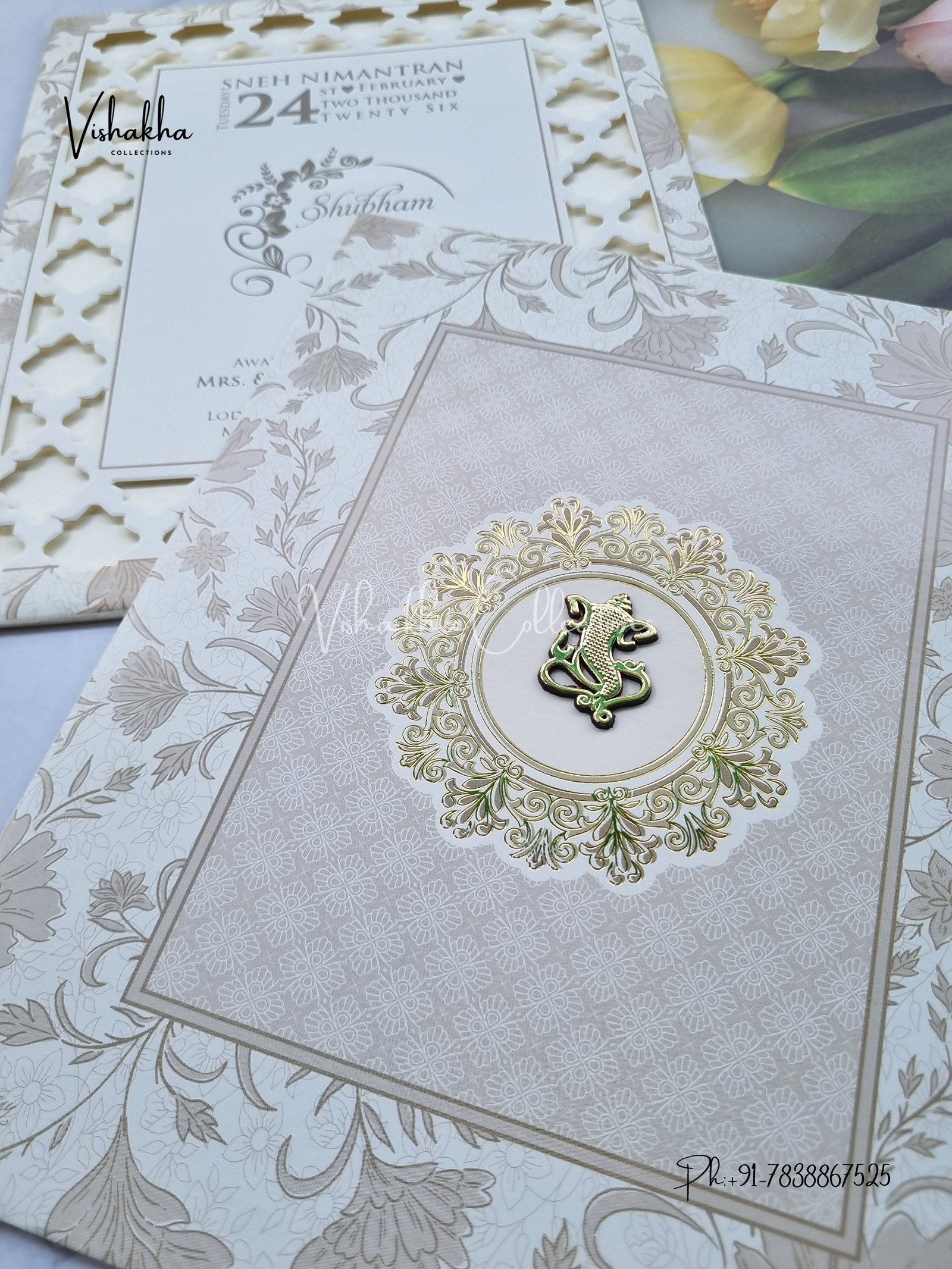 Vishakha Collections presents you beautiful luxury wedding invitation cards with all latest designs and the latest variety. Its just not a wedding invitation card but a beautiful feeling of love and relationship it carries for you. Beautifully printed and packed with a bundle of love. if you like it, dont think again, just go for it.If you are worrying about the quality of the product, send your doubts to us. We are here to help you. If you want in wholesale or bulk, dont forget to contact us.