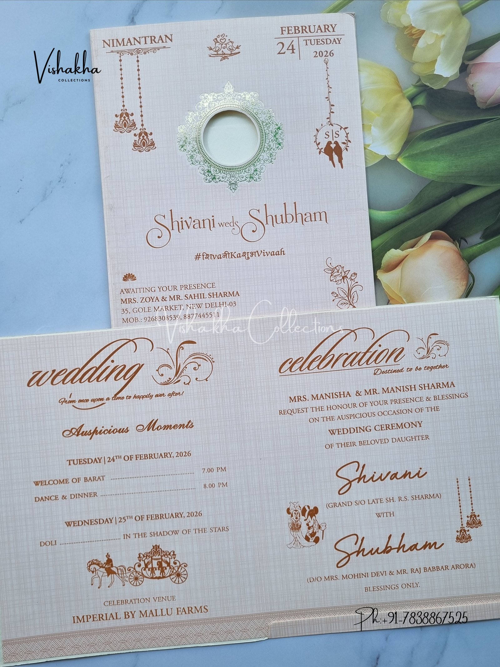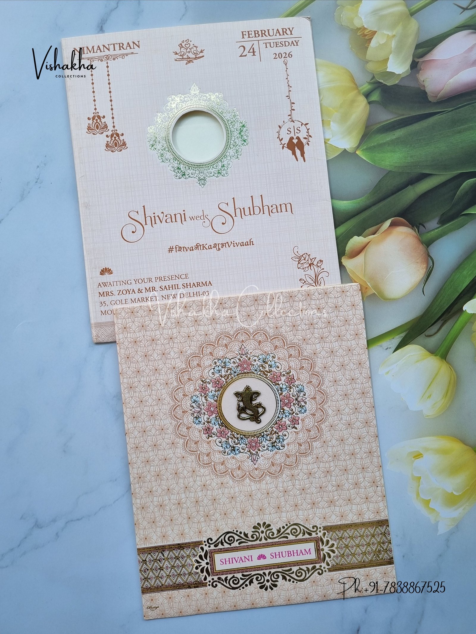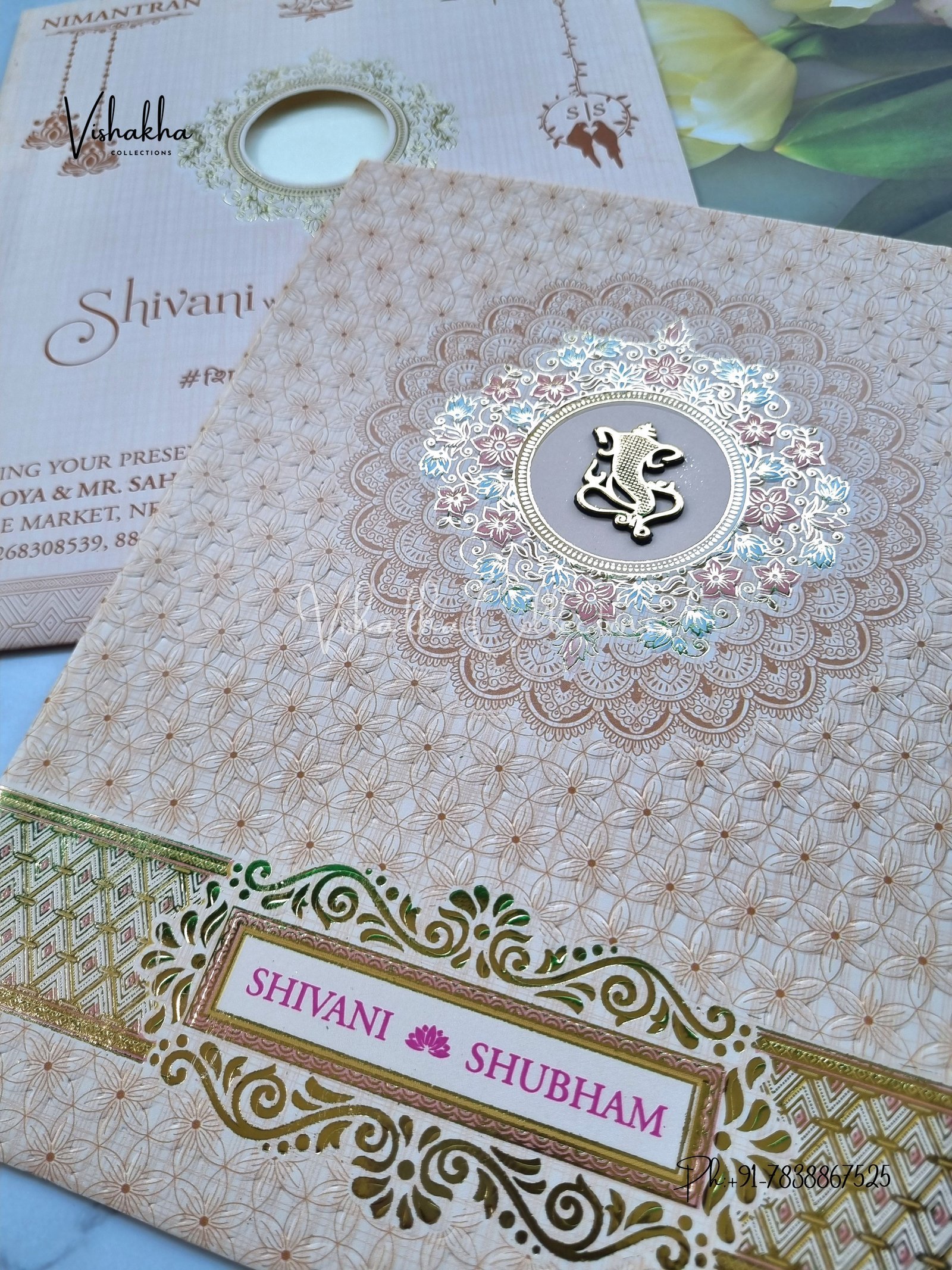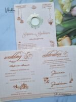 Vishakha Collections presents you beautiful luxury wedding invitation cards with all latest designs and the latest variety. Its just not a wedding invitation card but a beautiful feeling of love and relationship it carries for you. Beautifully printed and packed with a bundle of love. if you like it, dont think again, just go for it.If you are worrying about the quality of the product, send your doubts to us. We are here to help you. If you want in wholesale or bulk, dont forget to contact us.