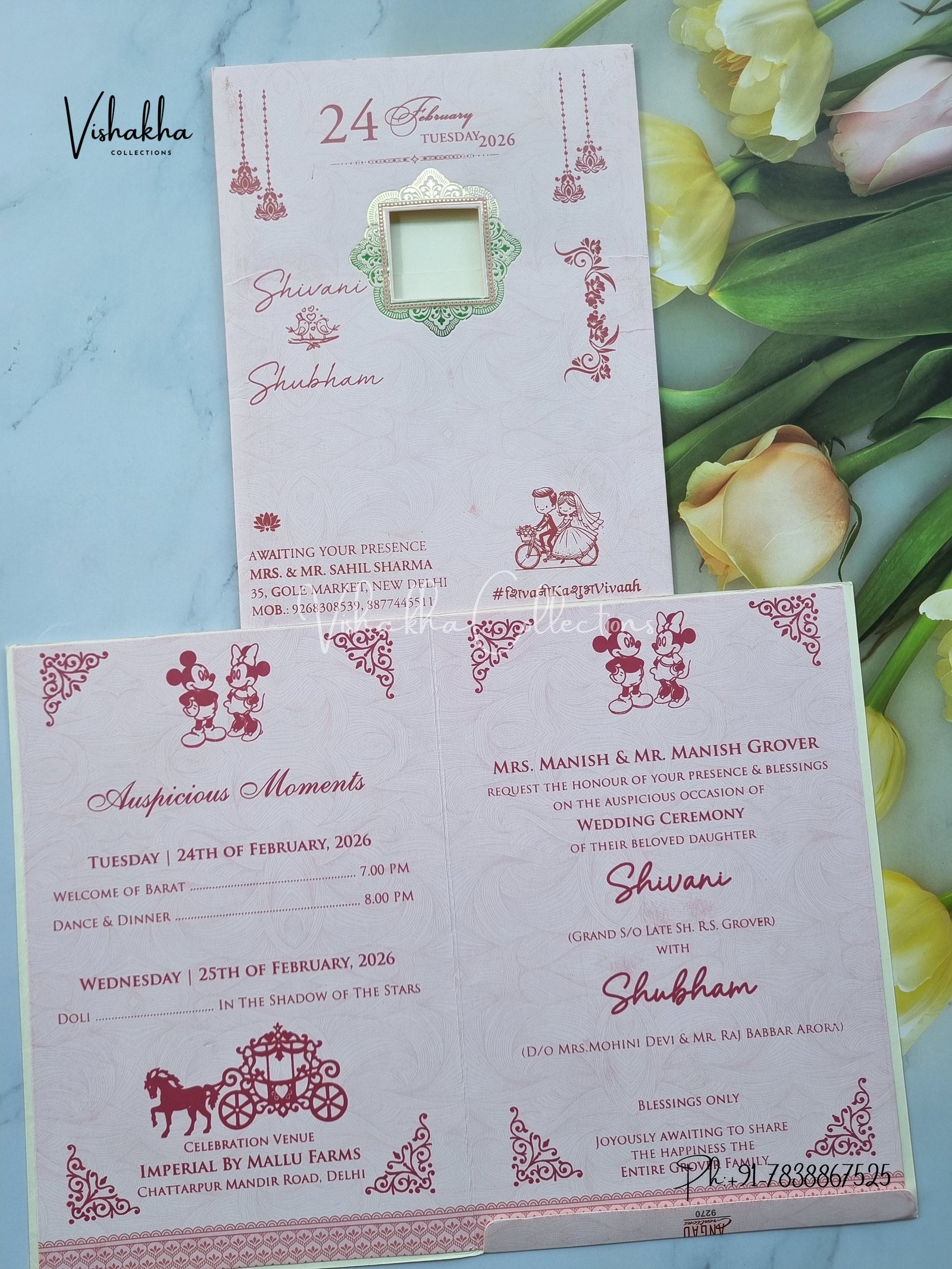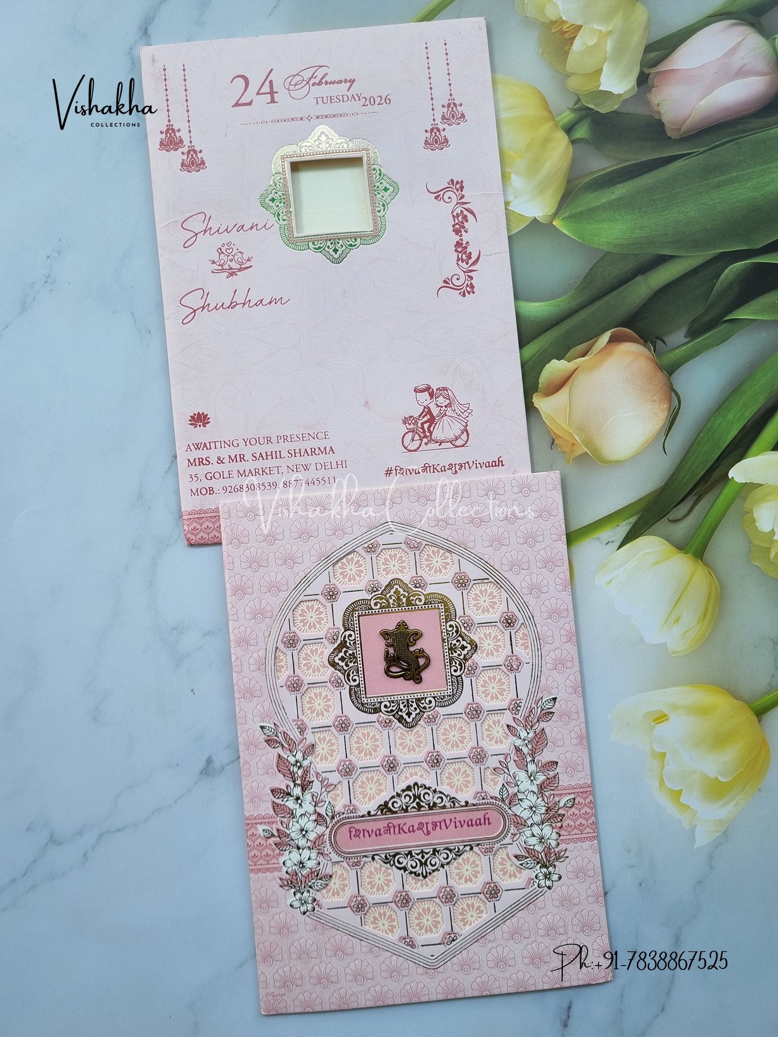 Vishakha Collections presents you beautiful luxury wedding invitation cards with all latest designs and the latest variety. Its just not a wedding invitation card but a beautiful feeling of love and relationship it carries for you. Beautifully printed and packed with a bundle of love. if you like it, dont think again, just go for it.If you are worrying about the quality of the product, send your doubts to us. We are here to help you. If you want in wholesale or bulk, dont forget to contact us.