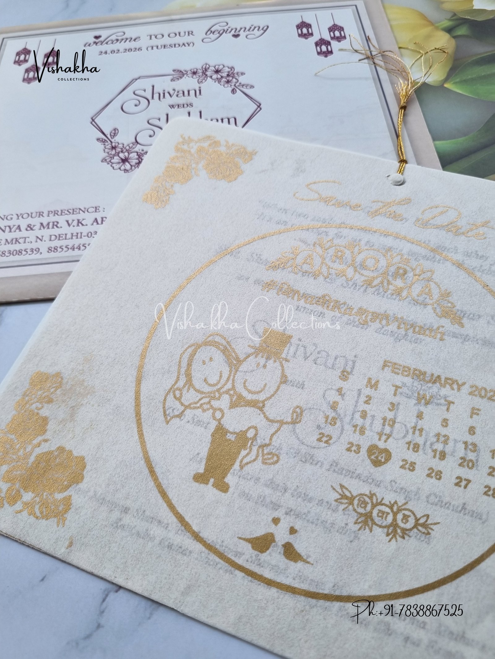 Vishakha Collections presents you beautiful luxury wedding invitation cards with all latest designs and the latest variety. Its just not a wedding invitation card but a beautiful feeling of love and relationship it carries for you. Beautifully printed and packed with a bundle of love. if you like it, dont think again, just go for it.If you are worrying about the quality of the product, send your doubts to us. We are here to help you. If you want in wholesale or bulk, dont forget to contact us.