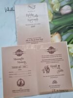 Vishakha Collections presents you beautiful luxury wedding invitation cards with all latest designs and the latest variety. Its just not a wedding invitation card but a beautiful feeling of love and relationship it carries for you. Beautifully printed and packed with a bundle of love. if you like it, dont think again, just go for it.If you are worrying about the quality of the product, send your doubts to us. We are here to help you. If you want in wholesale or bulk, dont forget to contact us.