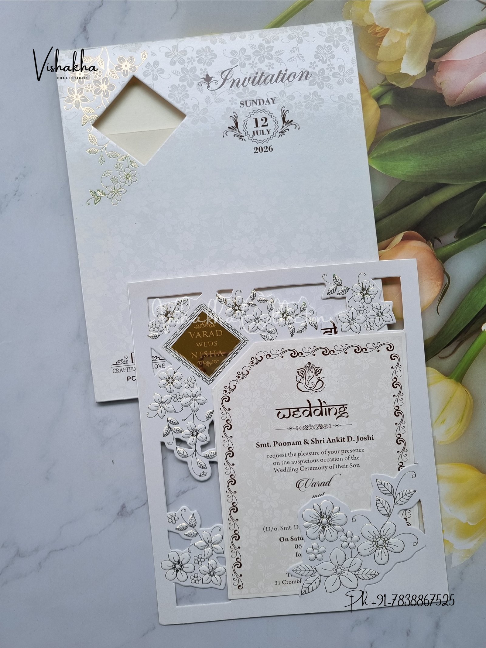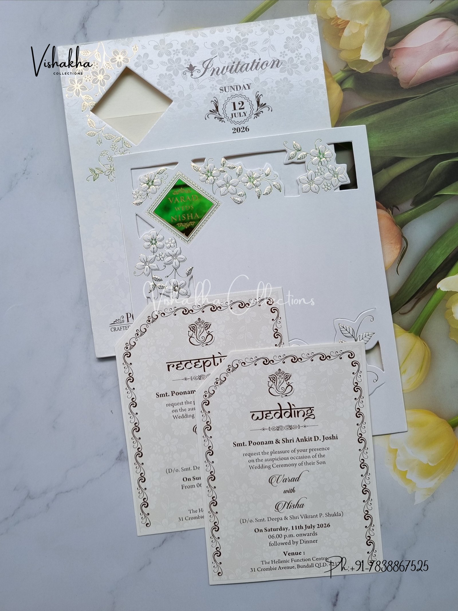 Vishakha Collections presents you beautiful luxury wedding invitation cards with all latest designs and the latest variety. Its just not a wedding invitation card but a beautiful feeling of love and relationship it carries for you. Beautifully printed and packed with a bundle of love. if you like it, dont think again, just go for it.If you are worrying about the quality of the product, send your doubts to us. We are here to help you. If you want in wholesale or bulk, dont forget to contact us.