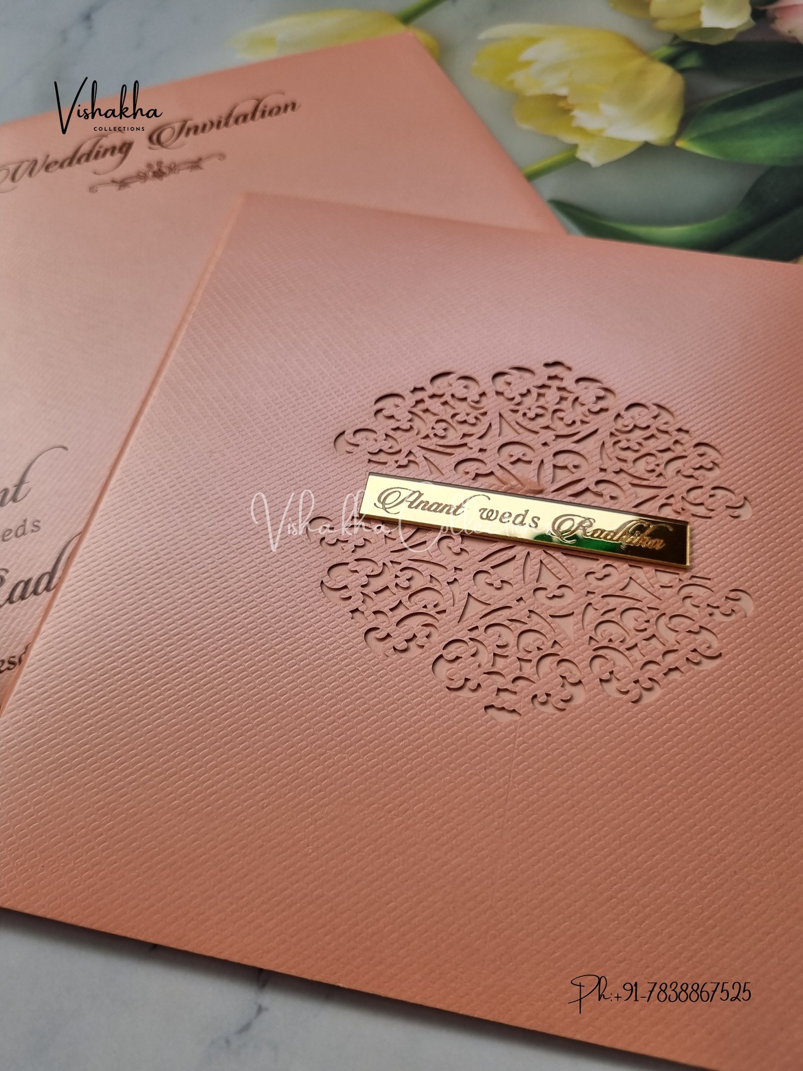 Vishakha Collections presents you beautiful luxury wedding invitation cards with all latest designs and the latest variety. Its just not a wedding invitation card but a beautiful feeling of love and relationship it carries for you. Beautifully printed and packed with a bundle of love. if you like it, dont think again, just go for it.If you are worrying about the quality of the product, send your doubts to us. We are here to help you. If you want in wholesale or bulk, dont forget to contact us.