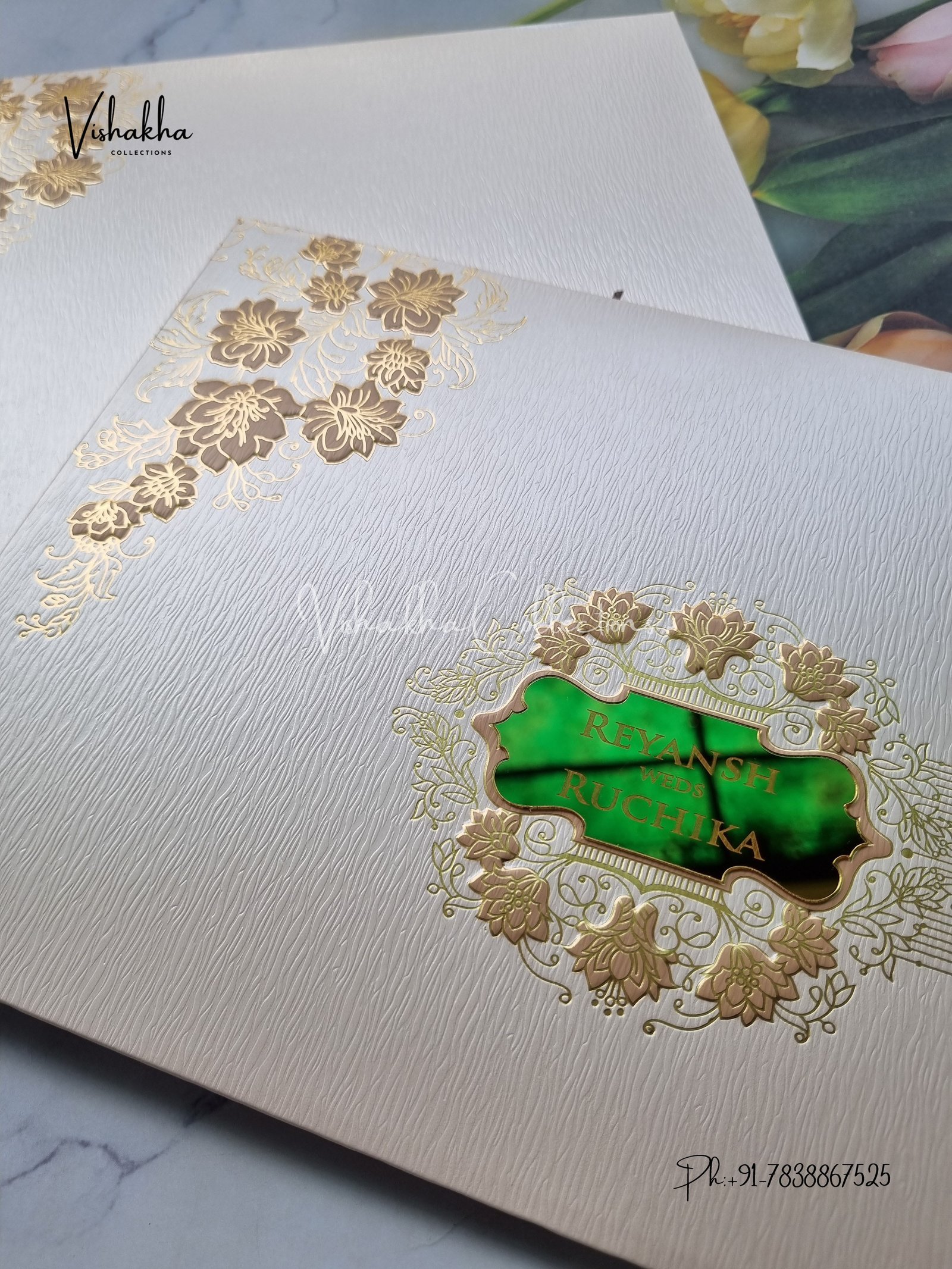 Vishakha Collections presents you beautiful luxury wedding invitation cards with all latest designs and the latest variety. Its just not a wedding invitation card but a beautiful feeling of love and relationship it carries for you. Beautifully printed and packed with a bundle of love. if you like it, dont think again, just go for it.If you are worrying about the quality of the product, send your doubts to us. We are here to help you. If you want in wholesale or bulk, dont forget to contact us.