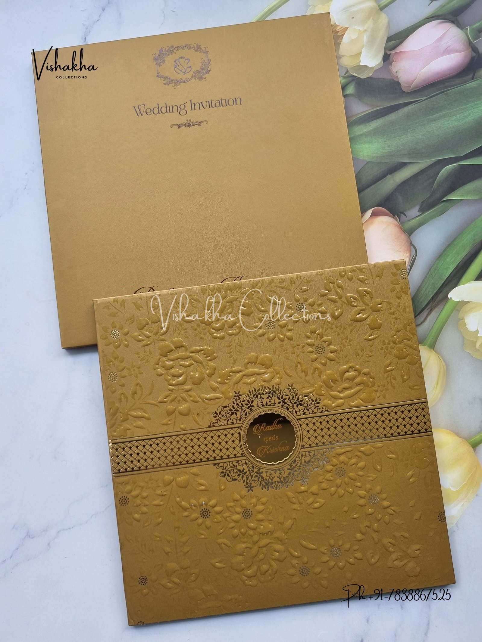 Vishakha Collections presents you beautiful luxury wedding invitation cards with all latest designs and the latest variety. Its just not a wedding invitation card but a beautiful feeling of love and relationship it carries for you. Beautifully printed and packed with a bundle of love. if you like it, dont think again, just go for it.If you are worrying about the quality of the product, send your doubts to us. We are here to help you. If you want in wholesale or bulk, dont forget to contact us.
