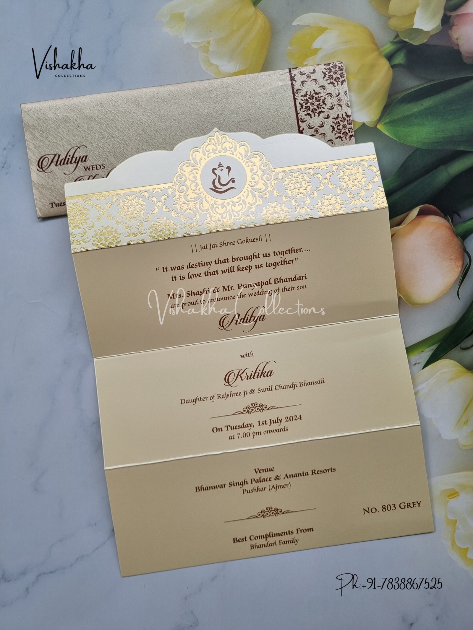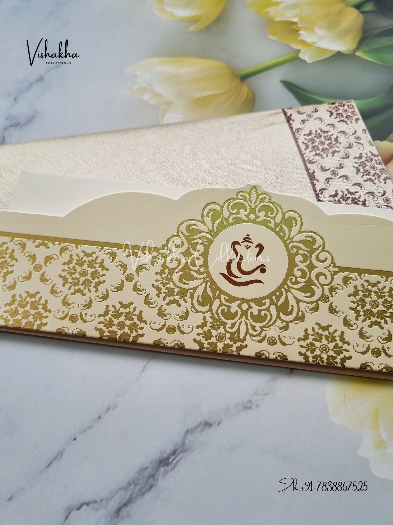 Vishakha Collections presents you beautiful luxury wedding invitation cards with all latest designs and the latest variety. Its just not a wedding invitation card but a beautiful feeling of love and relationship it carries for you. Beautifully printed and packed with a bundle of love. if you like it, dont think again, just go for it.If you are worrying about the quality of the product, send your doubts to us. We are here to help you. If you want in wholesale or bulk, dont forget to contact us.