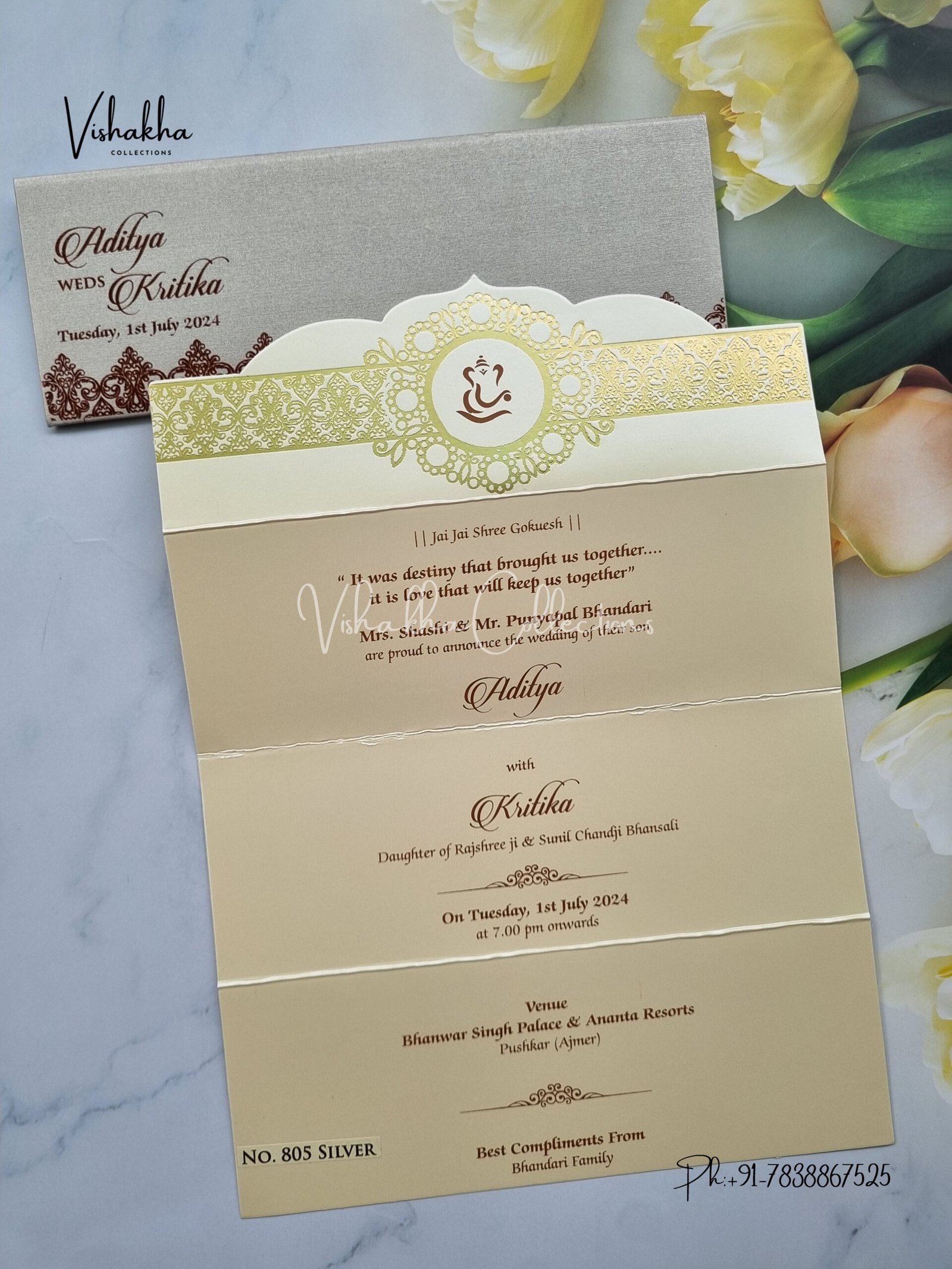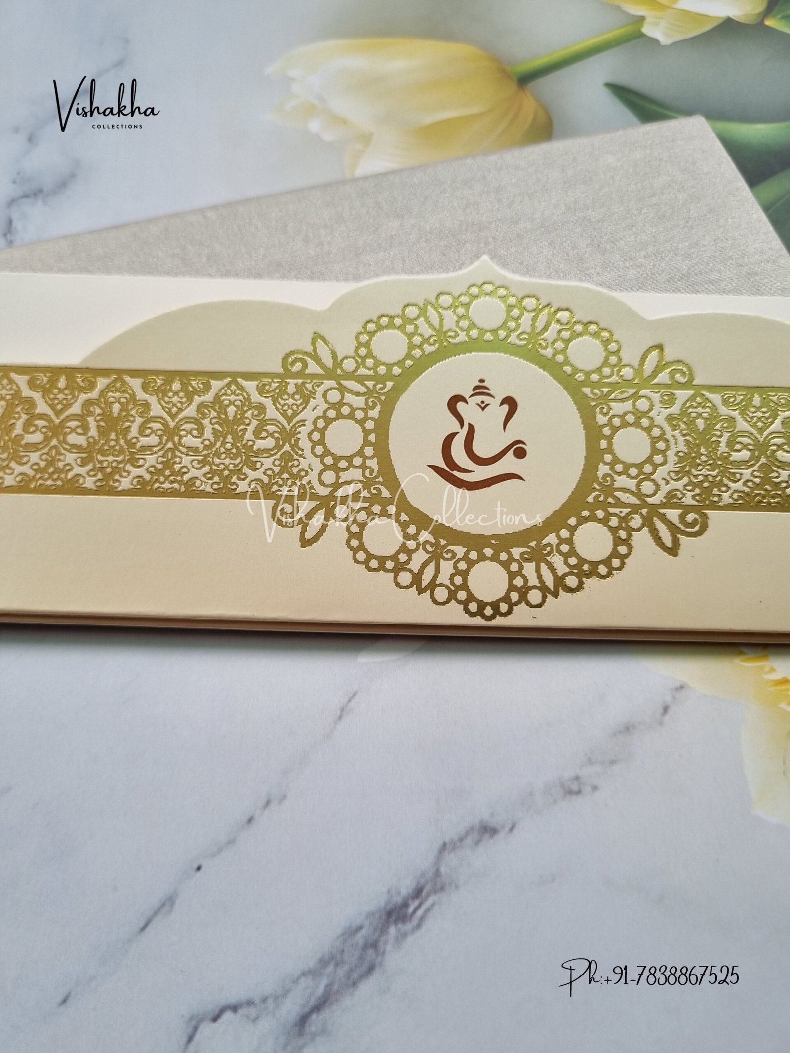 Vishakha Collections presents you beautiful luxury wedding invitation cards with all latest designs and the latest variety. Its just not a wedding invitation card but a beautiful feeling of love and relationship it carries for you. Beautifully printed and packed with a bundle of love. if you like it, dont think again, just go for it.If you are worrying about the quality of the product, send your doubts to us. We are here to help you. If you want in wholesale or bulk, dont forget to contact us.