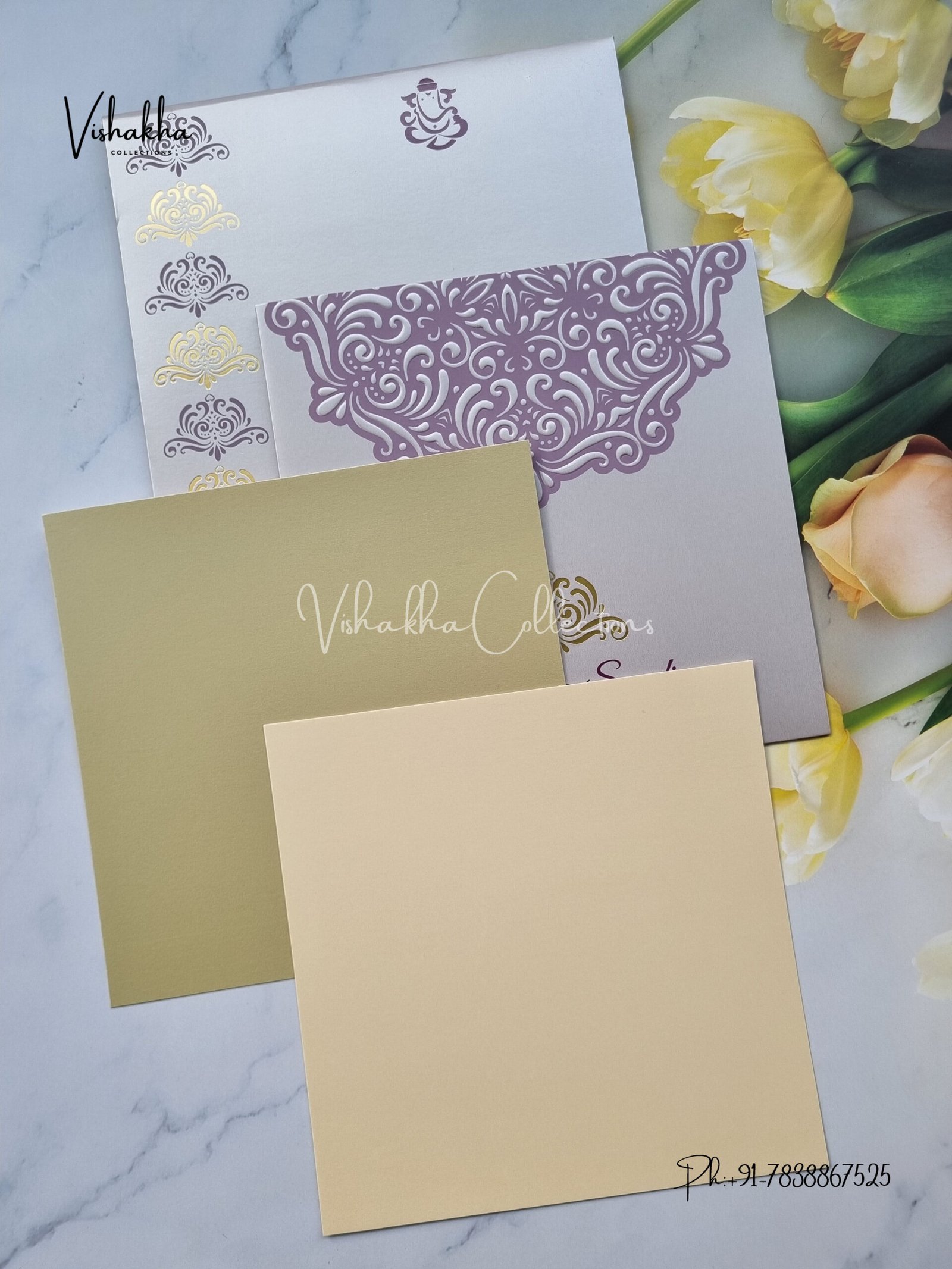 Vishakha Collections presents you beautiful luxury wedding invitation cards with all latest designs and the latest variety. Its just not a wedding invitation card but a beautiful feeling of love and relationship it carries for you. Beautifully printed and packed with a bundle of love. if you like it, dont think again, just go for it.If you are worrying about the quality of the product, send your doubts to us. We are here to help you. If you want in wholesale or bulk, dont forget to contact us.