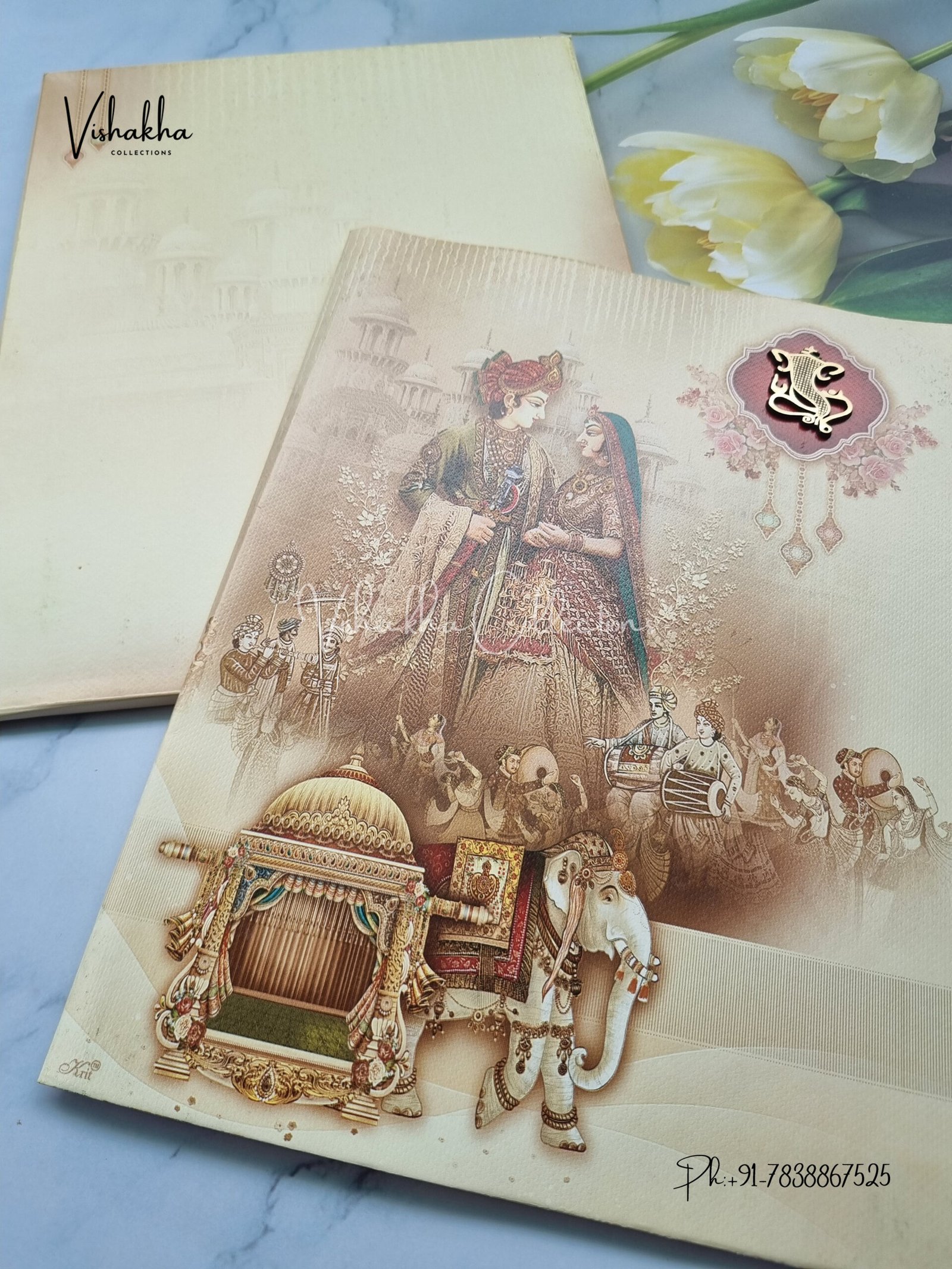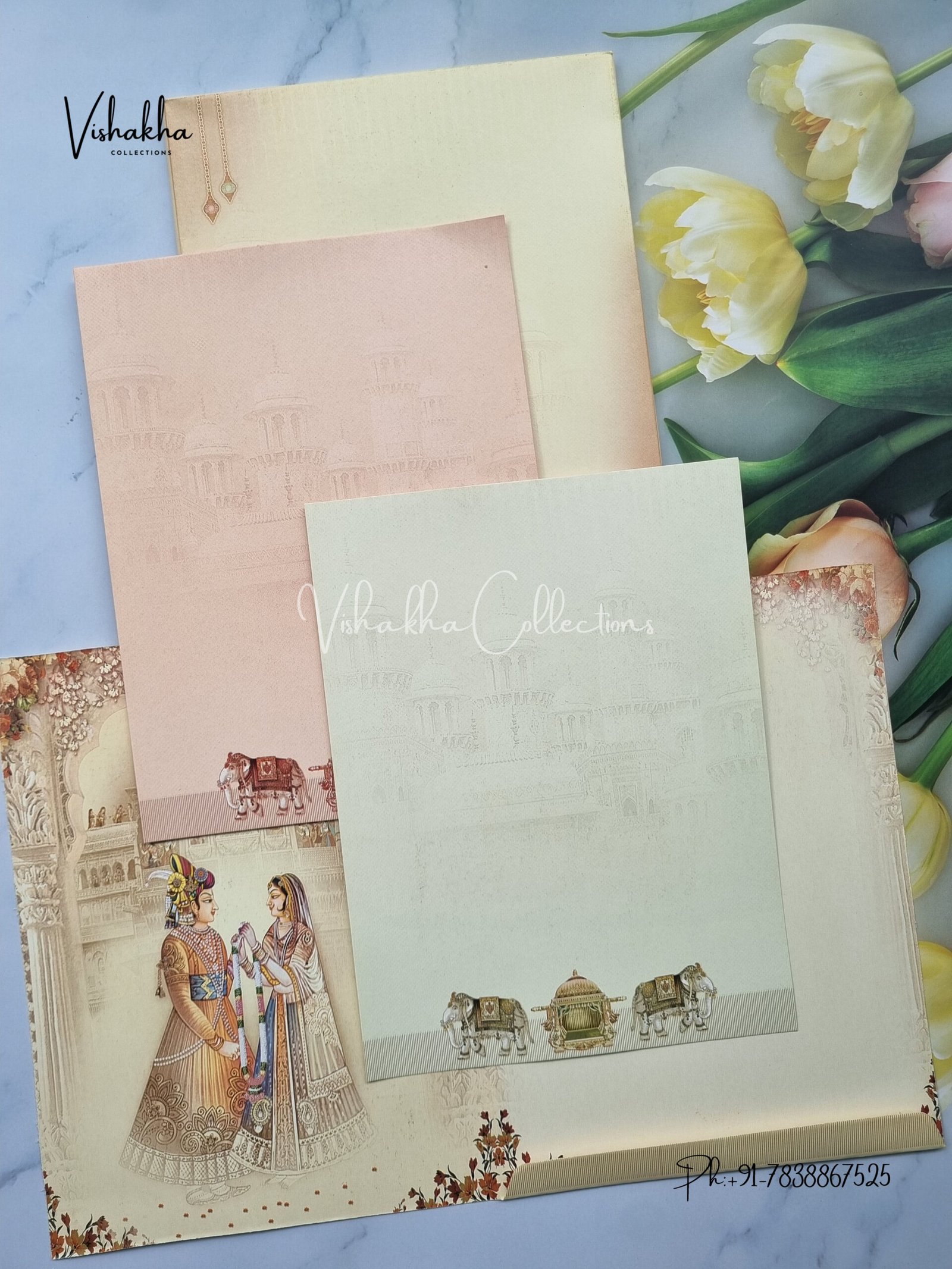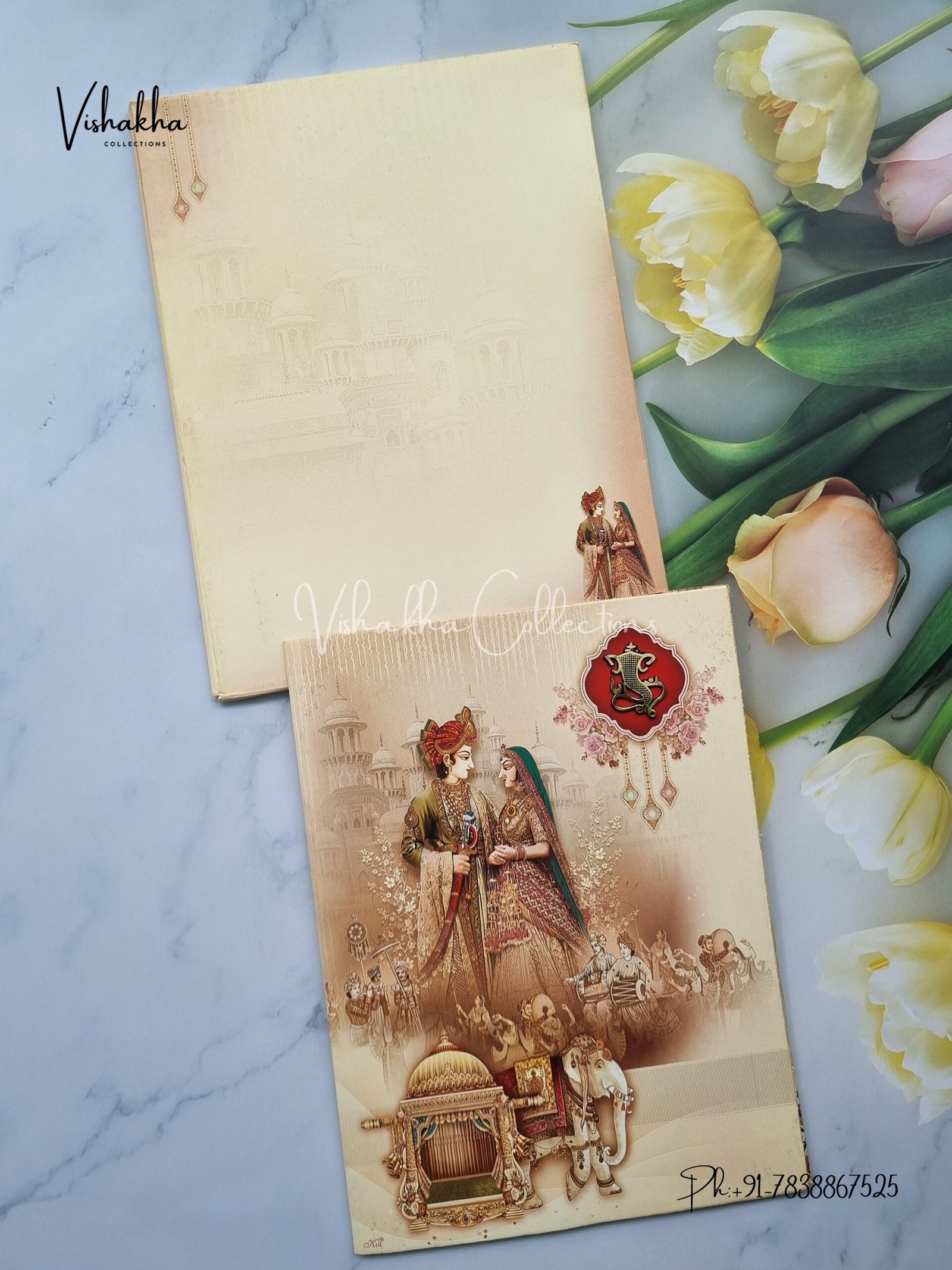 Vishakha Collections presents you beautiful luxury wedding invitation cards with all latest designs and the latest variety. Its just not a wedding invitation card but a beautiful feeling of love and relationship it carries for you. Beautifully printed and packed with a bundle of love. if you like it, dont think again, just go for it.If you are worrying about the quality of the product, send your doubts to us. We are here to help you. If you want in wholesale or bulk, dont forget to contact us.