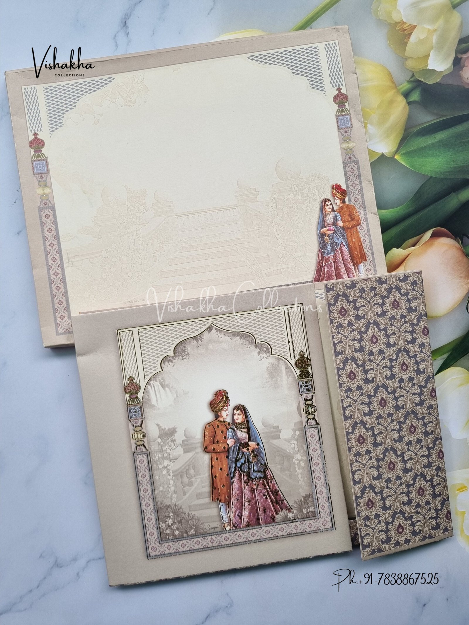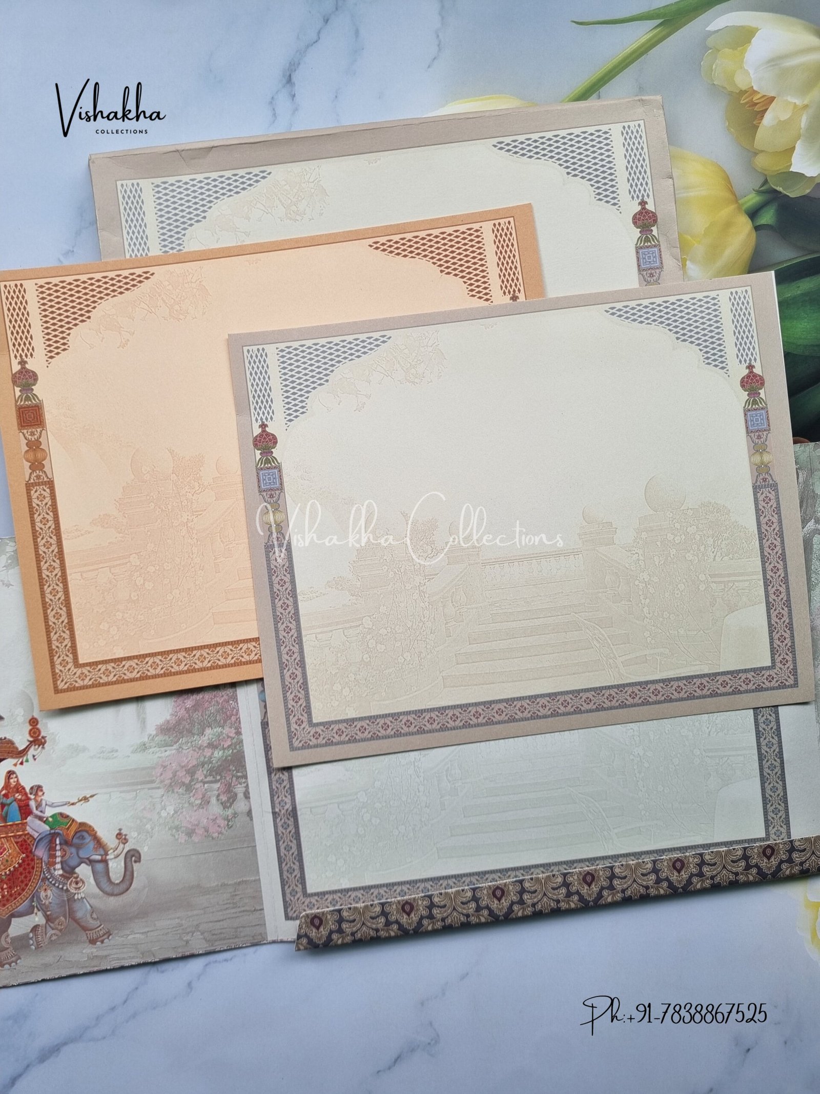 Vishakha Collections presents you beautiful luxury wedding invitation cards with all latest designs and the latest variety. Its just not a wedding invitation card but a beautiful feeling of love and relationship it carries for you. Beautifully printed and packed with a bundle of love. if you like it, dont think again, just go for it.If you are worrying about the quality of the product, send your doubts to us. We are here to help you. If you want in wholesale or bulk, dont forget to contact us.